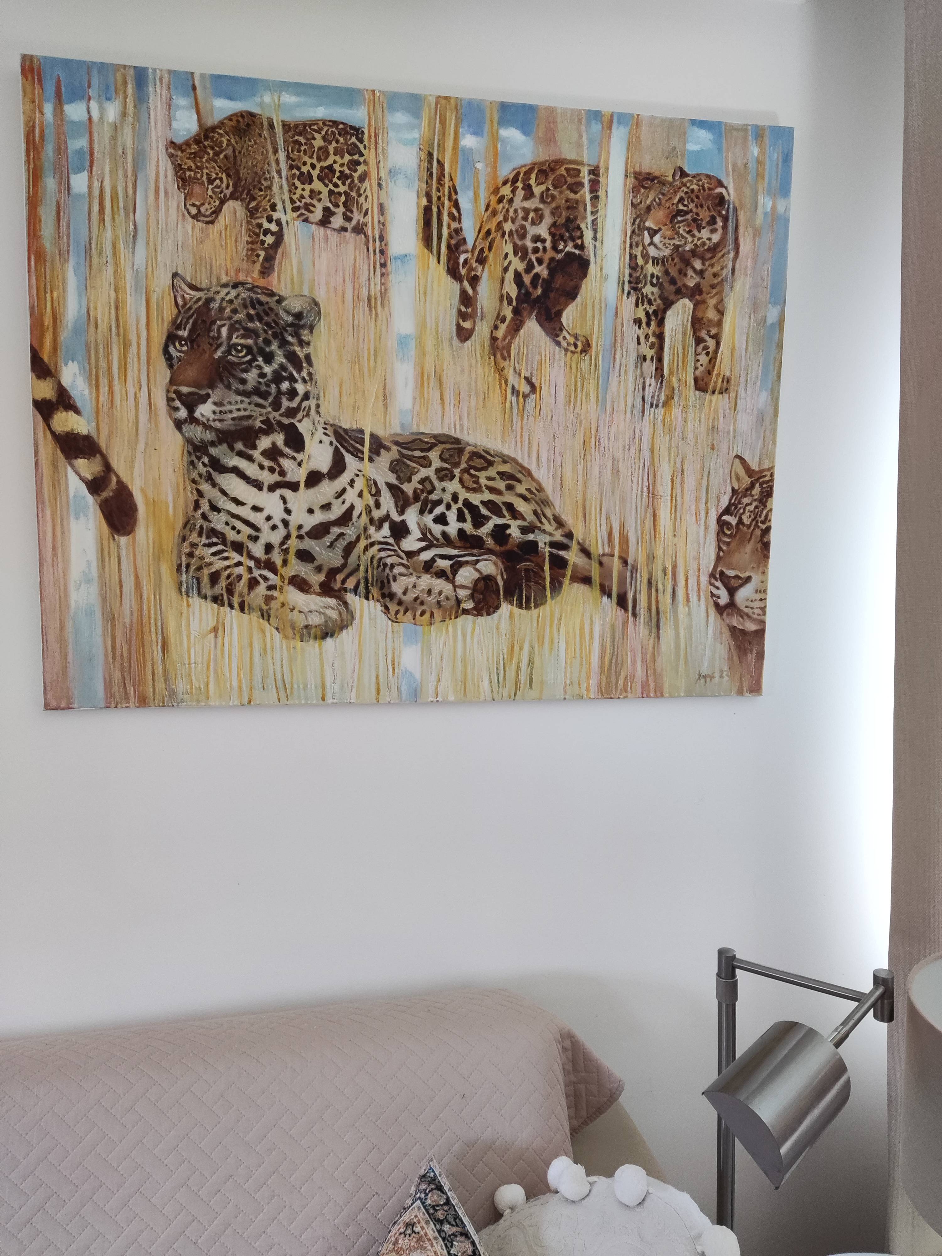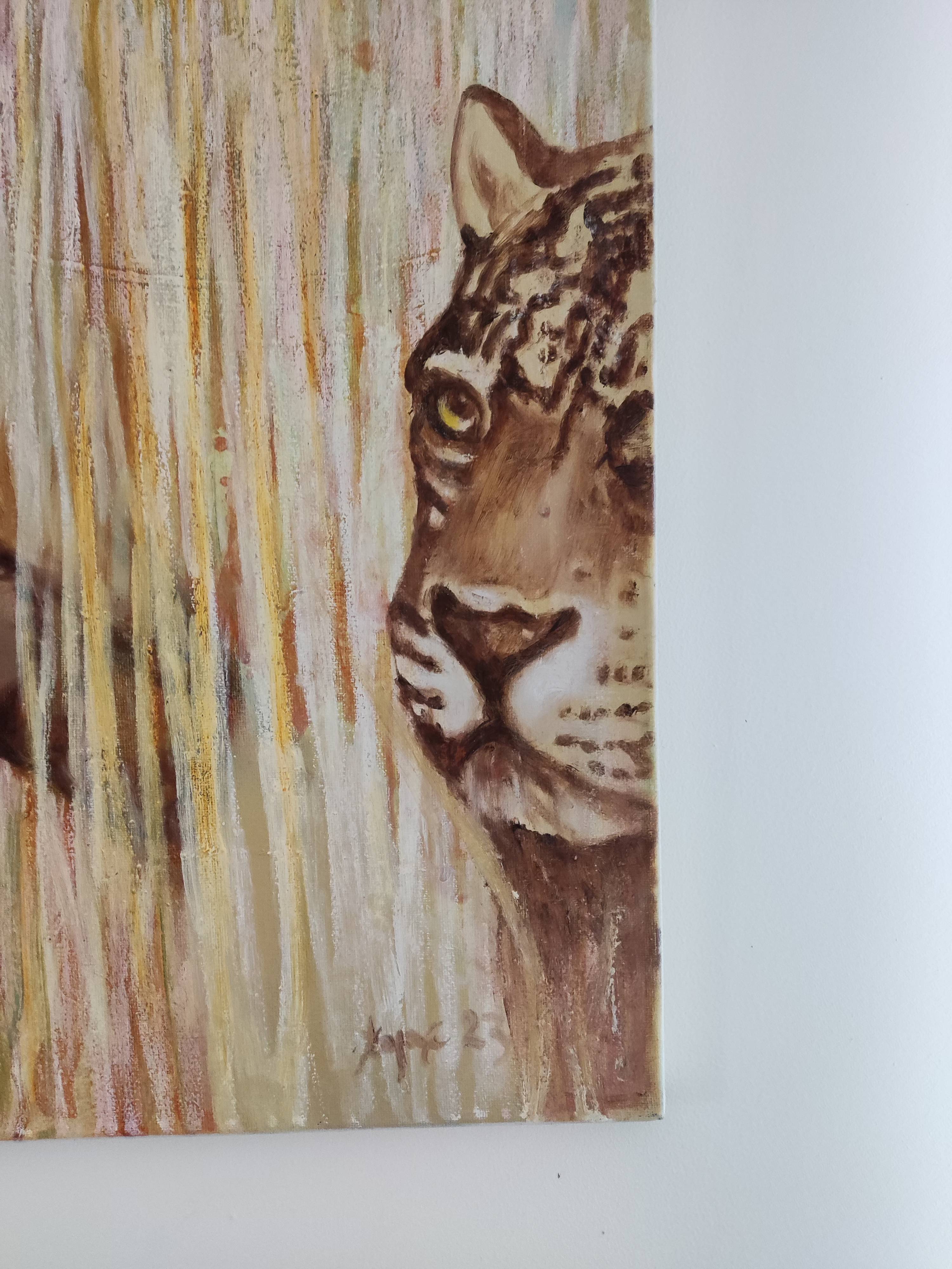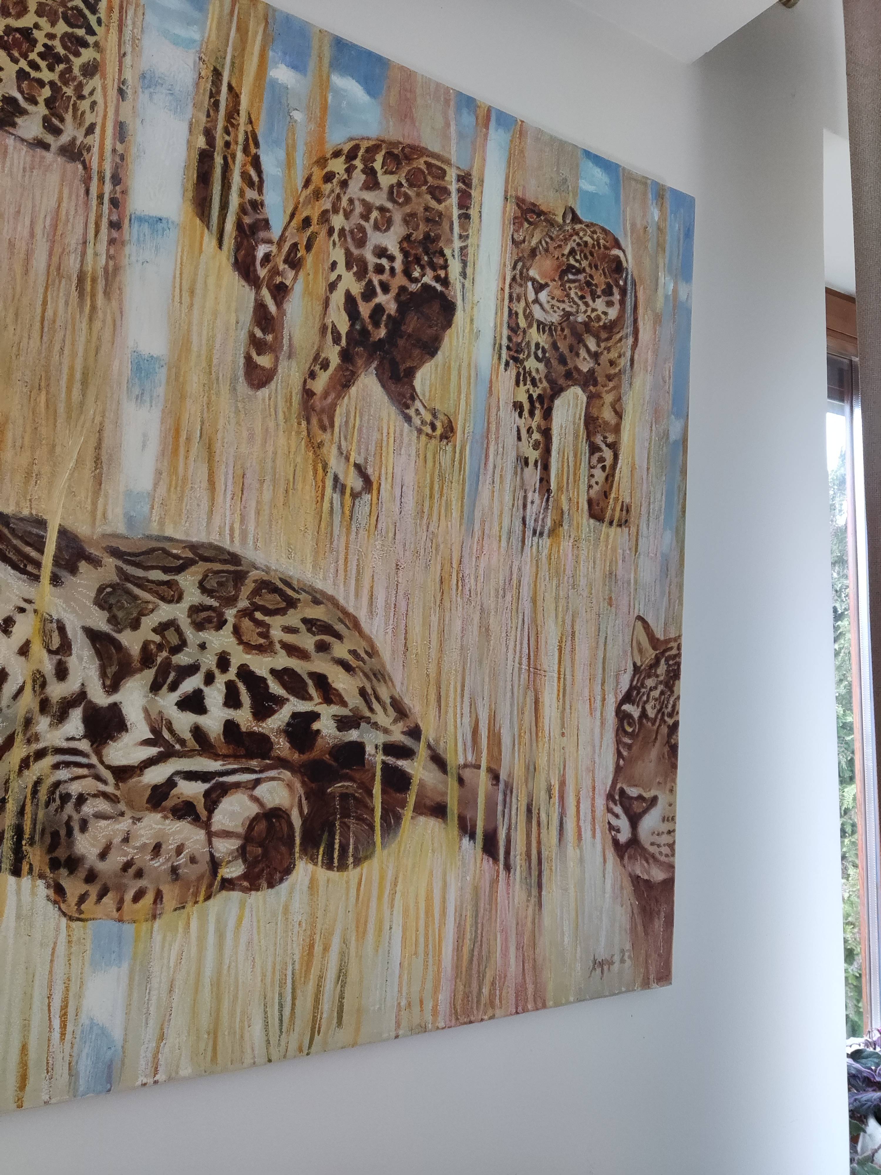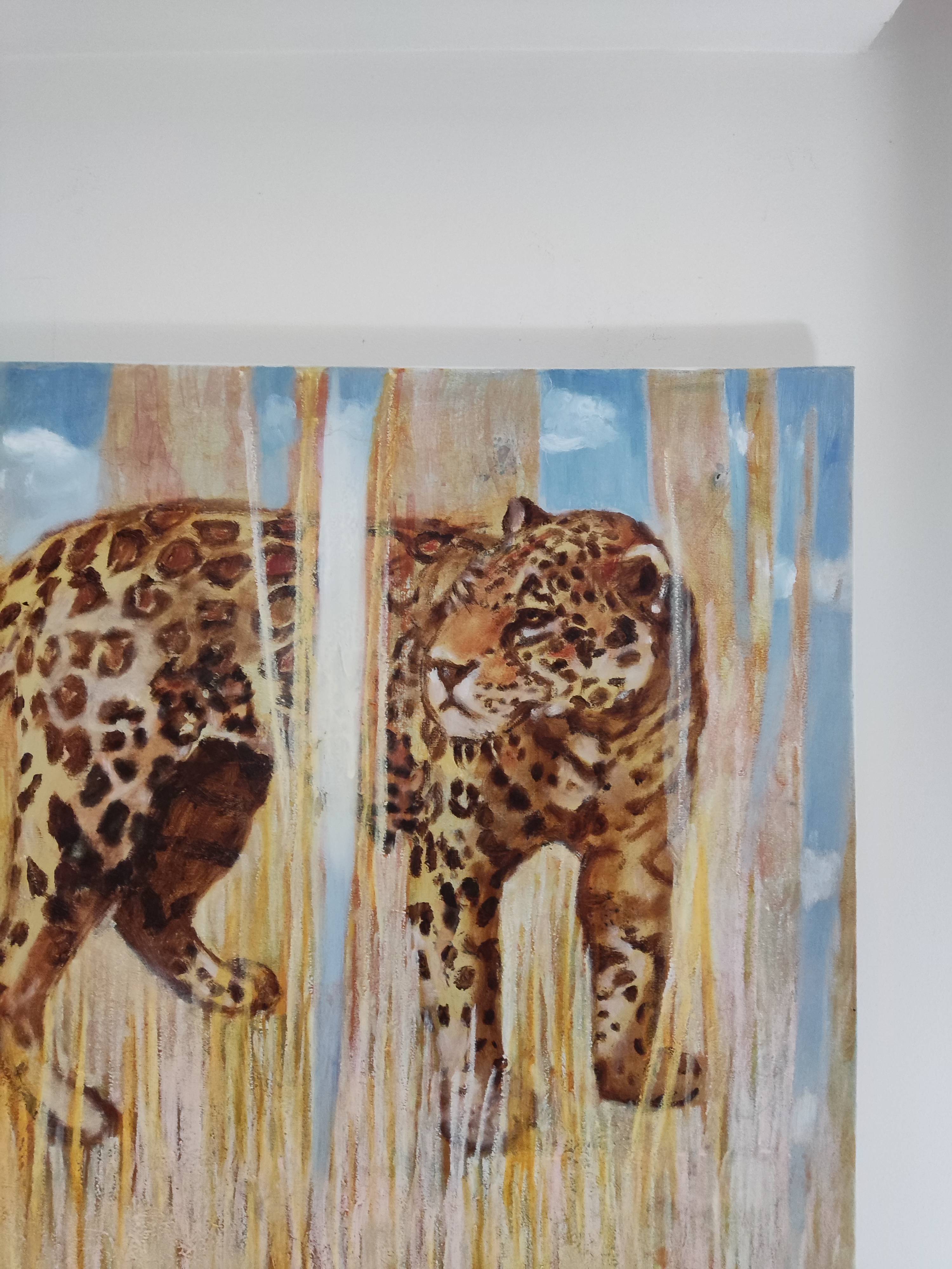 Obraz "Zabawa w chowanego" przedstawia surrealistyczną scenę, w której jaguary odpoczywają wśród wysokich traw sawanny. Widz może dostrzec, że sylwetki tych majestatycznych zwierząt są poprzecinane fragmentami nieba, co sprawia wrażenie, jakby jaguary były częścią krajobrazu, niemal zlewając się z otoczeniem. Ta nierealna kompozycja powoduje, że odbiorca może czuć się zdezorientowany, tracąc poczucie ciągłości i logiki w obserwowanej scenie.