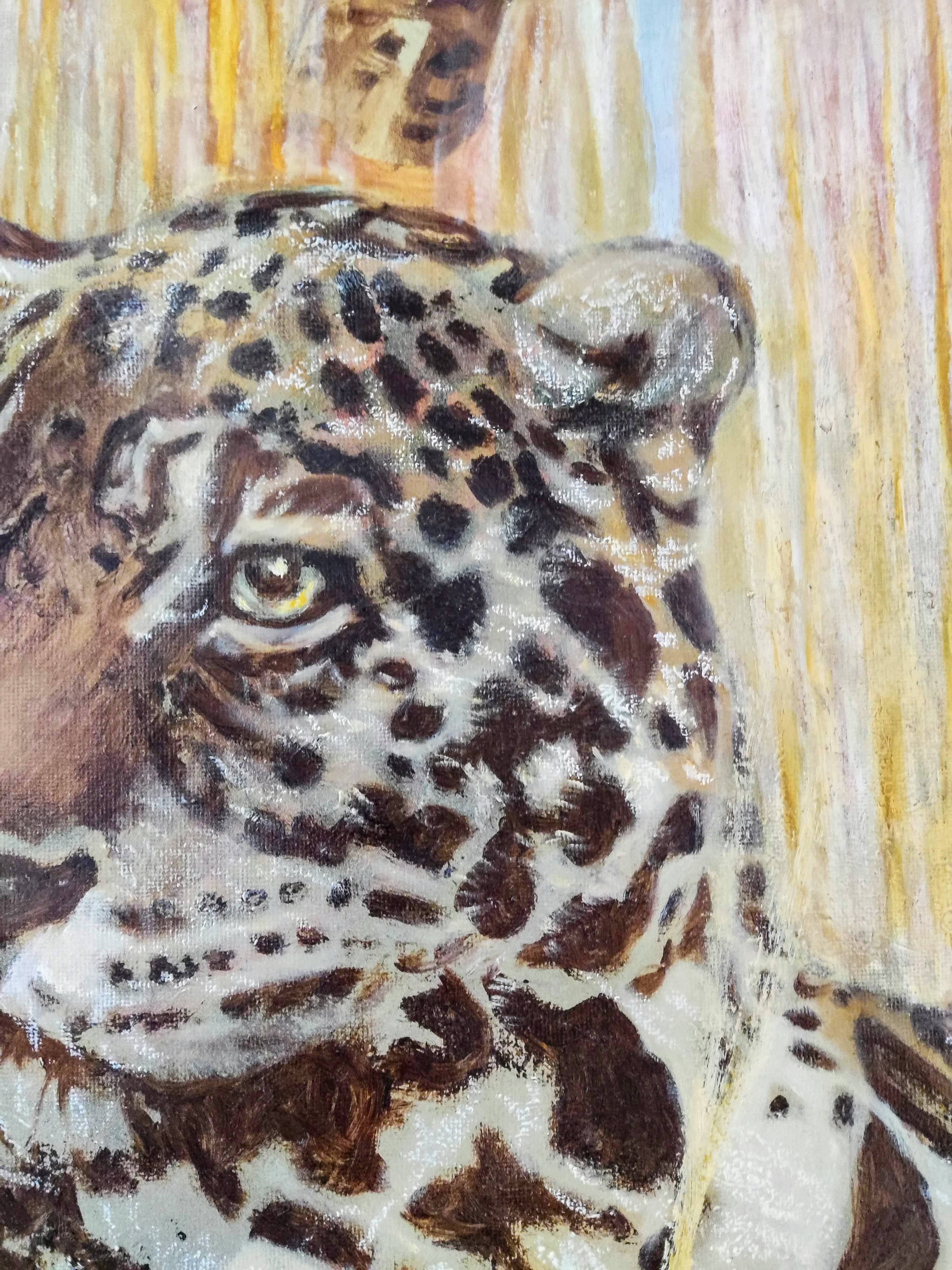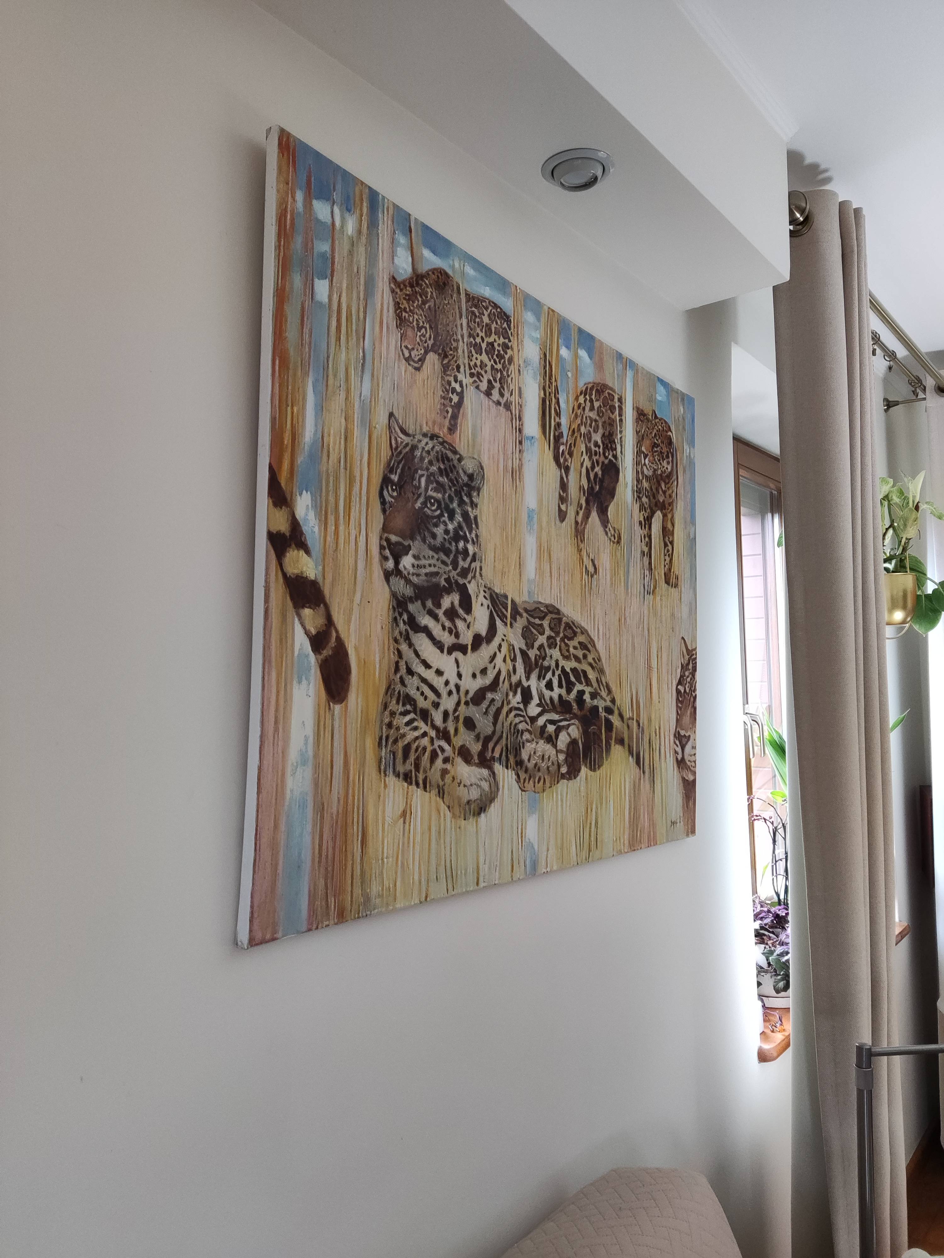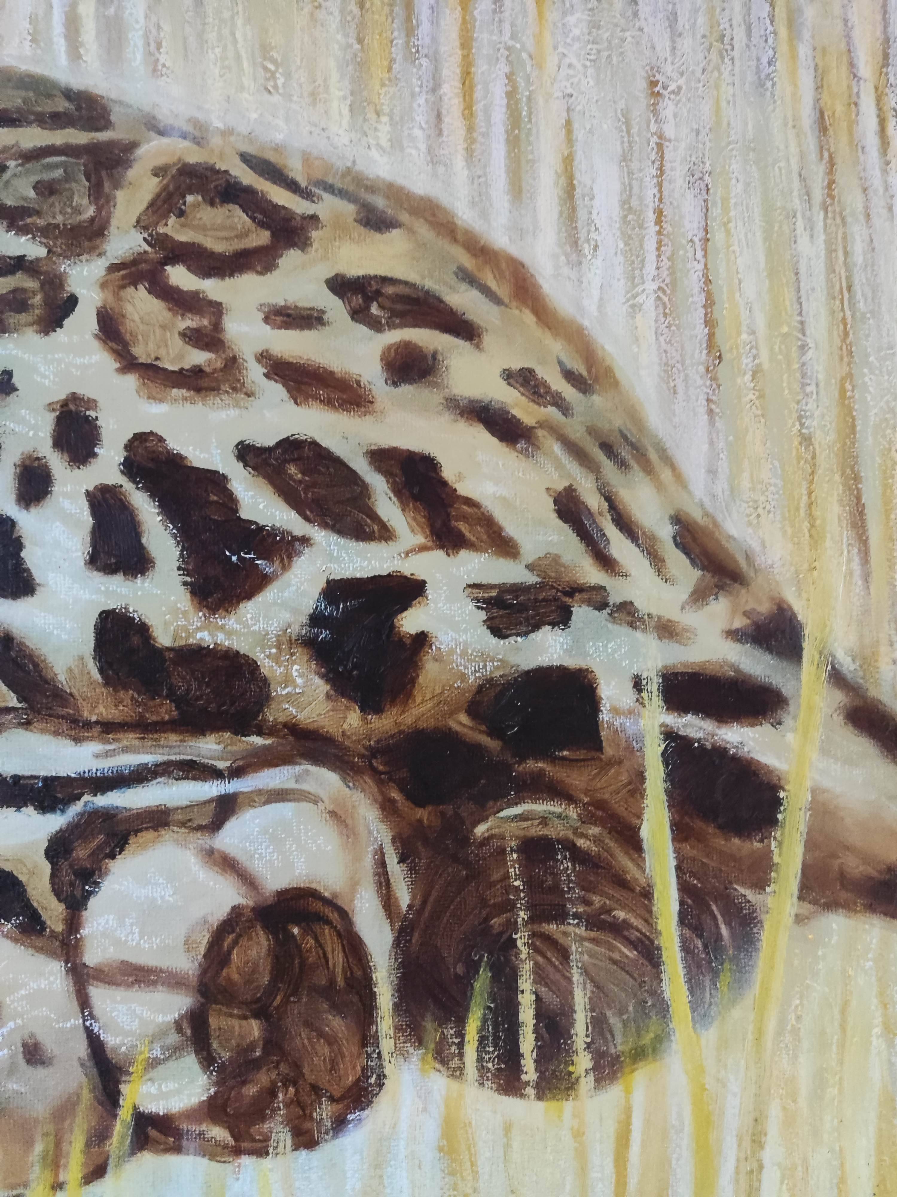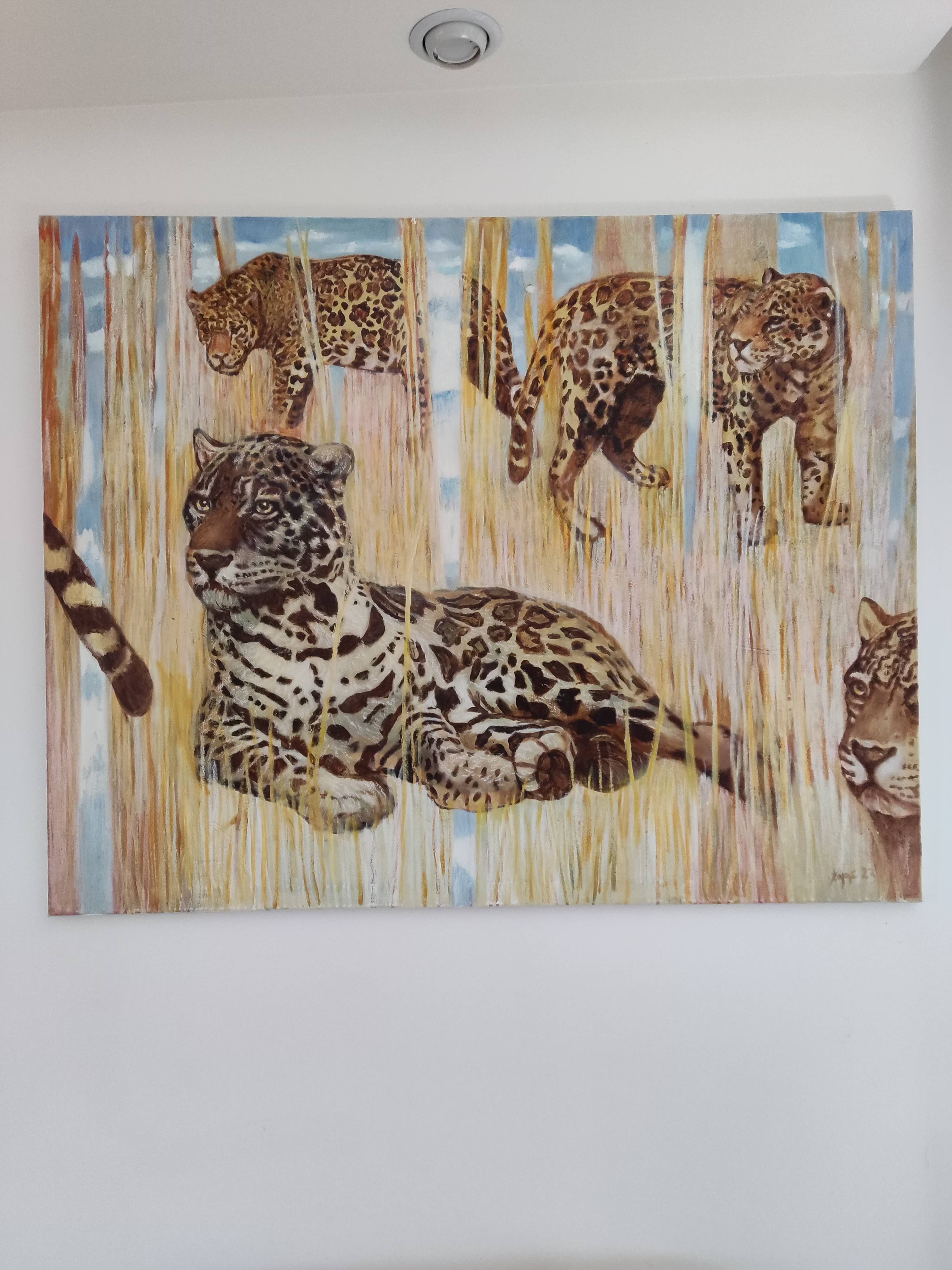 Obraz "Zabawa w chowanego" przedstawia surrealistyczną scenę, w której jaguary odpoczywają wśród wysokich traw sawanny. Widz może dostrzec, że sylwetki tych majestatycznych zwierząt są poprzecinane fragmentami nieba, co sprawia wrażenie, jakby jaguary były częścią krajobrazu, niemal zlewając się z otoczeniem. Ta nierealna kompozycja powoduje, że odbiorca może czuć się zdezorientowany, tracąc poczucie ciągłości i logiki w obserwowanej scenie.