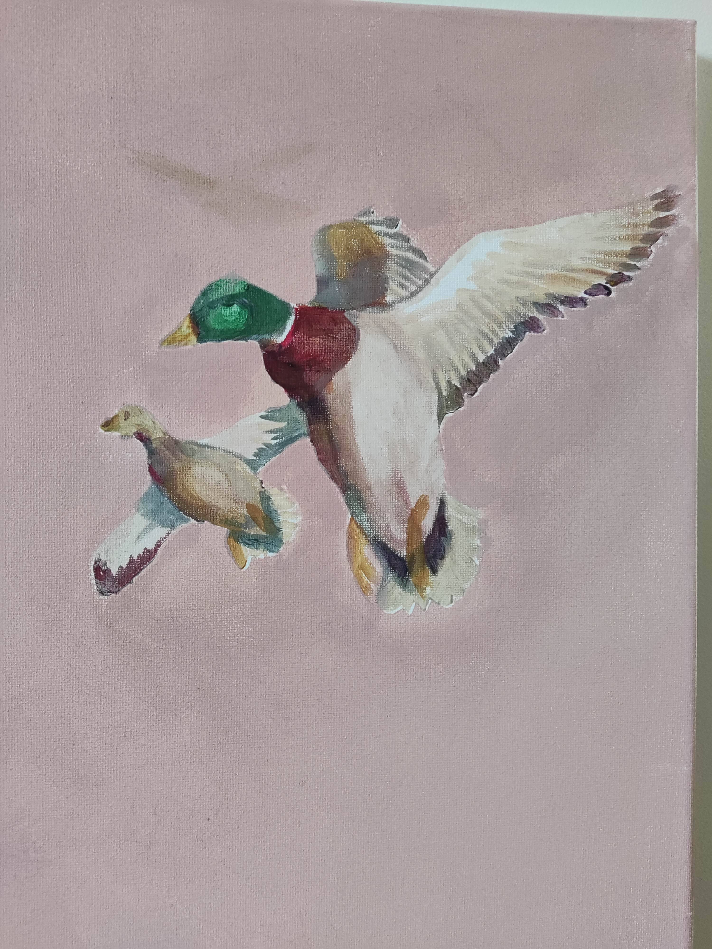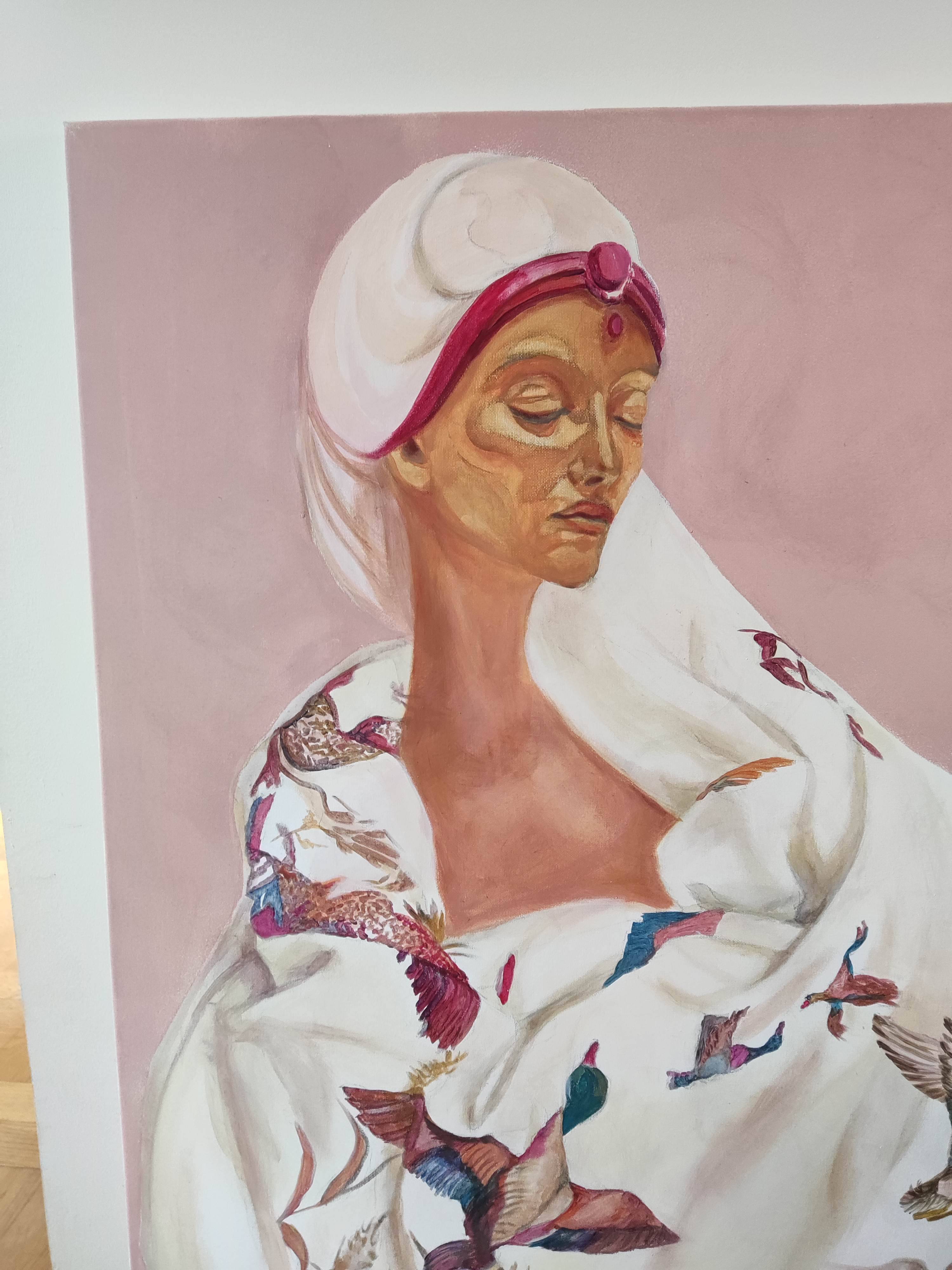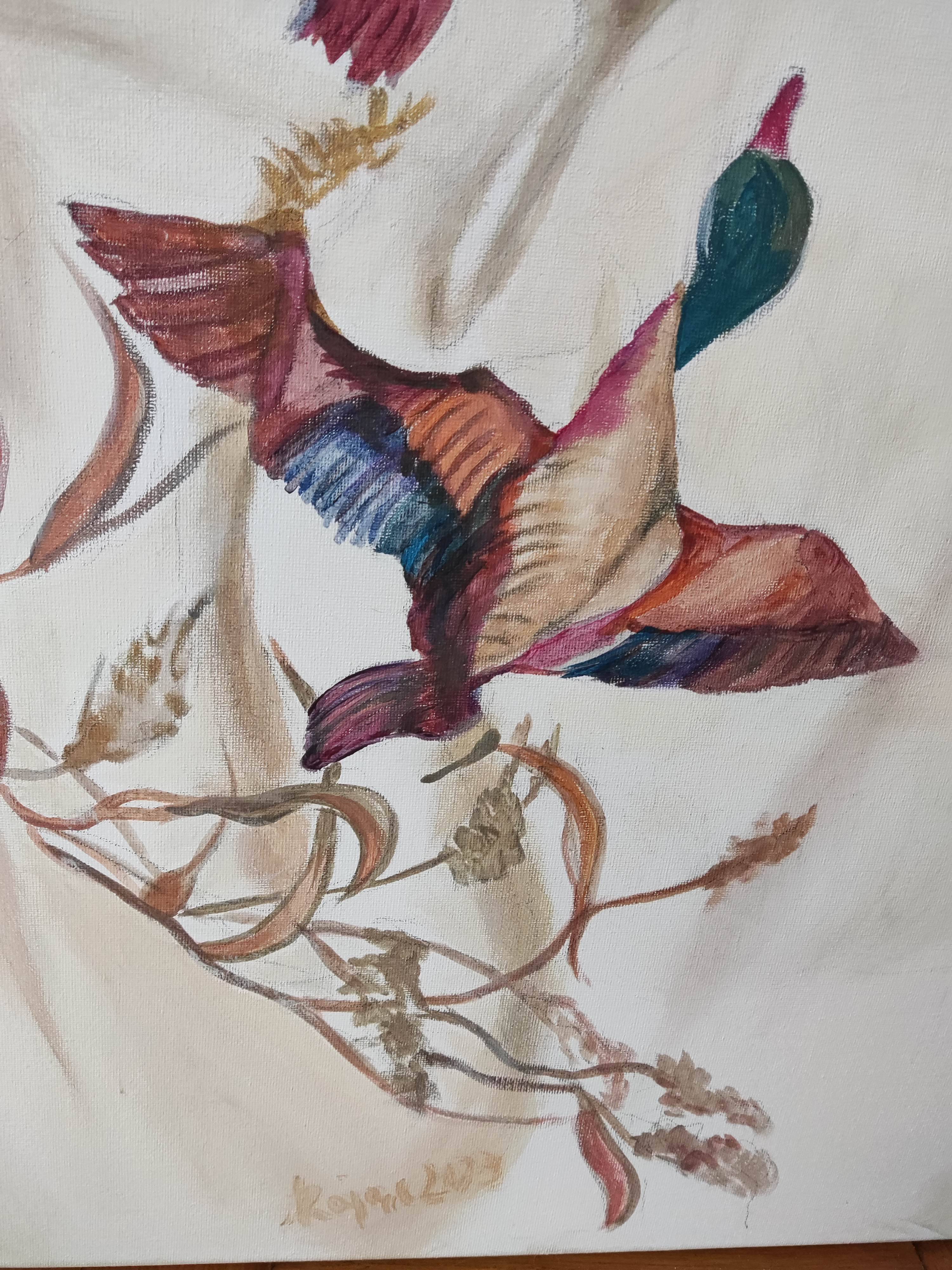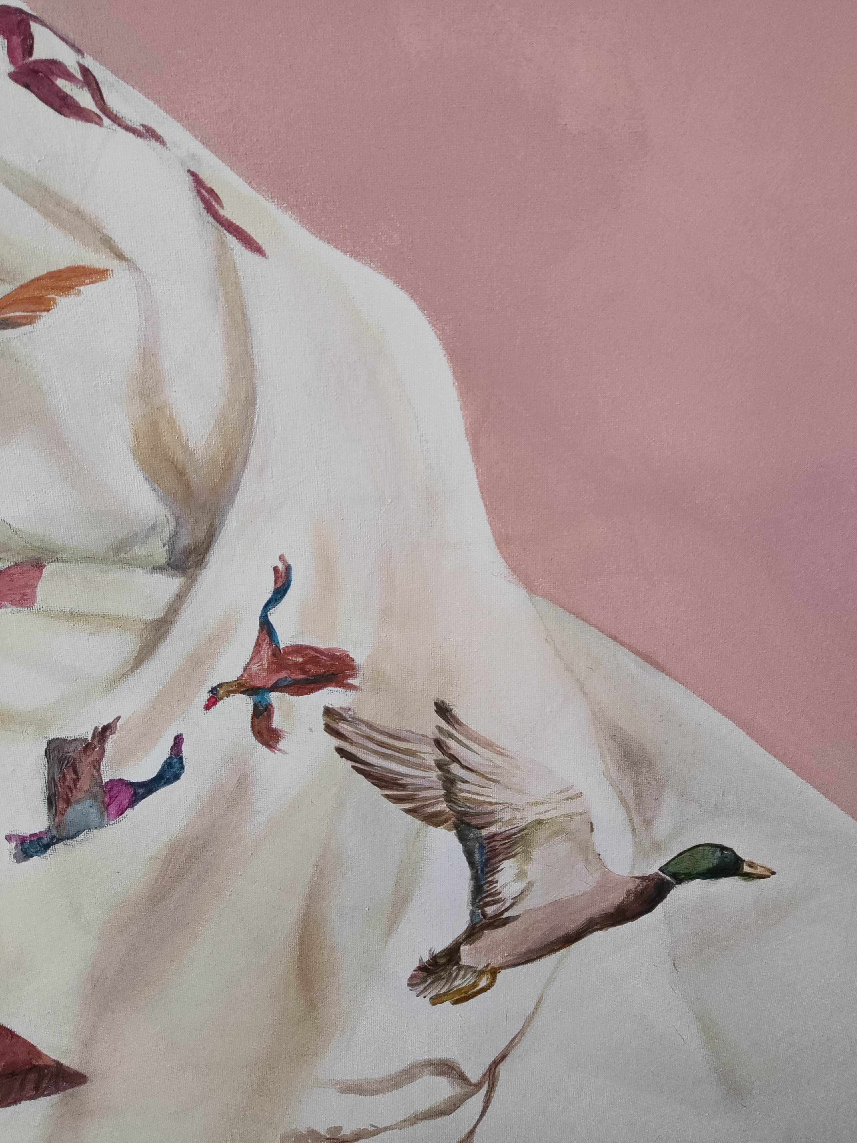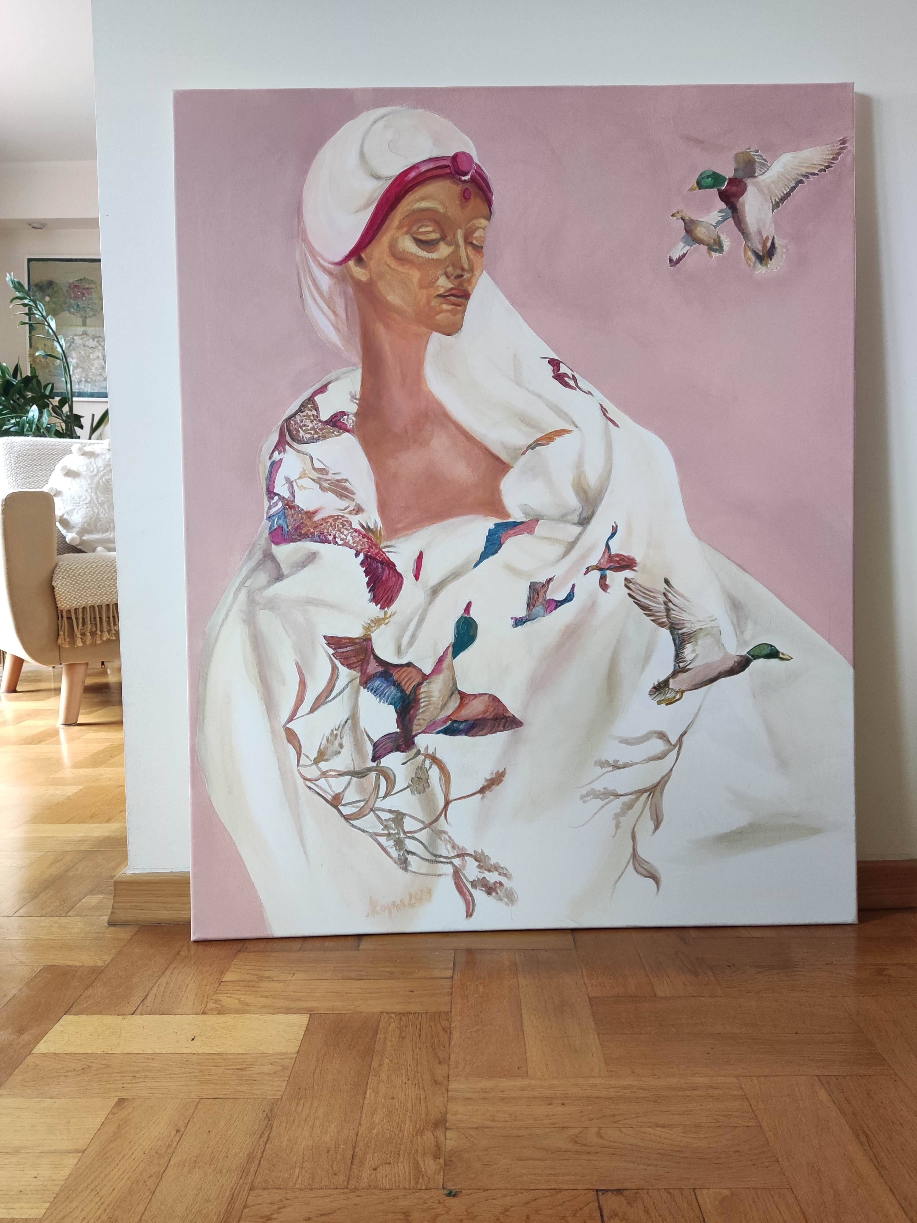 Obraz przedstawia unikalną i surrealistyczną scenę, która zaskakuje swoją oryginalnością i symboliką. Widzimy kobietę ubraną w suknię z wzorem w kaczki. Nad głową kobiety unoszą się kaczki, które wydają się być naturalnym przedłużeniem wzoru z sukni - jakby się z niej uwalniały. Ten surrealistyczny element sugeruje, że kaczki są czymś więcej niż tylko ozdobą stroju. Mogą symbolizować wolność, lekkość, a także związek człowieka z naturą.