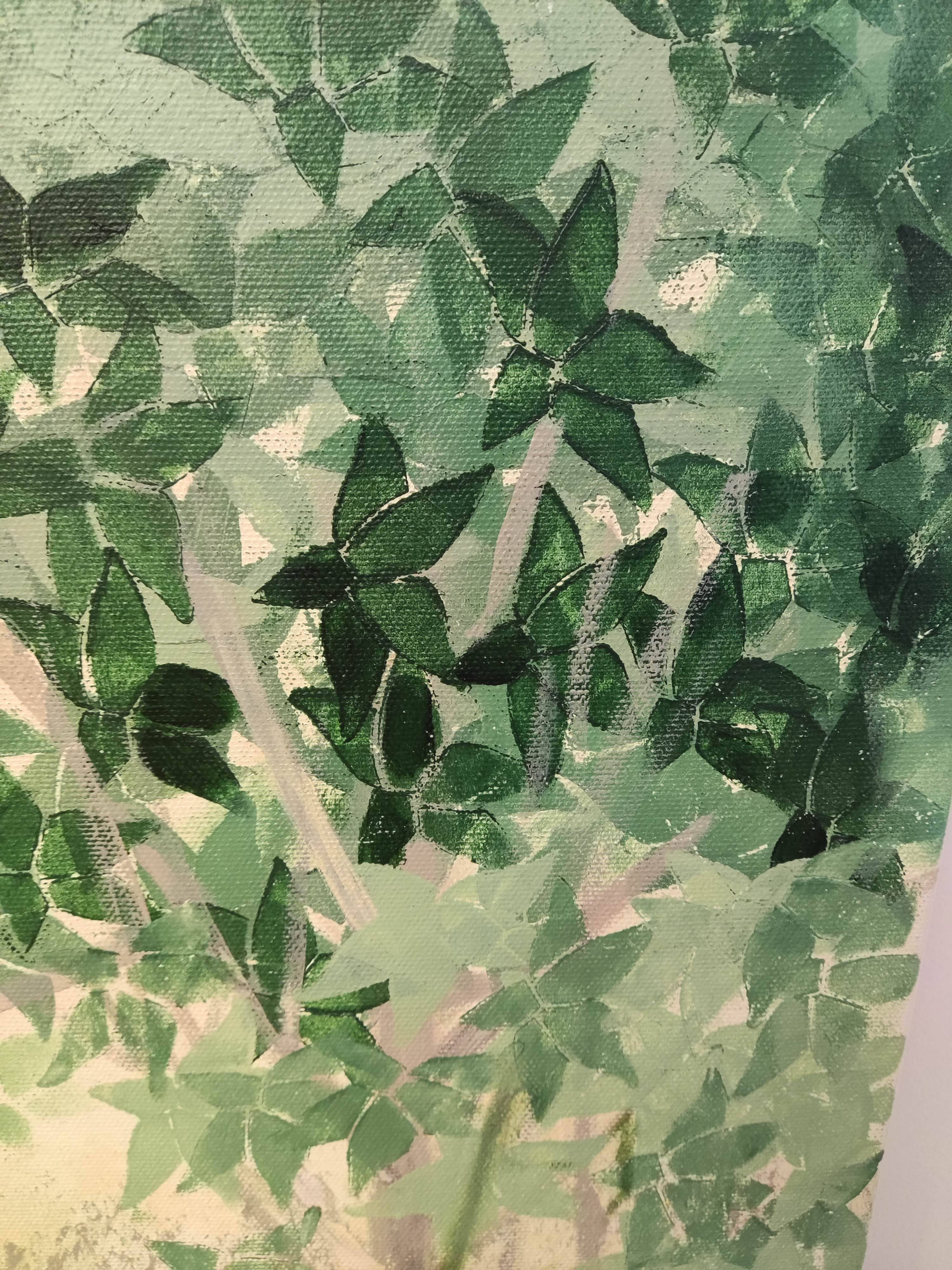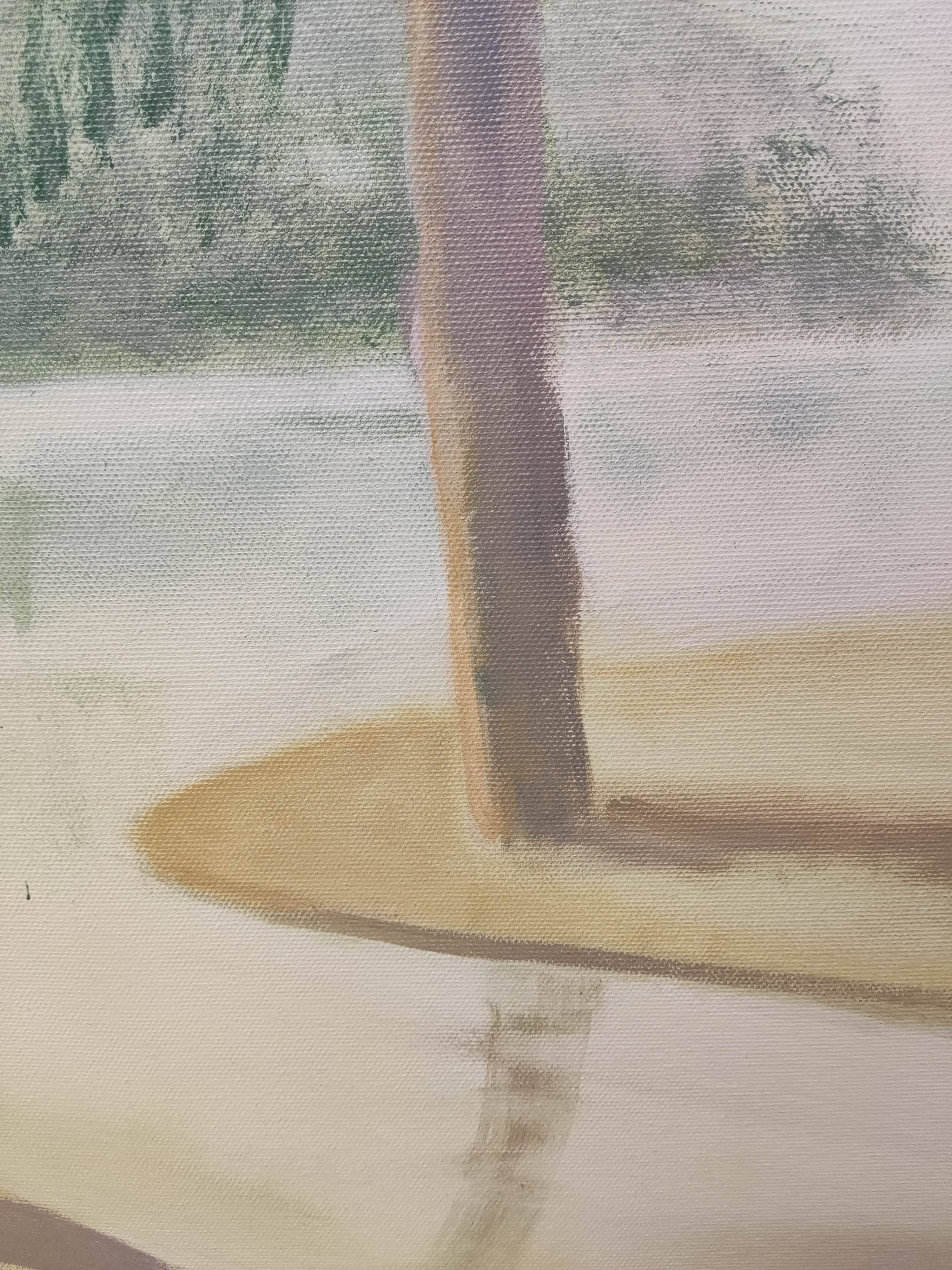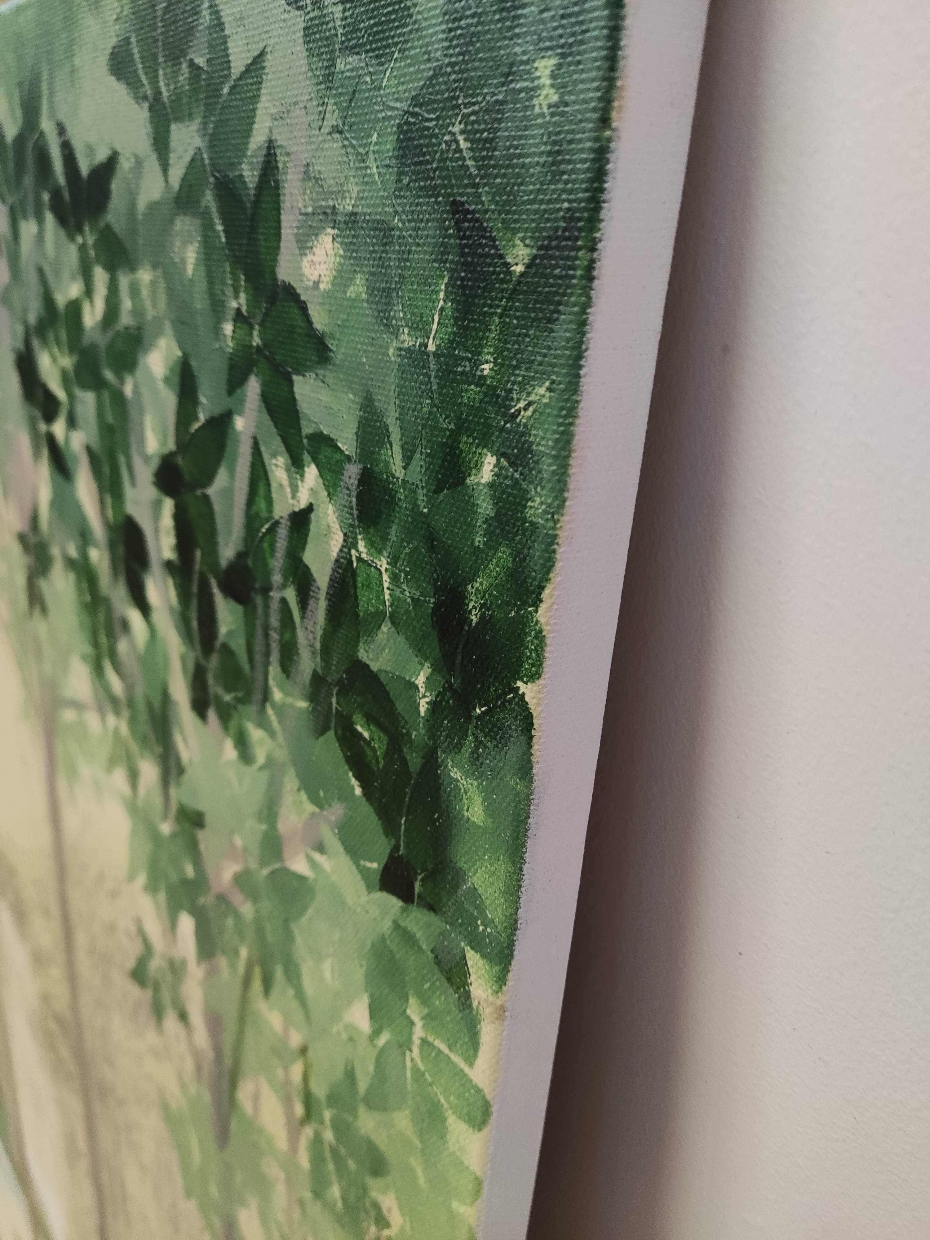 Obraz zatytułowany "Blady Świt" przedstawia spokojny pejzaż, który emanuje subtelnym urokiem świtu. Na pierwszym planie widnieją drzewa w ciepłych, pastelowych odcieniach zieleni, które harmonijnie łączą się z otaczającym je krajobrazem. Ich liście i gałęzie tworzą miękkie, naturalne formy, dodając scenie poczucia spokoju i naturalnego piękna.