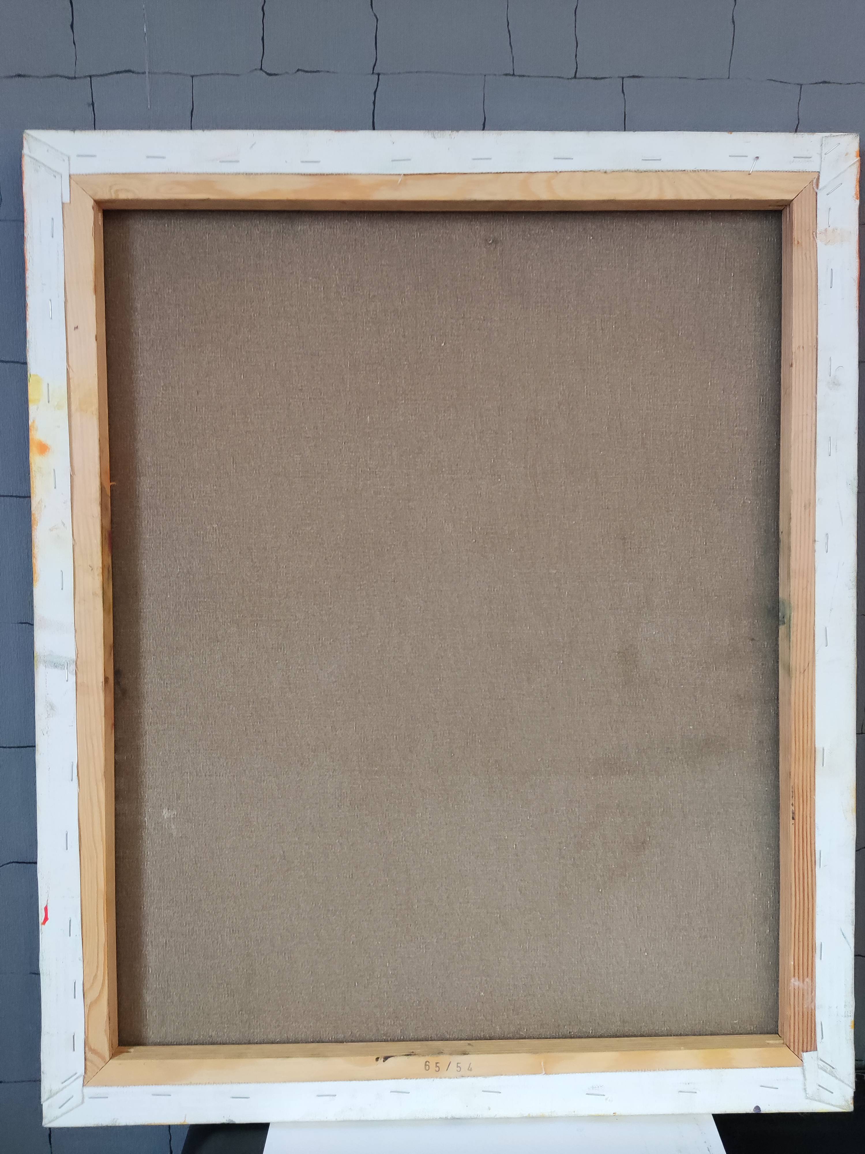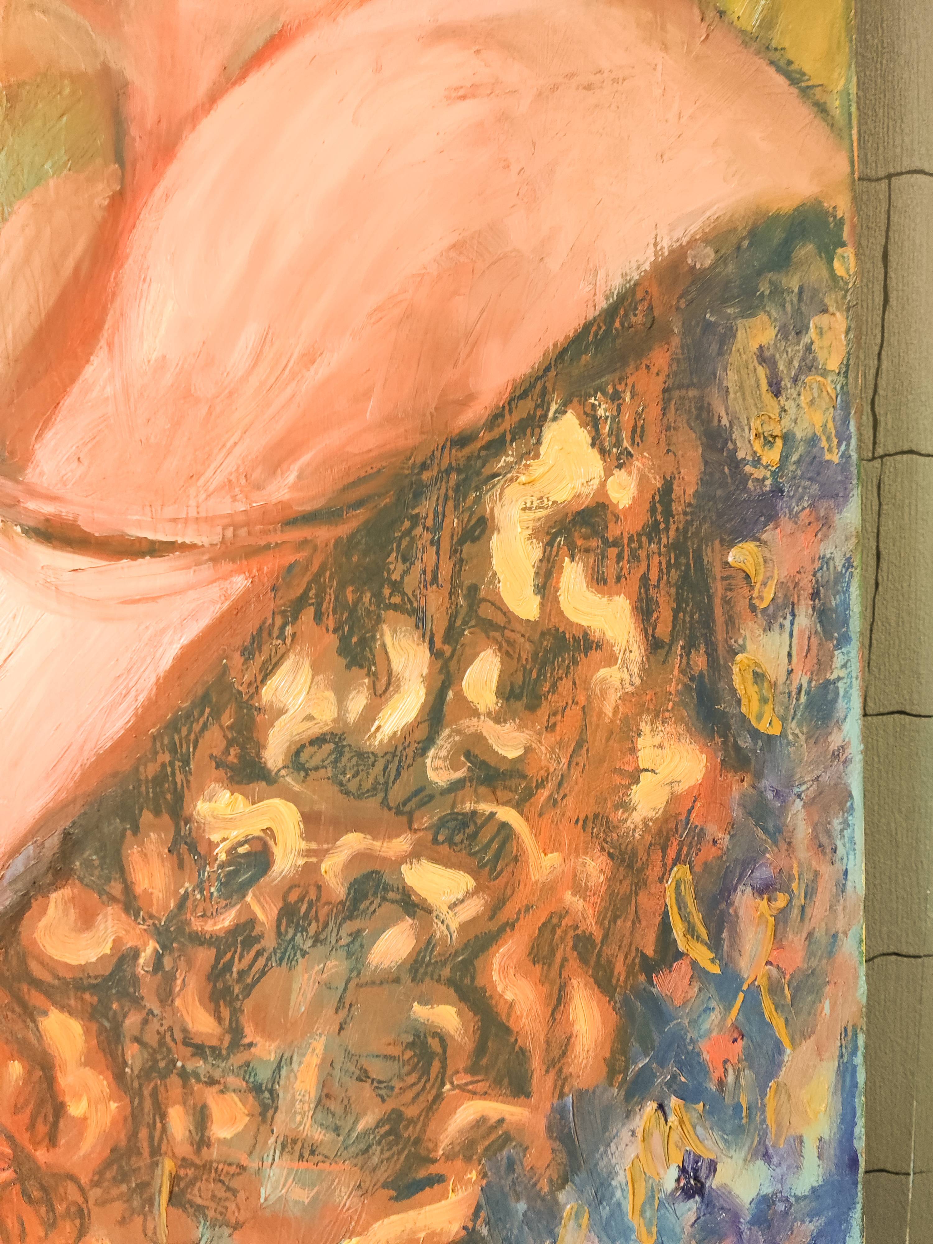 Obraz zatytułowany "Dżet" ukazuje kobietę siedzącą w skulonej pozycji, z nogami przyciągniętymi do piersi. Utrzymany w ciepłych tonach pomarańczy i brązów, tworzy atmosferę romantyzmu i intymności. Kompozycja obrazu jest nasycona subtelnym światłem, które podkreśla kontury postaci, nadając jej niemal eteryczny wygląd.