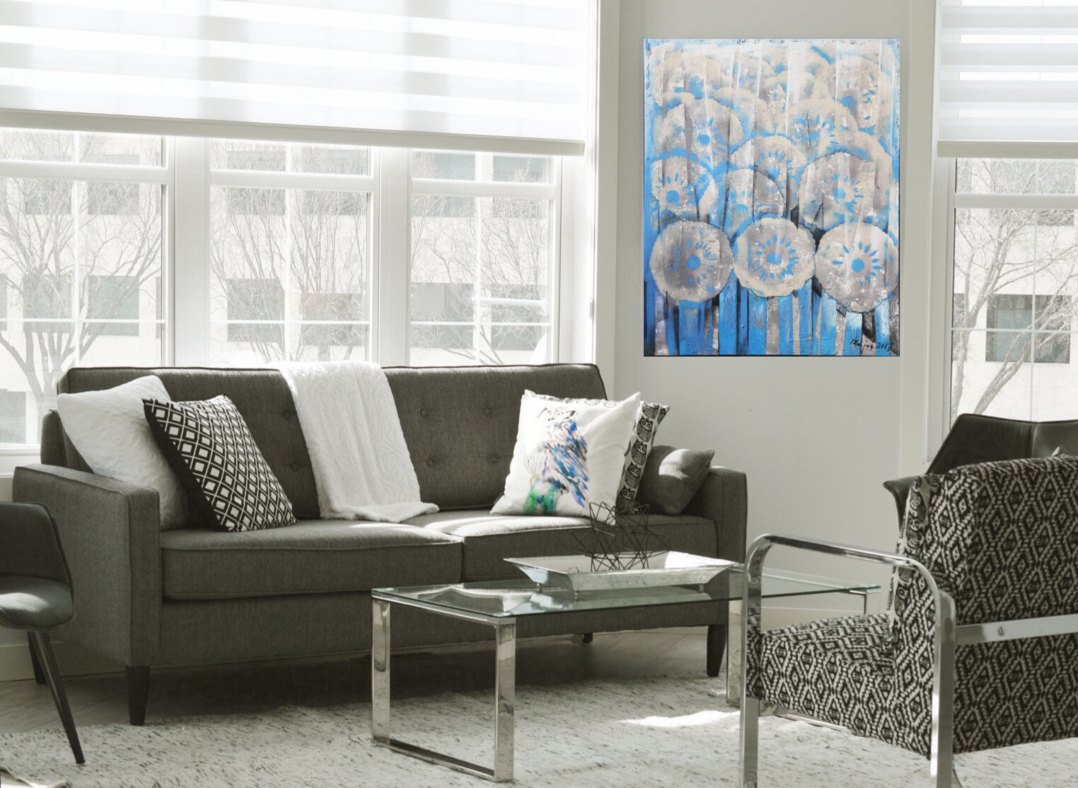 "Echo" to wyjątkowy obraz olejny, który w abstrakcyjny sposób przedstawia pejzaż, przypominający korony drzew wykonane z okrągłych łowickich wycinanek. Drzewa stoją jedno za drugim, tworząc rytmiczny, powtarzalny wzór. Mimo że są do siebie podobne, każde z nich wnosi unikalny element do kompozycji. Kolorystyka obrazu, dominująca w jasnoniebieskich i jasnożółtych tonach, nadaje mu spokojny, a zarazem ciepły charakter, idealnie odzwierciedlający poranną wiosenną aurę.