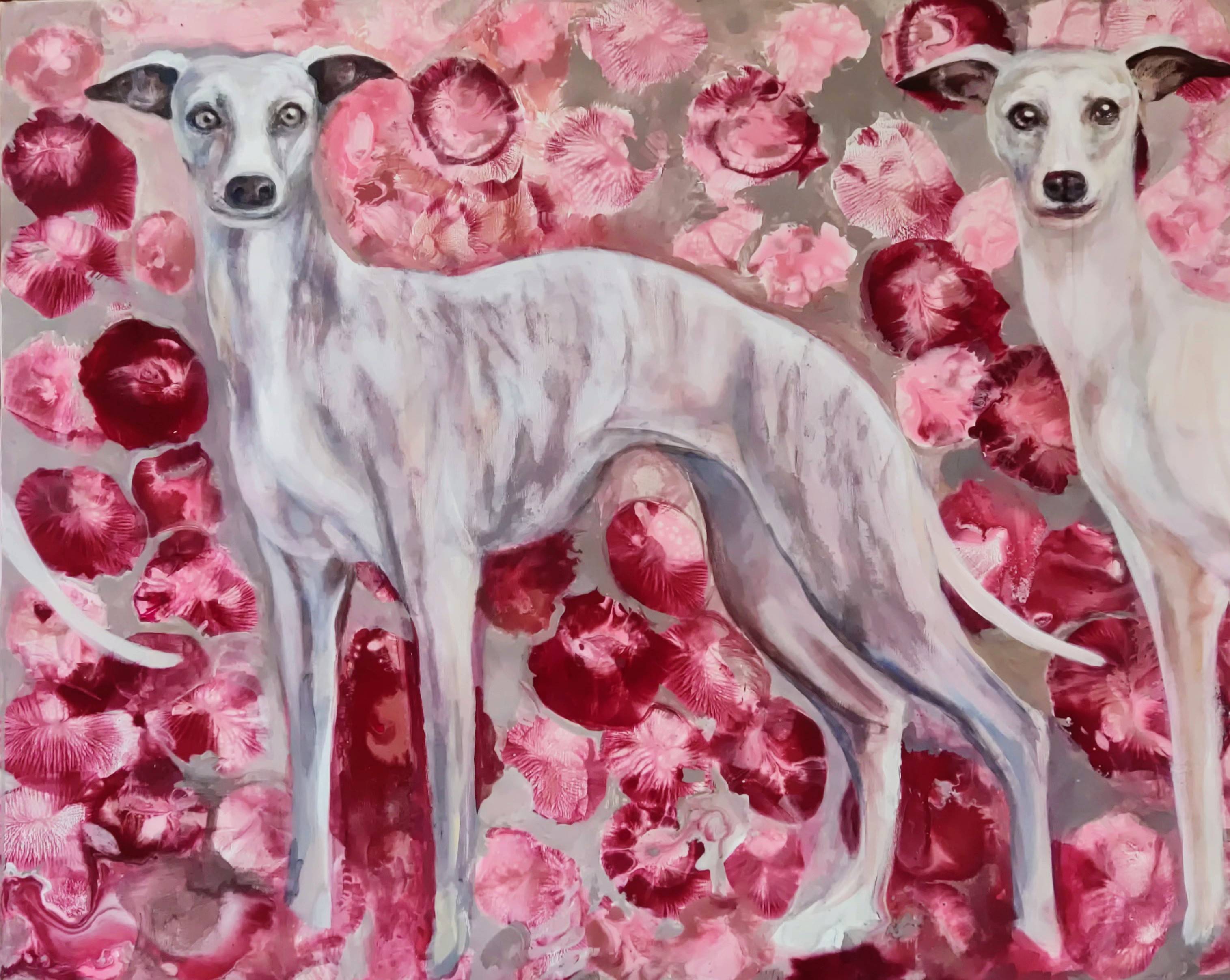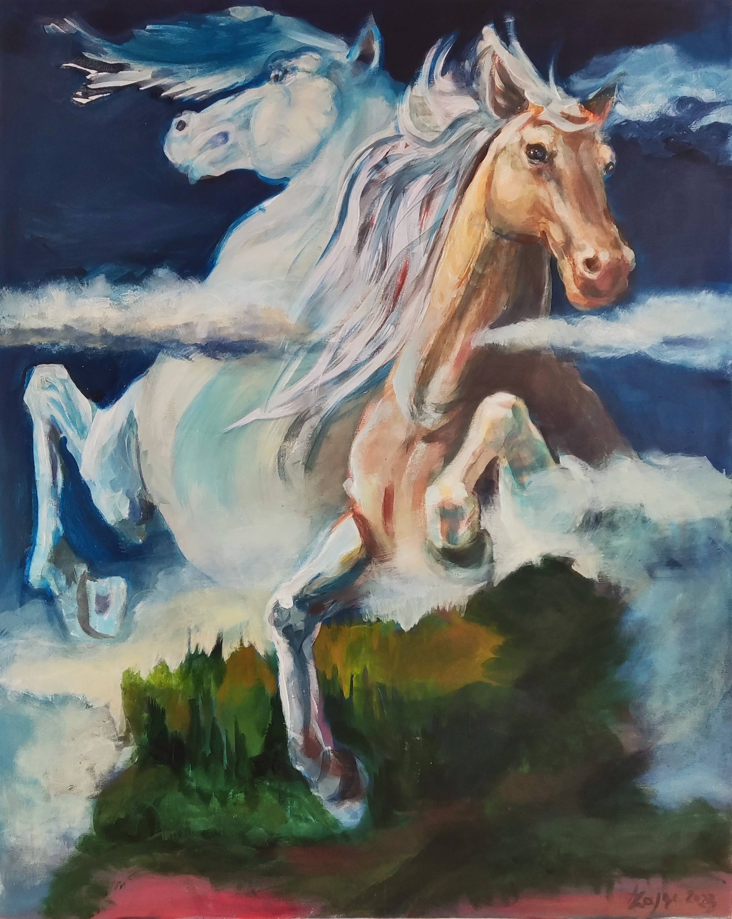 Na obrazie widzimy eteryczną scenę, pełną magii i delikatności. Główna postać to piękna, jasnowłosa kobieta, której włosy opadają miękkimi falami na jej ramiona. Jej postać zdaje się unosić w przestrzeni, jakby płynęła po niebie, które przybrało intensywny, cynobrowy kolor. Obok kobiety, w powietrzu unosi się łabędź. Jego skrzydła są rozpostarte, jakby w tańcu, nadając całej scenie lekkości i gracji. Drugi łabędź znajdujący się na pierwszym planie, otwiera swoje majestatyczne skrzydła, przygotowując się do wzlotu. Jego postawa dodaje kompozycji dynamizmu, kontrastując z unoszącą się spokojnie kobietą i towarzyszącym jej ptakiem. obrazu emanuje atmosferą tajemnicy i spokoju.