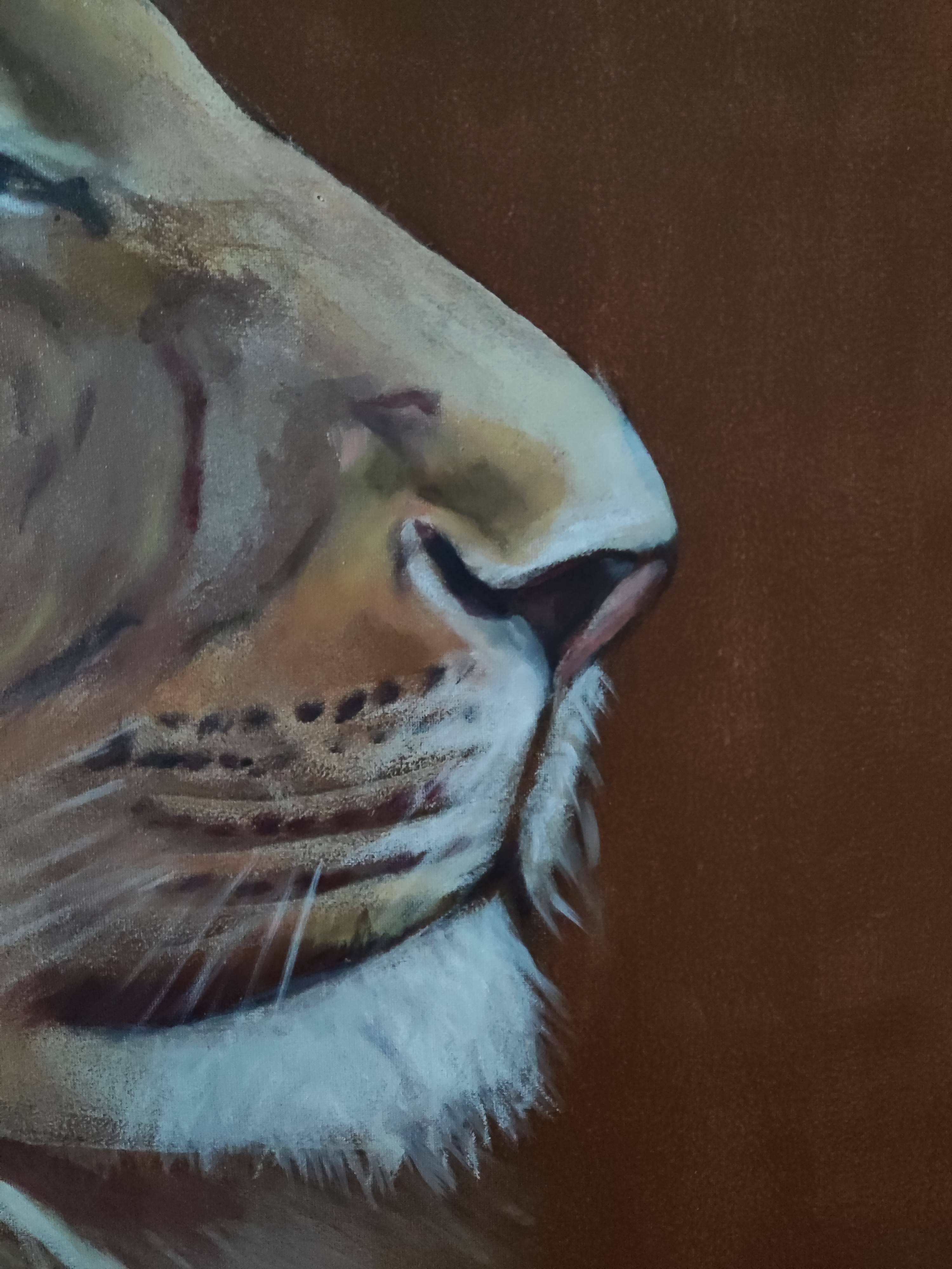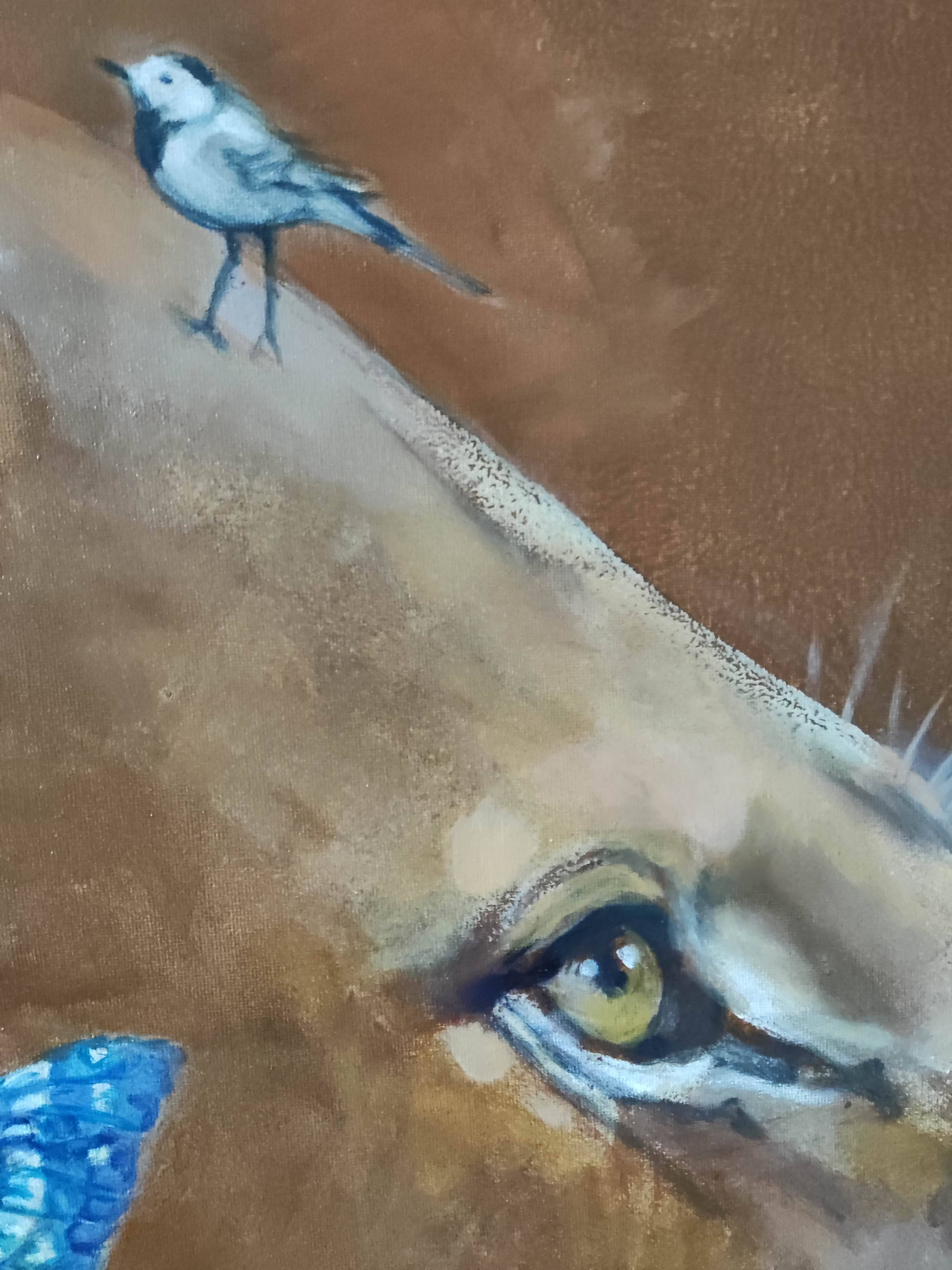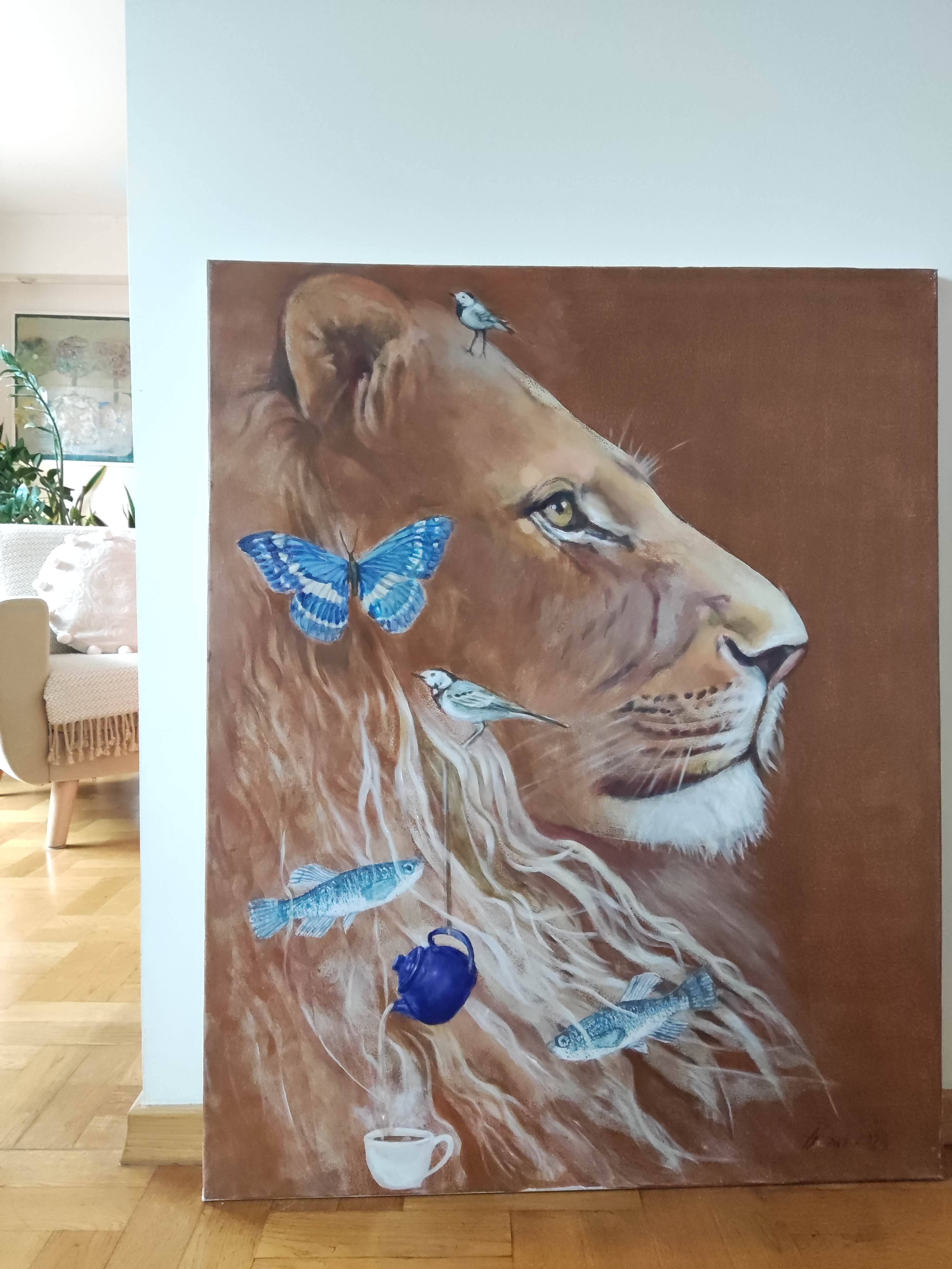 Obraz "Lwie Serce" jest wyjątkowym dziełem sztuki, które przyciąga uwagę zarówno ciepłą kolorystyką, jak i głębokim przekazem. Obraz emanuje ciepłymi brązami, które doskonale współgrają z dopełniającymi błękitami. Te kolory nie tylko nadają obrazowi harmonii, ale również podkreślają jego subtelną symbolikę. Centralną postacią obrazu jest lew, ukazany w łagodnym profilu. Ten wizerunek Króla Zwierząt w jego delikatnej odsłonie stanowi pozorną sprzeczność, która skłania do refleksji nad prawdziwą naturą odwagi i siły. Delikatność, zrozumienie, akceptacja i łagodność, które emanują z postaci lwa, nie są oznakami słabości. Wręcz przeciwnie, są świadectwem świadomej decyzji, by postrzegać i reagować na świat z empatią i współczuciem. Taki sposób bycia zakłada, że rzeczywistość, mimo jej surowości i brutalności, może być również miejscem piękna, harmonii i spokoju. Obraz "Lwie Serce" przypomina, że prawdziwa siła leży w umiejętności zachowania łagodności w obliczu trudności i konfliktów. To przesłanie stawia pytanie: czy można napić się herbatki z wrogiem? Ta retoryczna kwestia zaprasza nas do zastanowienia się nad możliwością budowania mostów porozumienia i wybaczenia. Może właśnie w tym tkwi największa odwaga i siła – w zdolności do poszukiwania wspólnego języka i tworzenia harmonii nawet tam, gdzie wydaje się to niemożliwe. Obraz "Lwie Serce" jest więc nie tylko wizualnym arcydziełem, ale także głęboką medytacją nad esencją człowieczeństwa i prawdziwej mocy.