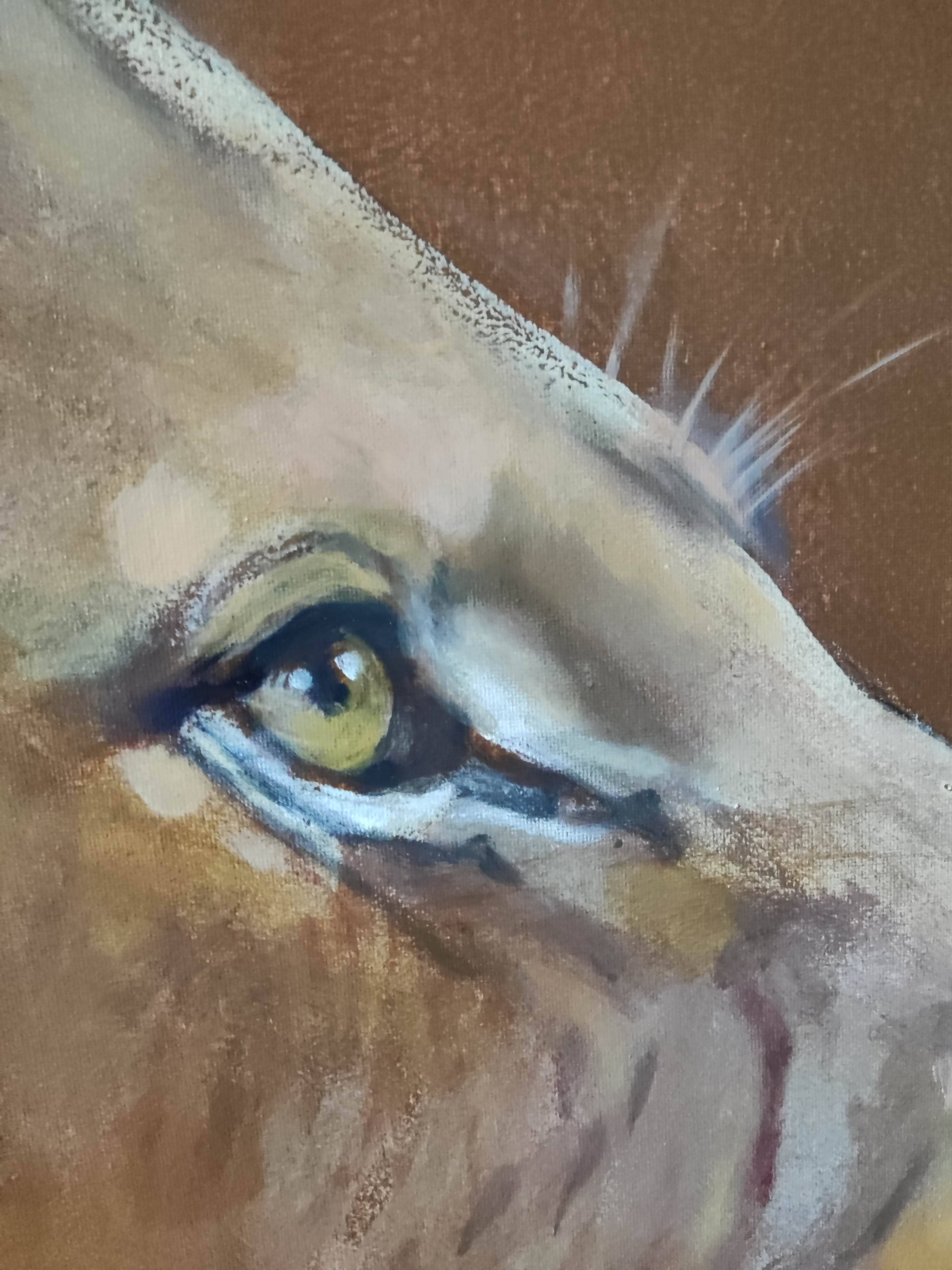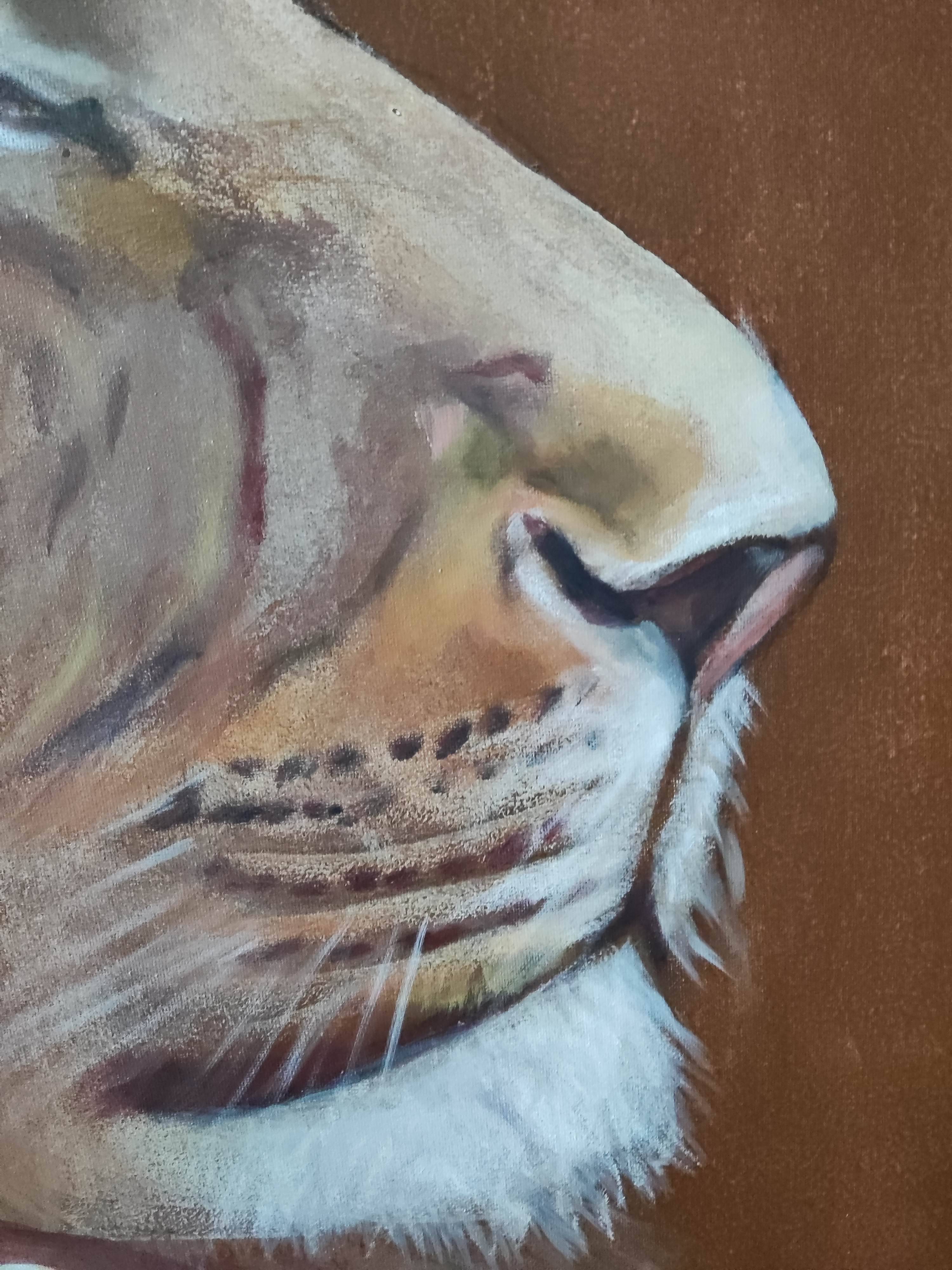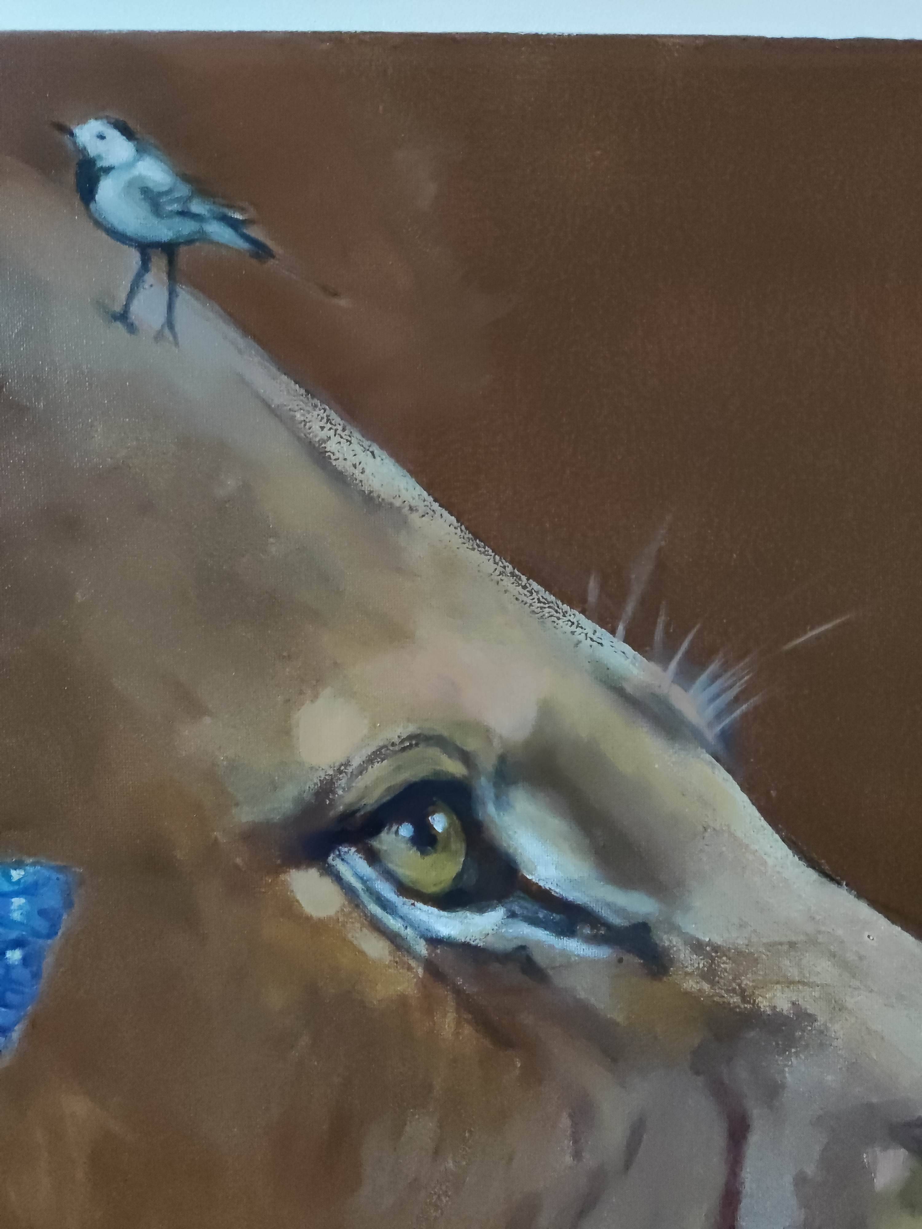 Obraz "Lwie Serce" jest wyjątkowym dziełem sztuki, które przyciąga uwagę zarówno ciepłą kolorystyką, jak i głębokim przekazem. Obraz emanuje ciepłymi brązami, które doskonale współgrają z dopełniającymi błękitami. Te kolory nie tylko nadają obrazowi harmonii, ale również podkreślają jego subtelną symbolikę. Centralną postacią obrazu jest lew, ukazany w łagodnym profilu. Ten wizerunek Króla Zwierząt w jego delikatnej odsłonie stanowi pozorną sprzeczność, która skłania do refleksji nad prawdziwą naturą odwagi i siły. Delikatność, zrozumienie, akceptacja i łagodność, które emanują z postaci lwa, nie są oznakami słabości. Wręcz przeciwnie, są świadectwem świadomej decyzji, by postrzegać i reagować na świat z empatią i współczuciem. Taki sposób bycia zakłada, że rzeczywistość, mimo jej surowości i brutalności, może być również miejscem piękna, harmonii i spokoju. Obraz "Lwie Serce" przypomina, że prawdziwa siła leży w umiejętności zachowania łagodności w obliczu trudności i konfliktów. To przesłanie stawia pytanie: czy można napić się herbatki z wrogiem? Ta retoryczna kwestia zaprasza nas do zastanowienia się nad możliwością budowania mostów porozumienia i wybaczenia. Może właśnie w tym tkwi największa odwaga i siła – w zdolności do poszukiwania wspólnego języka i tworzenia harmonii nawet tam, gdzie wydaje się to niemożliwe. Obraz "Lwie Serce" jest więc nie tylko wizualnym arcydziełem, ale także głęboką medytacją nad esencją człowieczeństwa i prawdziwej mocy.
