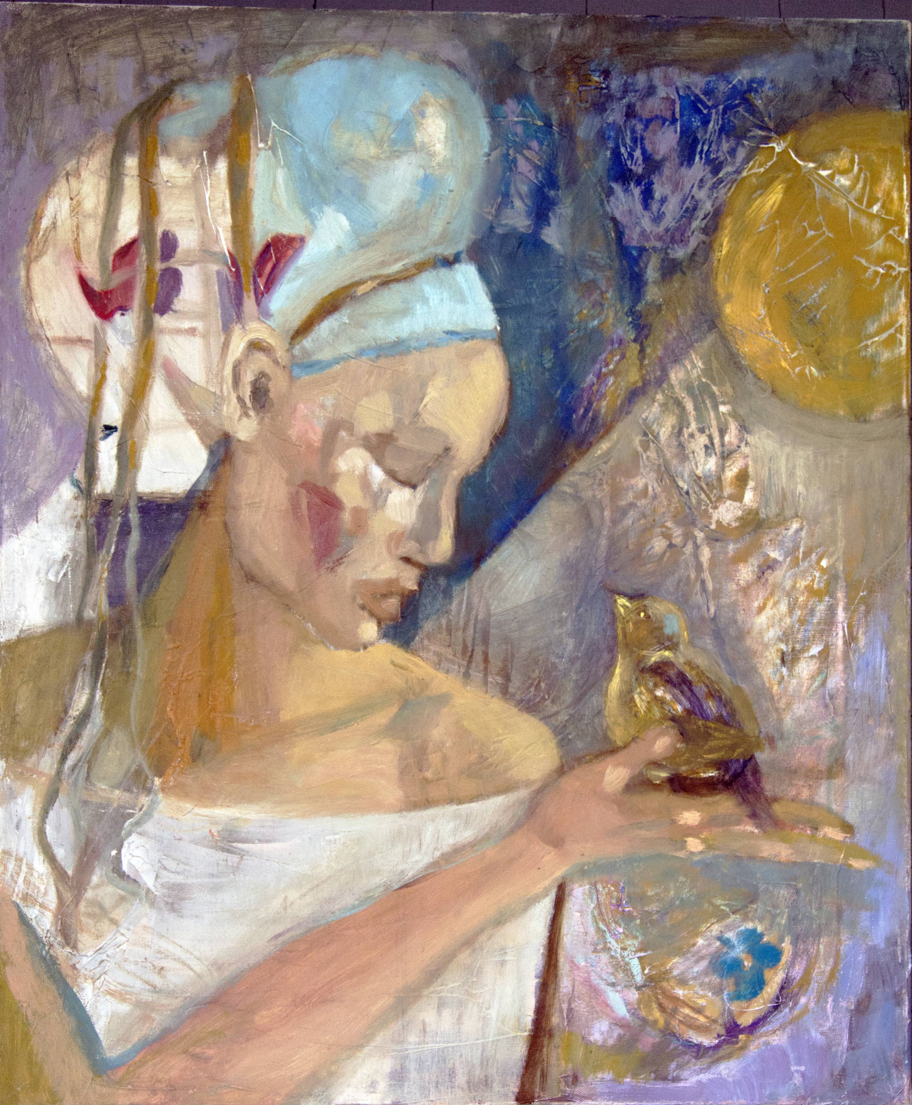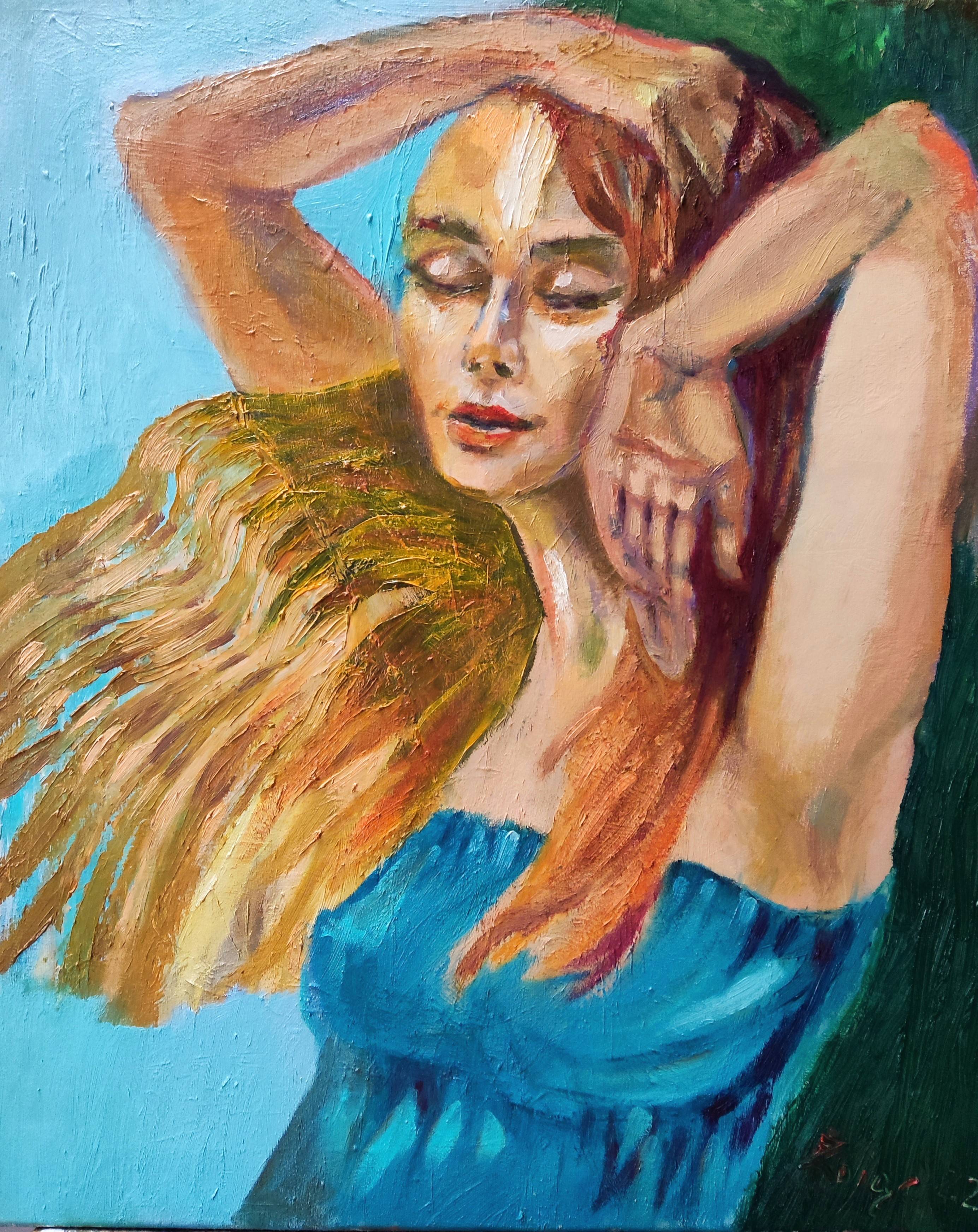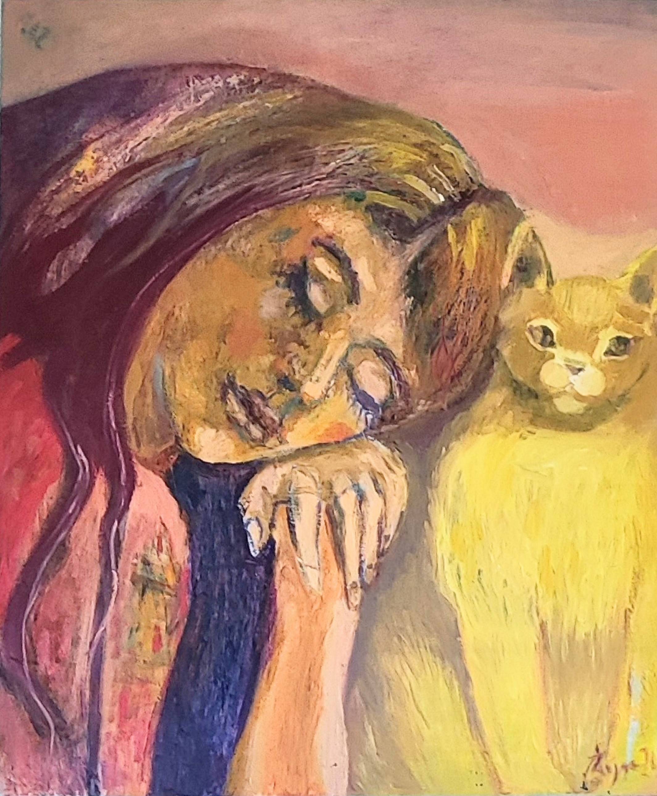 Obraz zatytułowany "Miłość" przedstawia intymny moment między kobietą i mężczyzną, uchwycony w przedłużonym portrecie, który skupia się na nich dwojgu, zamykając świat zewnętrzny poza kadrem. Kobieta,, delikatnie opiera dłoń o czerwonæ tkaninę,ma przymknięte oczy. Mężczyzna znajduje się z tyłu w białej koszuli. Całość ujęcia tworzy atmosferę bliskości i oddania. Ciepłe barwy, dominujące beże i czerwienie, przenikają przez całą kompozycję, potęgując uczucie harmonii i spokoju. Wyraźna faktura obrazu nadaje mu głębi i wyrazistości, jakby malarz chciał, byśmy nie tylko widzieli tę scenę, ale także ją odczuli.