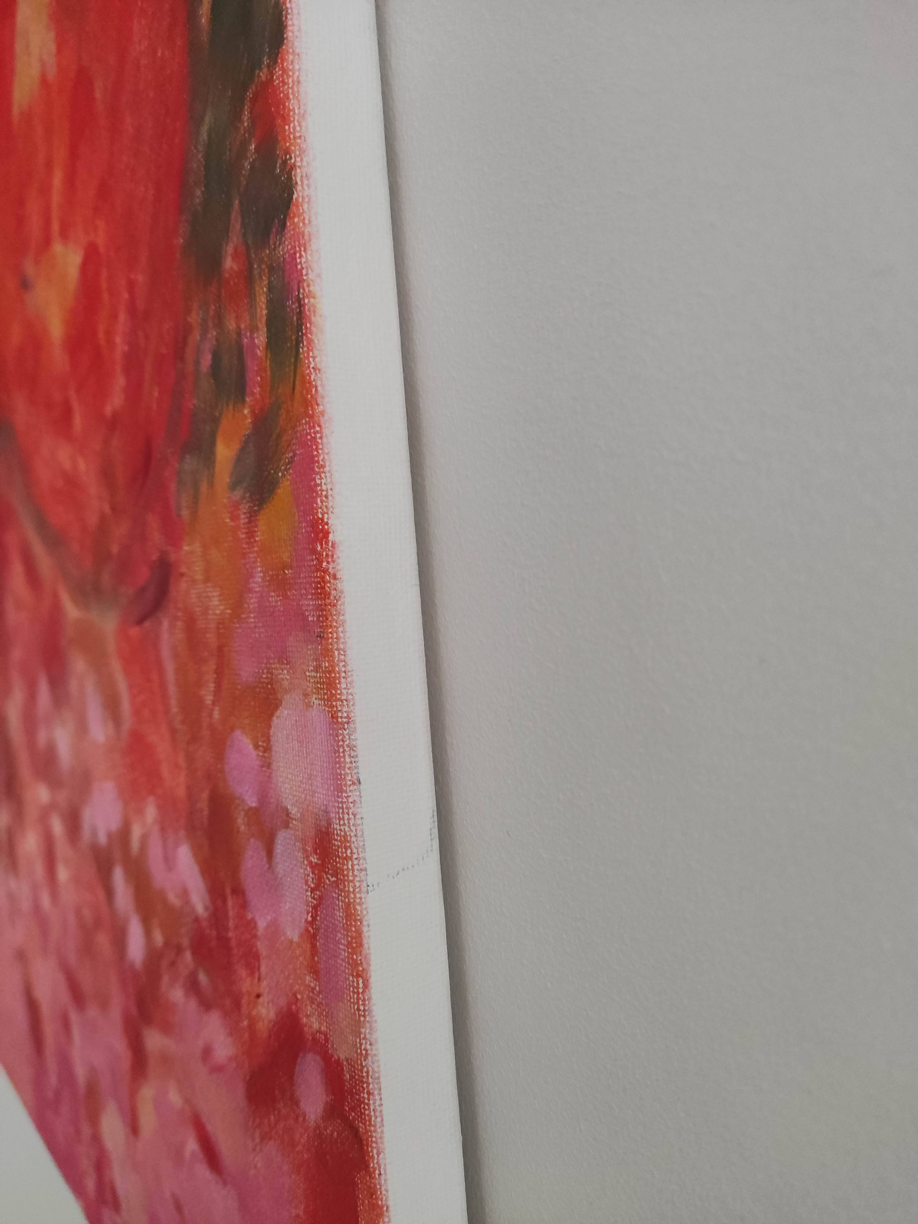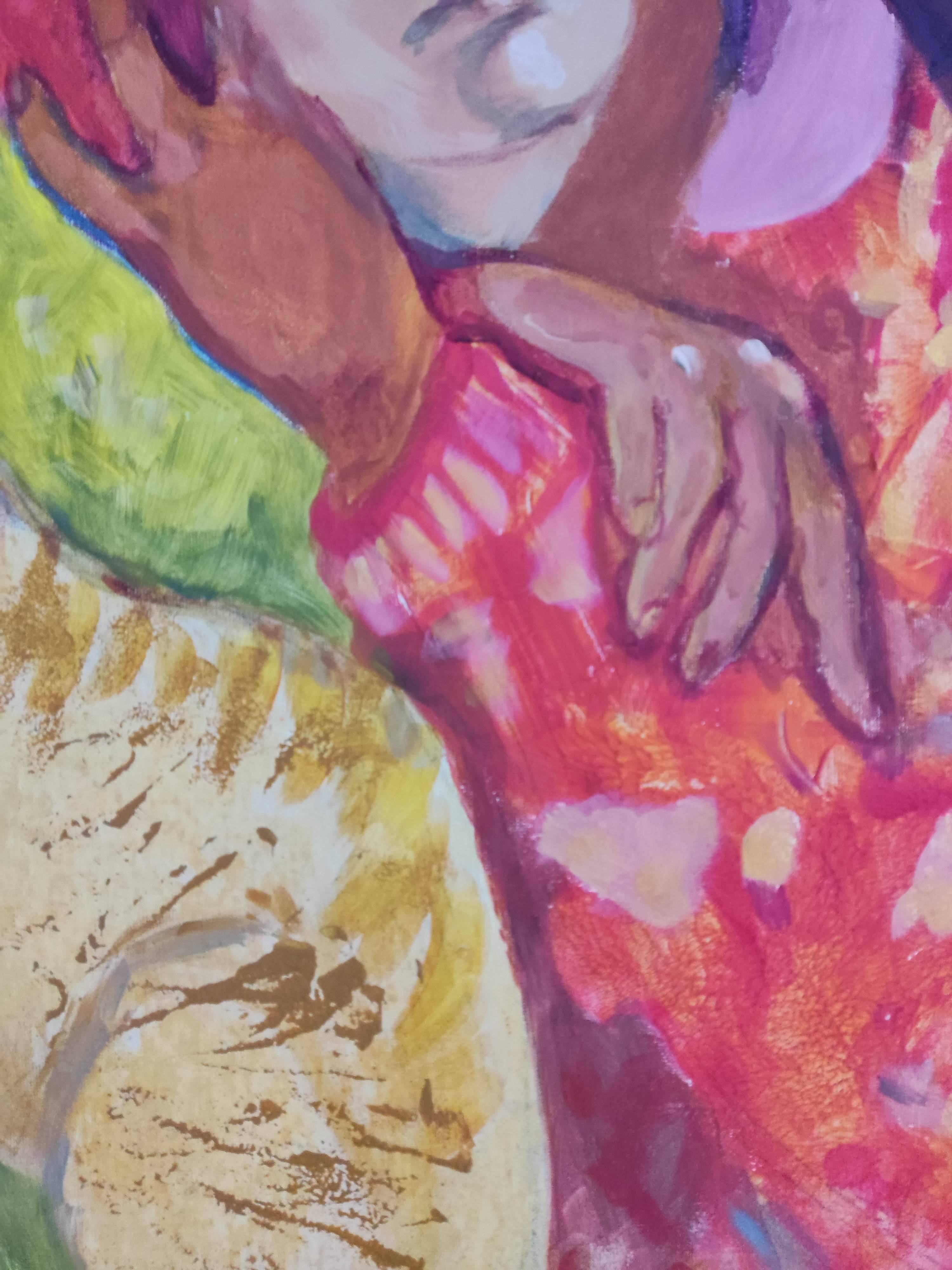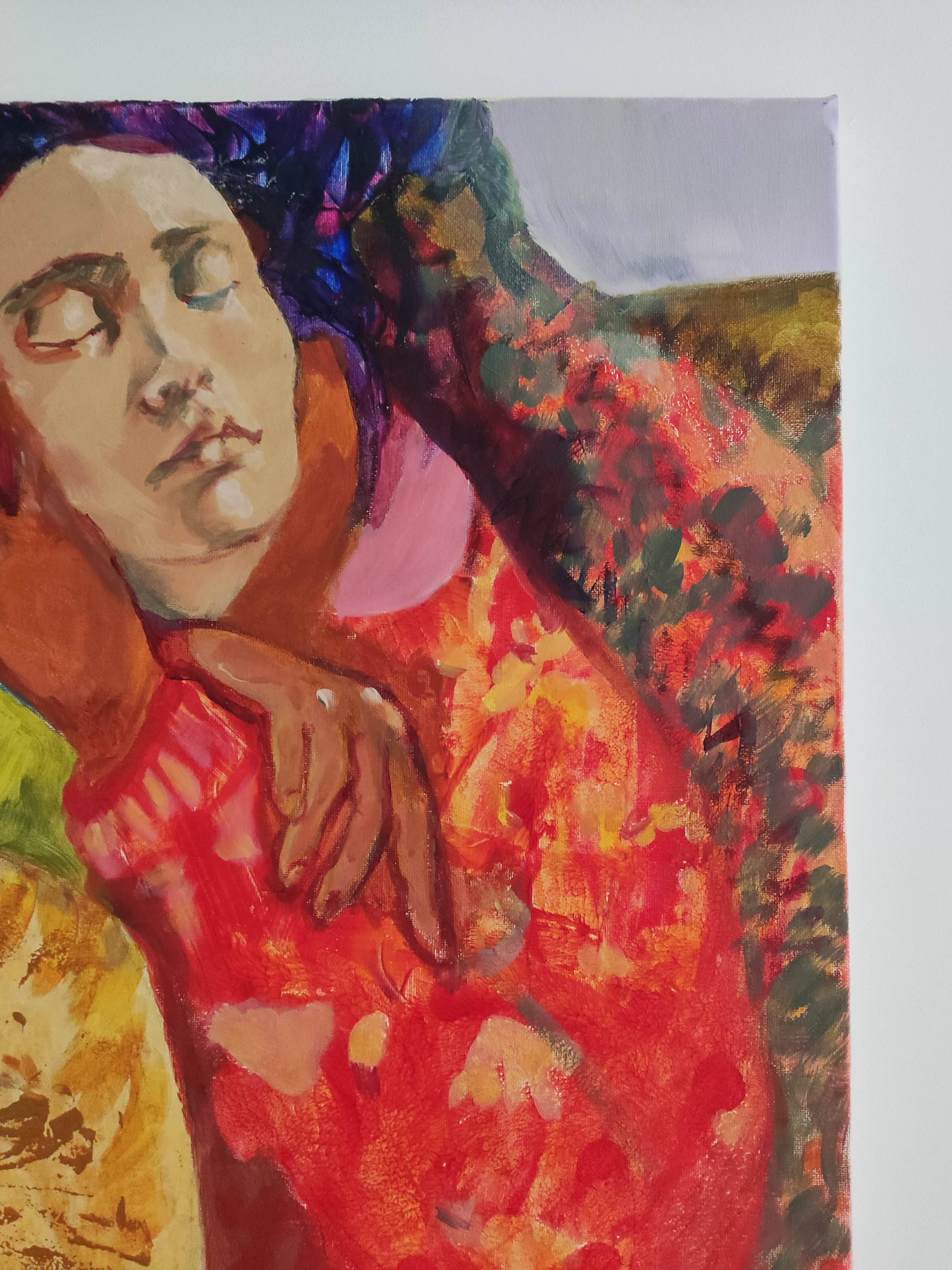 Obraz jest utrzymany w dominujących odcieniach ciepłej czerwieni, fioletu i żółci, które nadają mu przytulności i intymności. Te barwy symbolizują nie tylko ciepło fizyczne, ale i emocjonalne więzi, jakie łączą dwie postaci na obrazie. Wybór takich kolorów sugeruje, że scena rozgrywa się w przytulnym, domowym wnętrzu, gdzie czas płynie wolniej, a relaks jest na porządku dziennym.