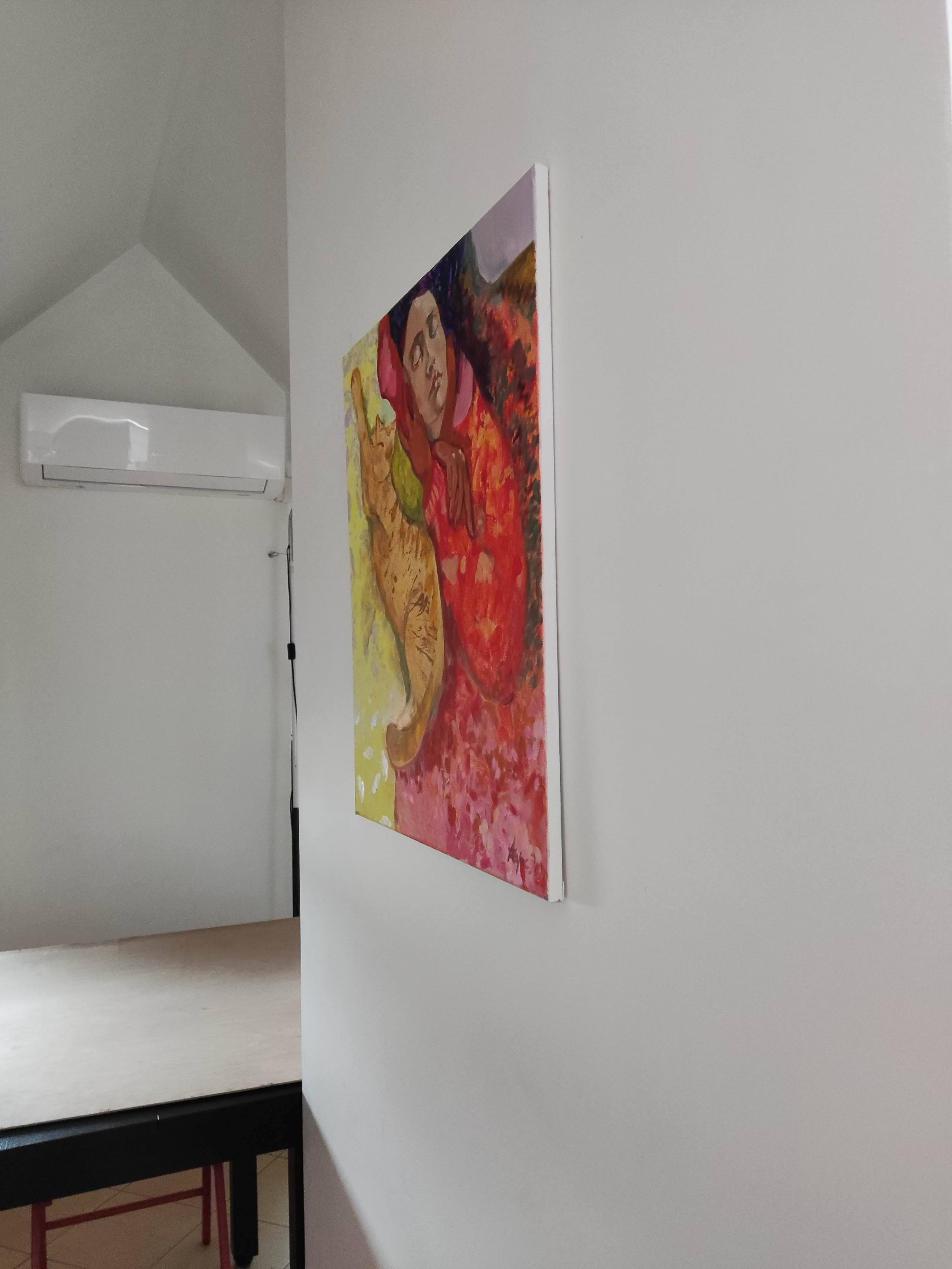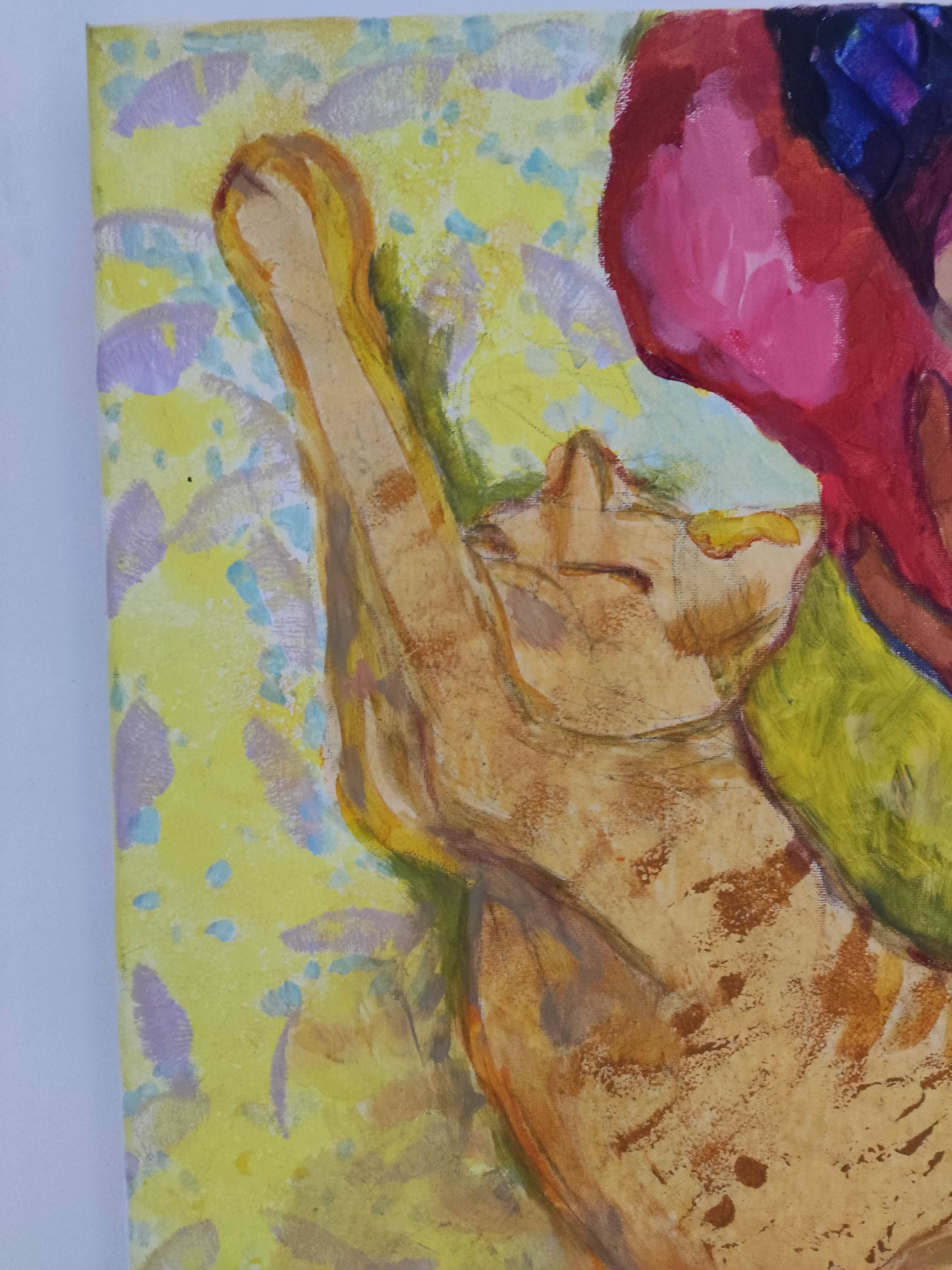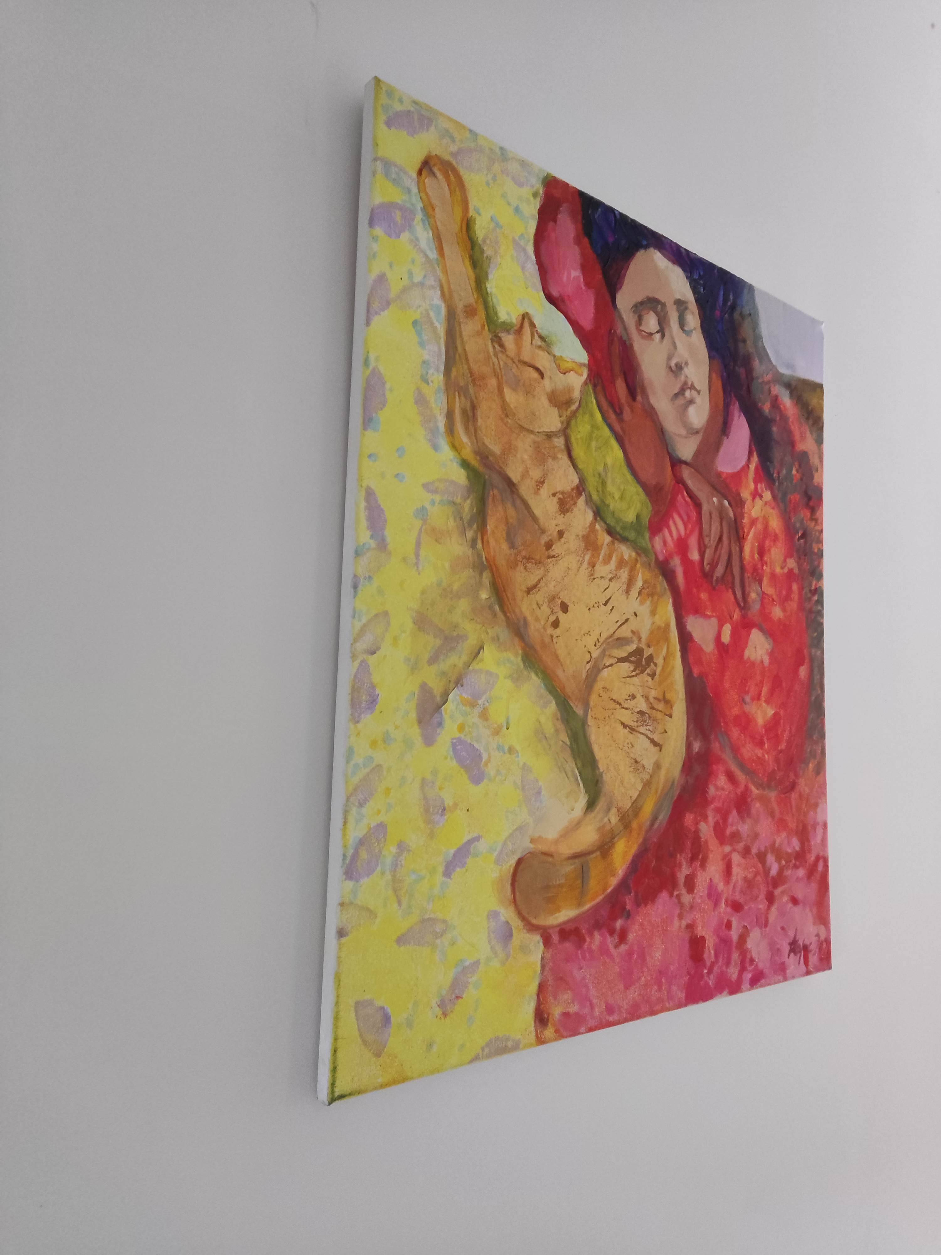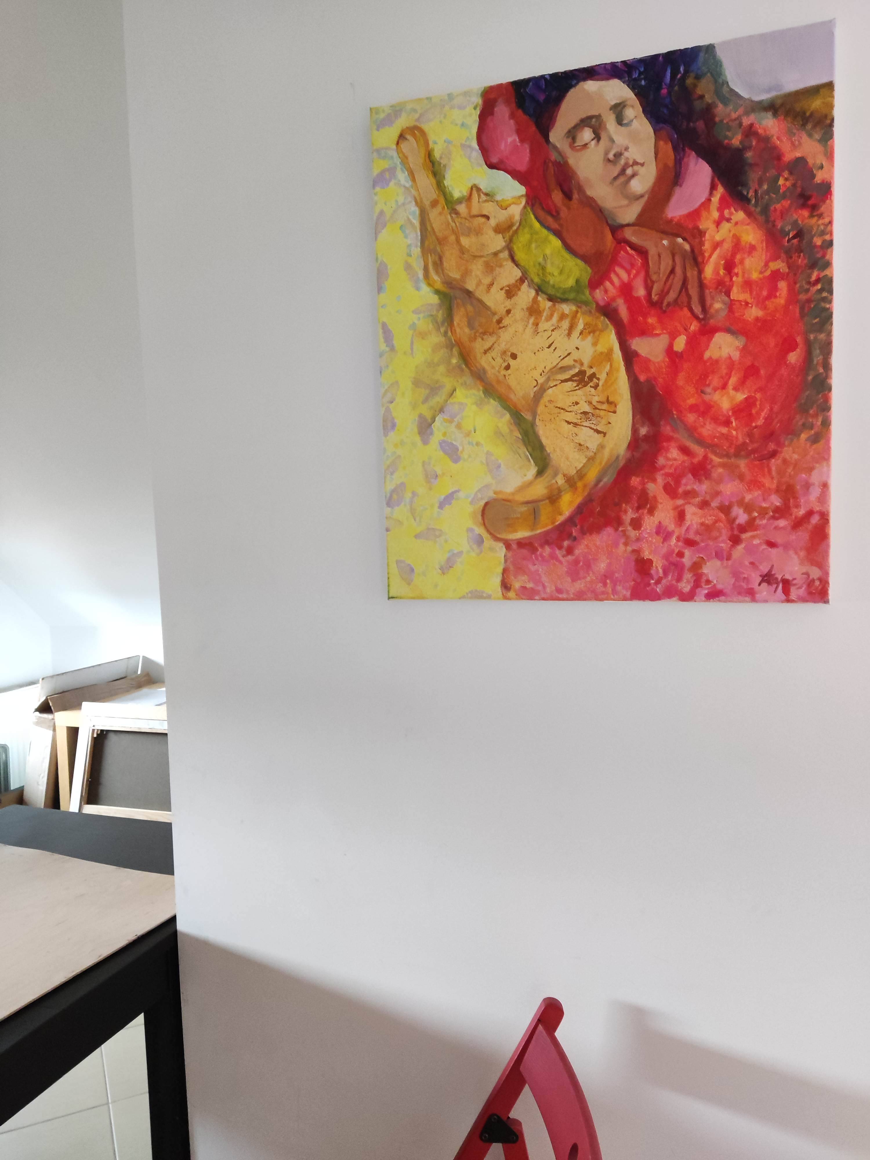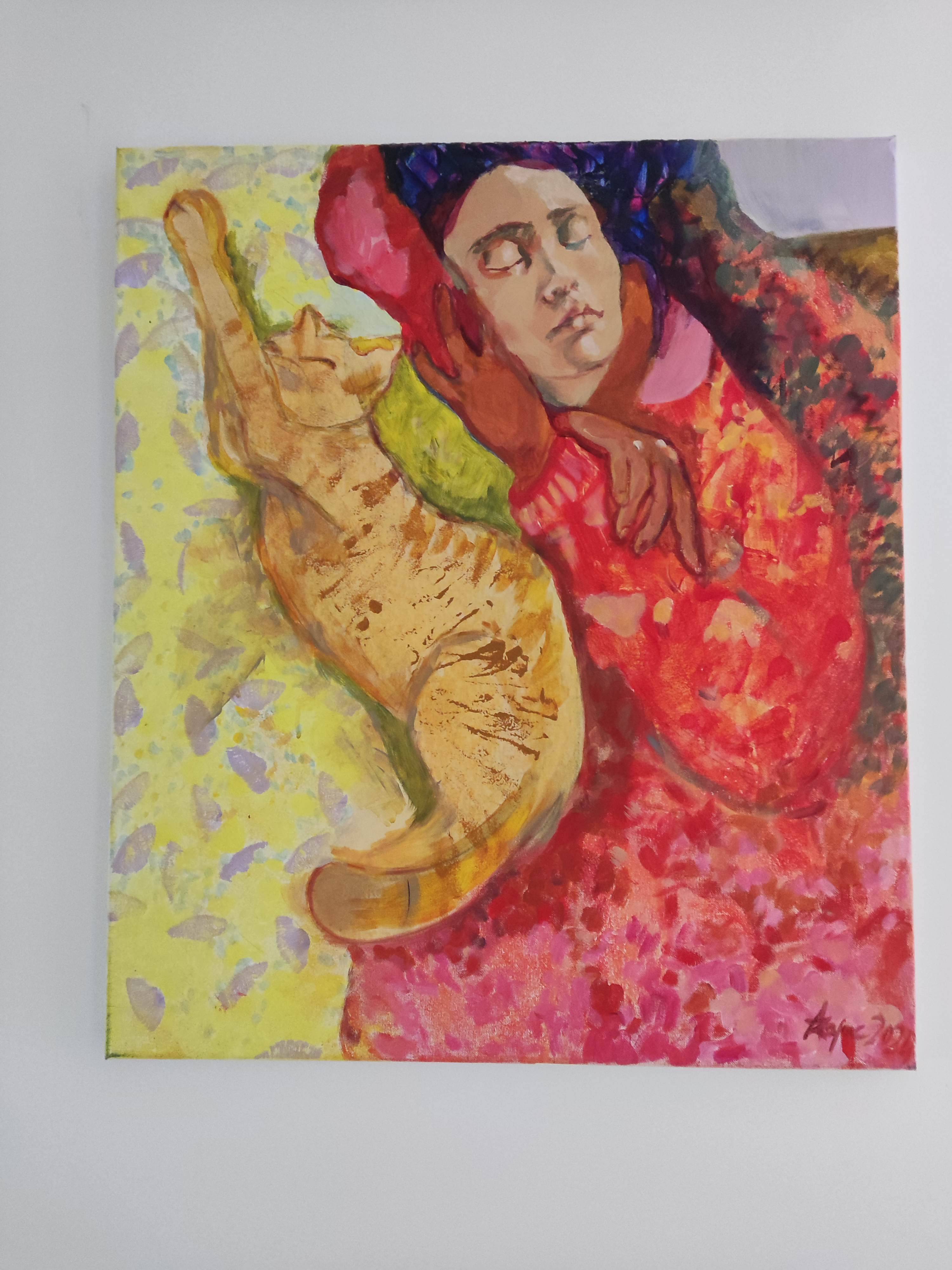 "Mruczanka" to obraz, który emanuje ciepłem i spokojem, przedstawiając chwilę wytchnienia i intymności między kobietą a kotem. Główna postać, kobieta, leży wspierając głowę na ręce. Jej twarz, delikatnie oświetlona ciepłymi barwami, jest zwrócona ku kotu, który znajduje się na pierwszym planie. Kot, uchwycony w momencie przeciągania się, jest w centrum uwagi i zdaje się być symbolizowany przez jasne, ciepłe kolory, takie jak żółty i pomarańczowy.