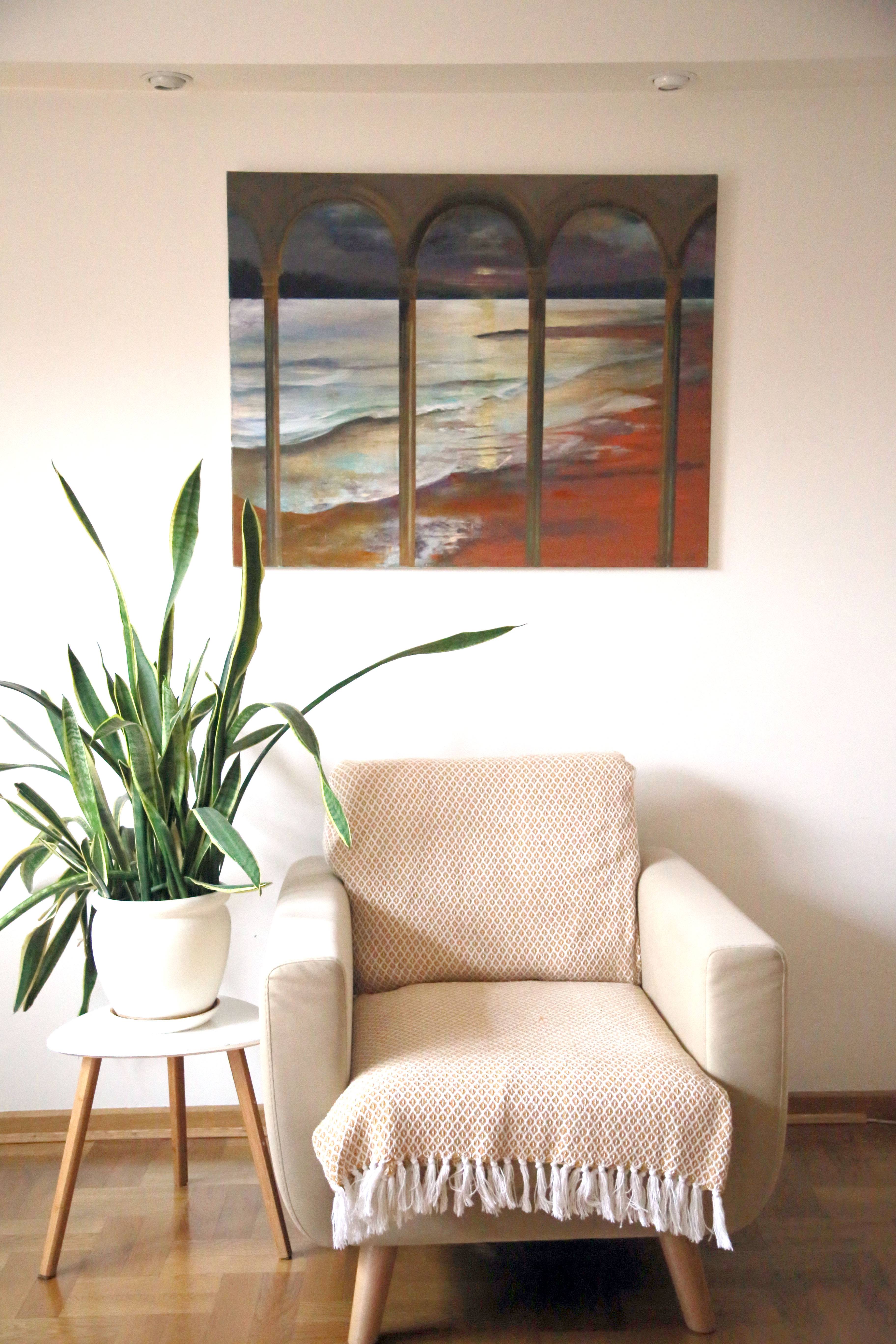 "Zmierzch Atlantycki" to obraz olejny, który przenosi widza w magiczny świat morskiego pejzażu, ukazujący zachód słońca nad spokojnym oceanem. Kompozycja obrazu jest starannie przemyślana, z bogactwem detali, które oddają atmosferę nadchodzącej nocy. Na pierwszym planie znajdują się majestatyczne kolumny podtrzymujące eleganckie łuki, które zdają się być portalem do innego świata, pełnego tajemnicy i piękna.