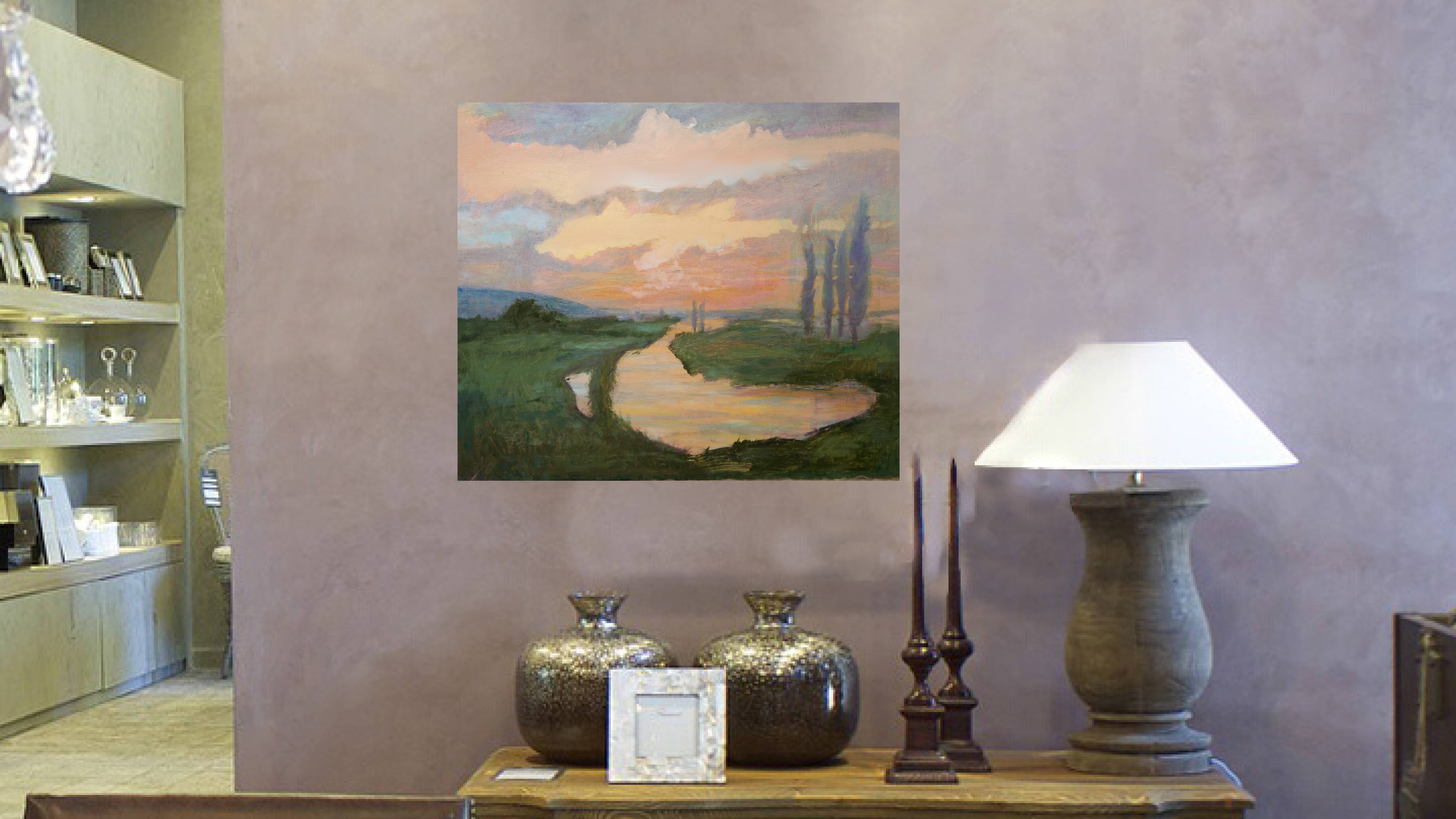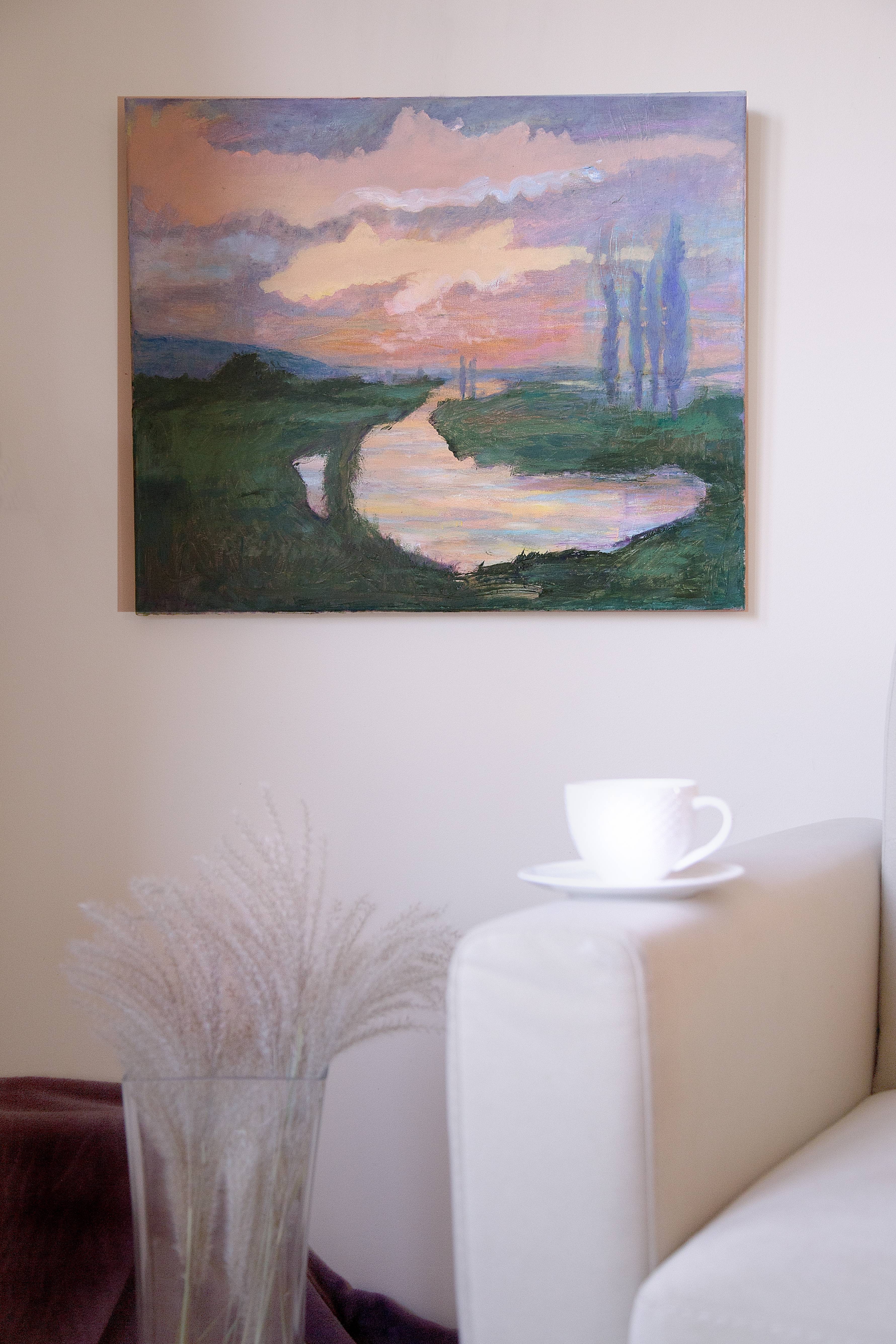 Obraz "Nad Bzurą" przenosi nas w świat fantazyjnego pejzażu, gdzie natura zdaje się tętnić życiem w najintensywniejszych barwach. Dominująca tonacja zieleni i różu tworzy harmonię, która uspokaja i zarazem ożywia zmysły. Słońce, zniżające się ku horyzontowi, maluje niebo w różowo-pomarańczowych odcieniach, odbijając się w spokojnych wodach rozlanej po łąkach rzeki. Zmierzch delikatnie obejmuje krajobraz, który jest pełen ciepła i uroku letniego popołudnia.