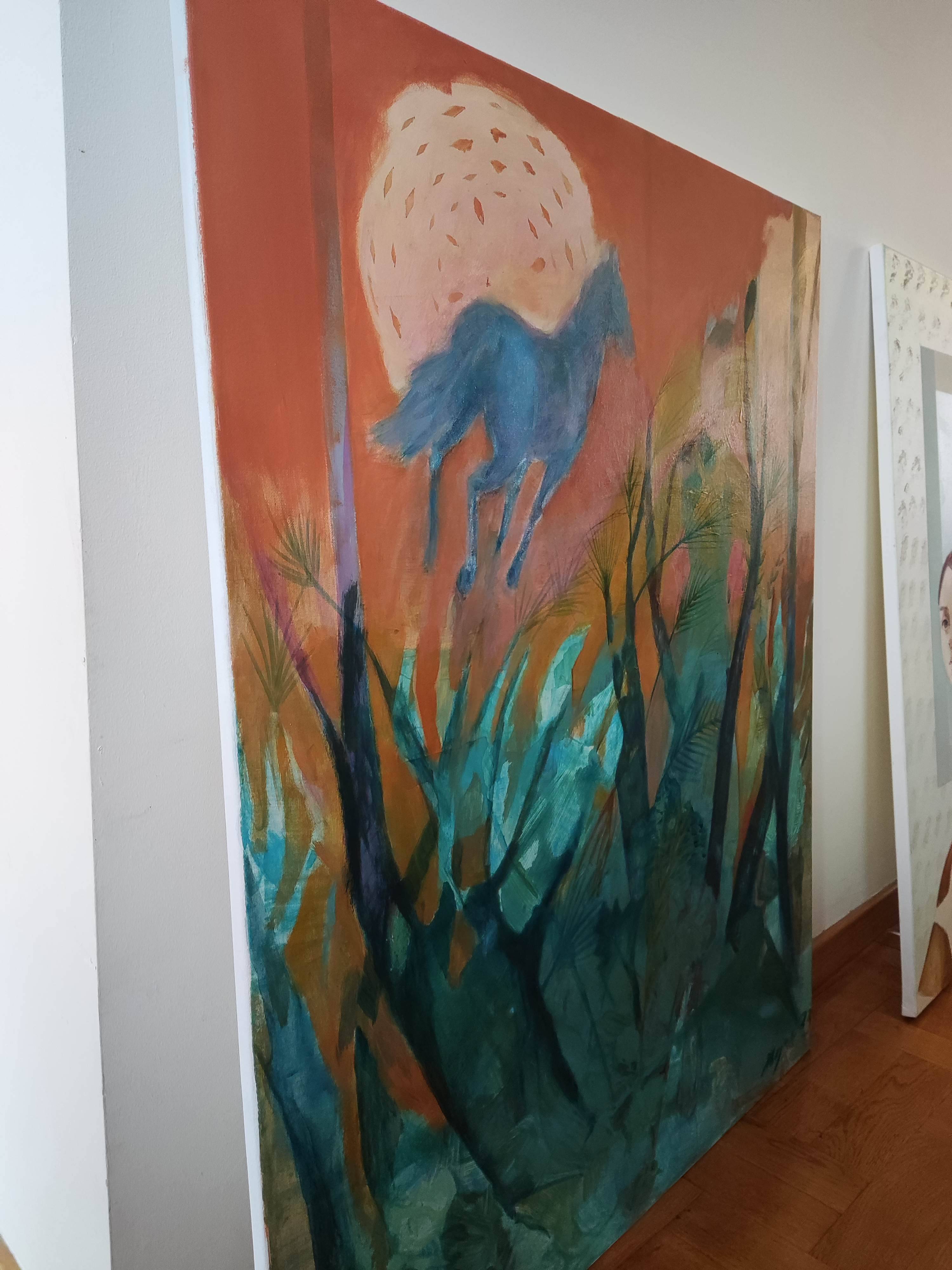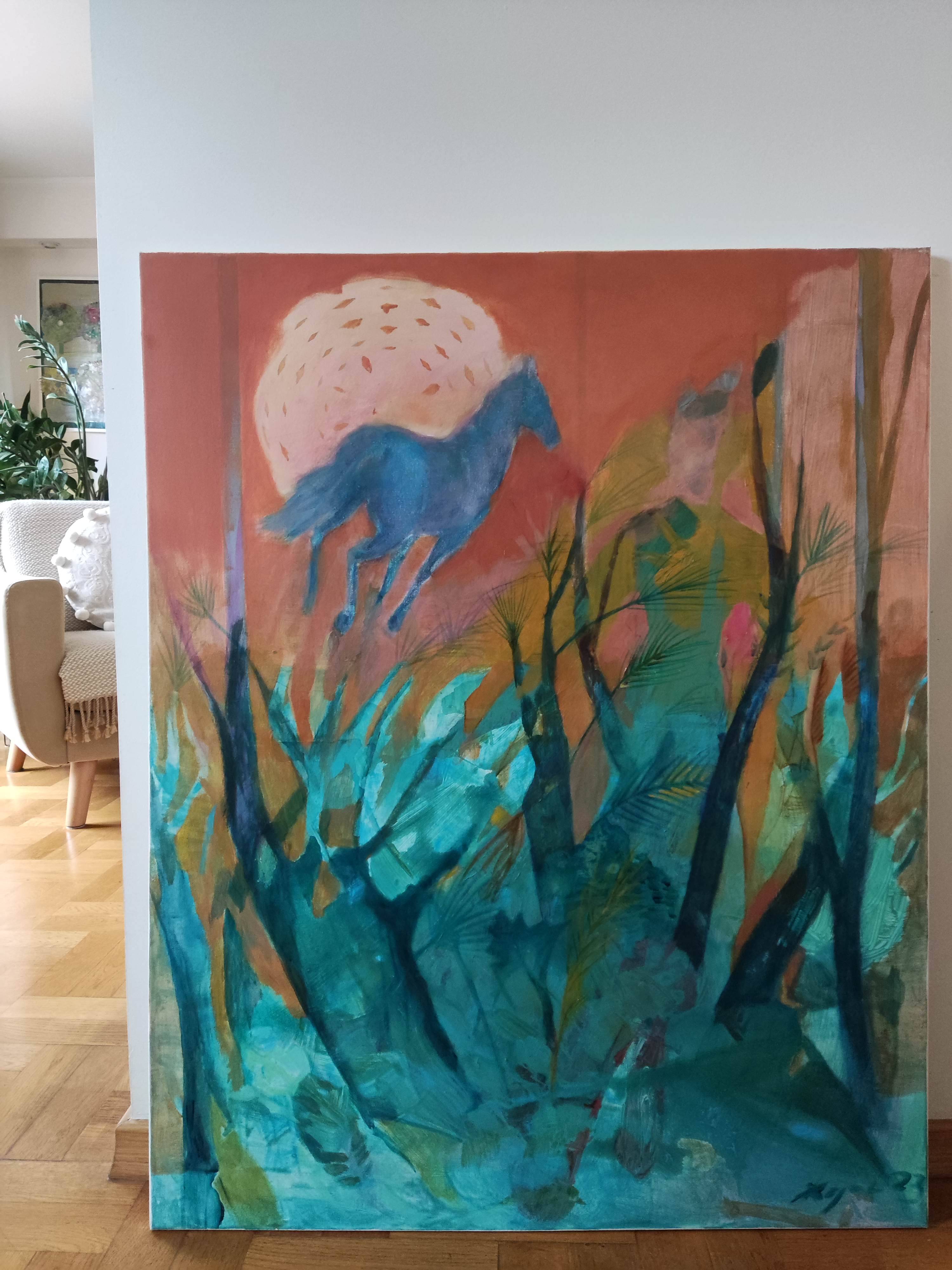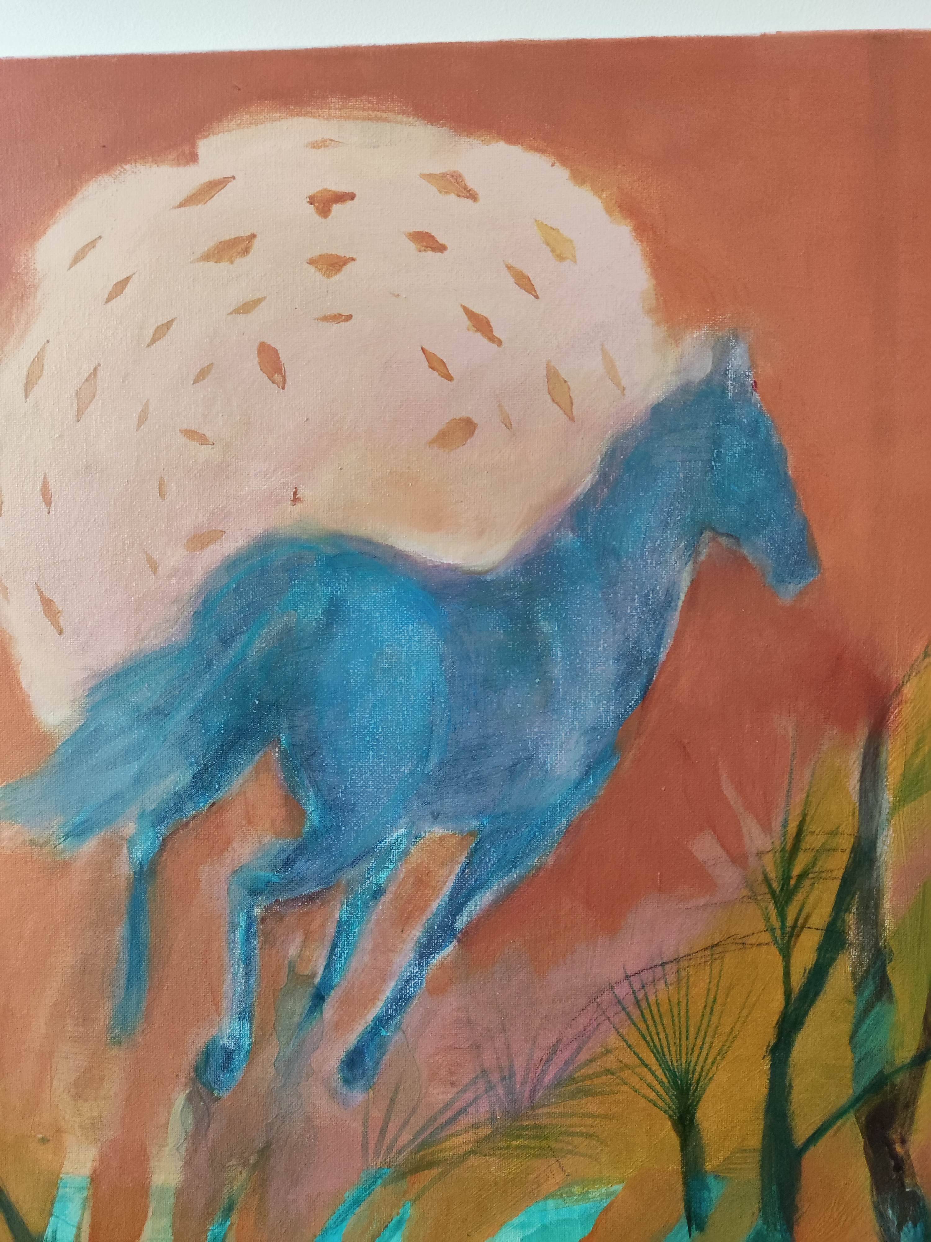 Centralnym punktem kompozycji jest niebieski koń, który zdaje się wzbijać ku słońcu. Jego niebieska sylwetka wywołuje wrażenie czegoś nierealnego, a zarazem pełnego dążenia do światła i spełnienia. Koń ten może symbolizować nasze nieosiągnięte cele i aspiracje, które mimo przeszkód, wciąż dążą do realizacji. Jego wzlot ku słońcu jest wyrazem nadziei i niezłomności w obliczu przeciwności ale również przypomnieniem o tym, co pozostaje niedokończone i zawieszone w czasie.