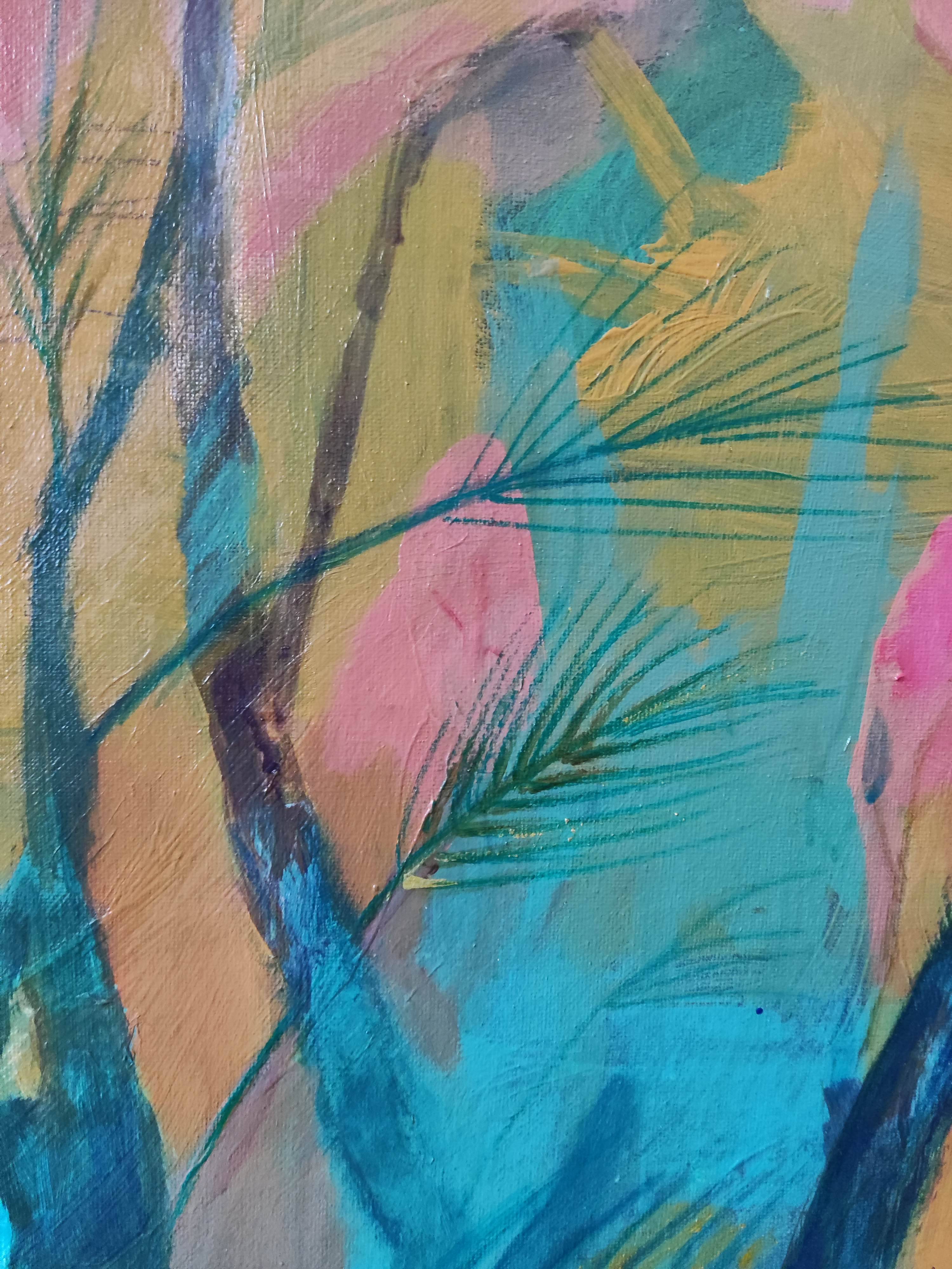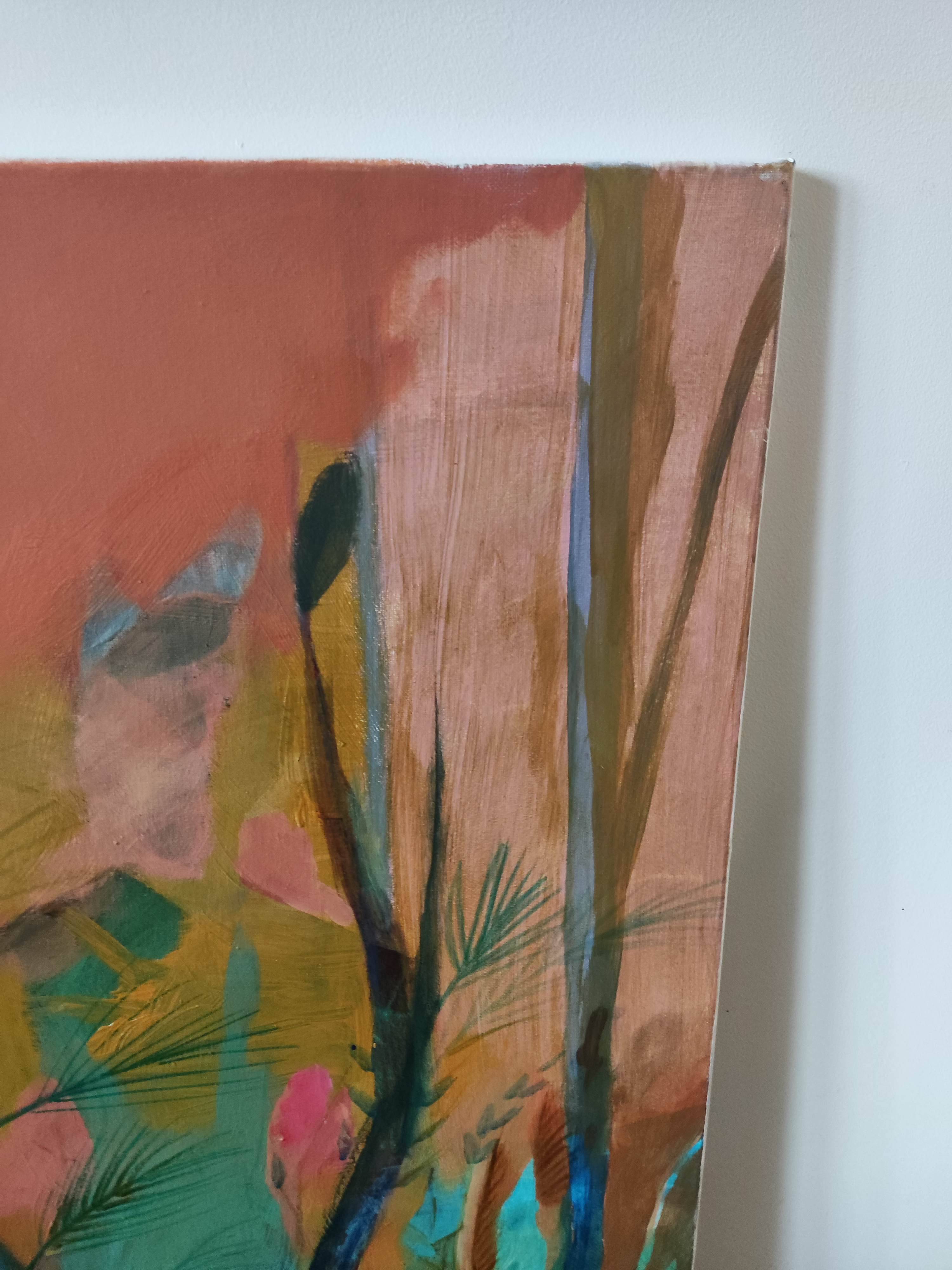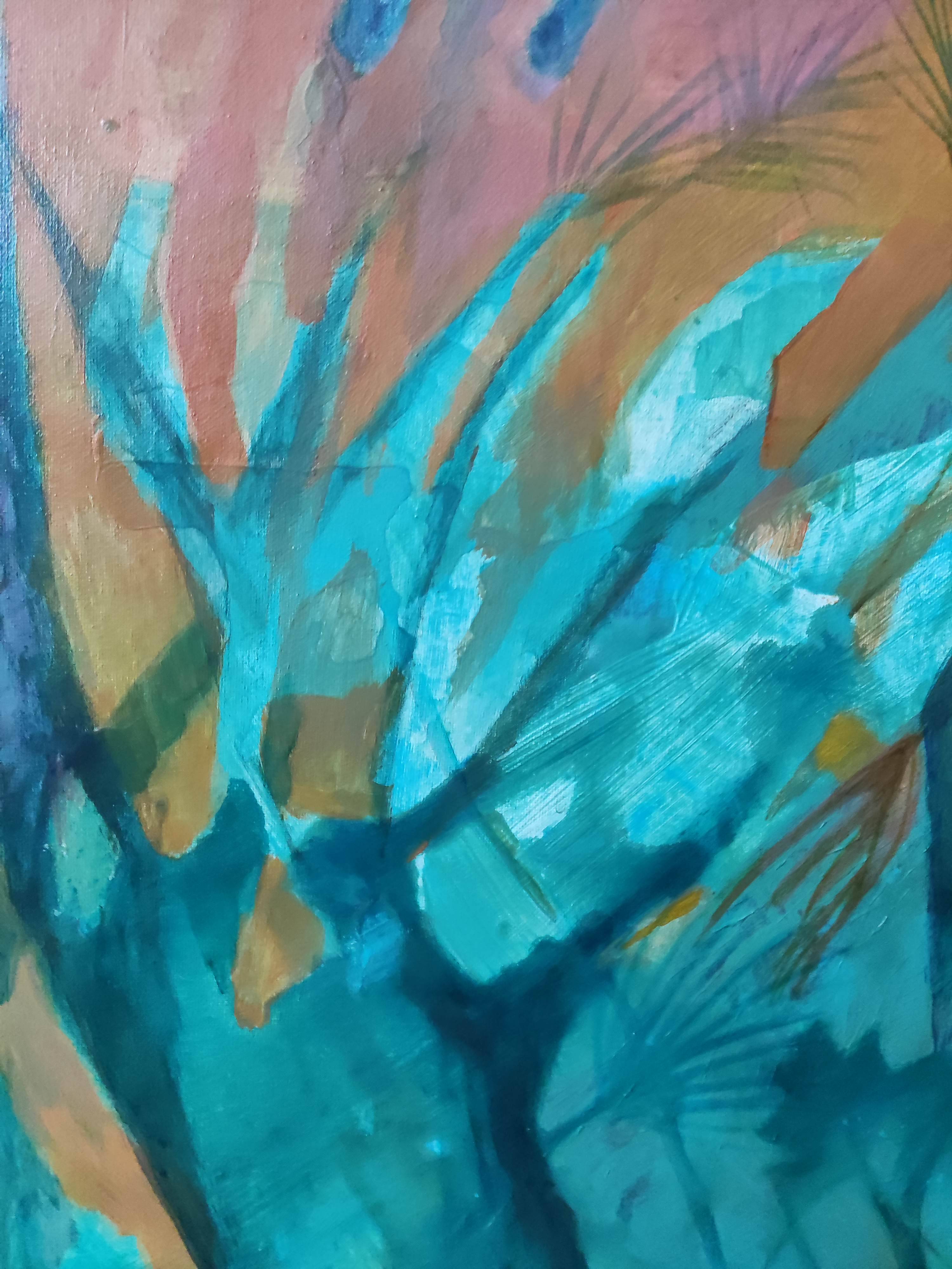 Obraz "Niedokończony sen" to dzieło, które wprowadza widza w świat marzeń i niedopowiedzianych pragnień, otwierając przed nim przestrzeń do refleksji nad naturą ludzkiej egzystencji. Na pierwszym planie znajdują się fantazyjne, organiczne formy roślinne, które zdają się pulsować życiem, jakby wyjęte z głębi snu. Te nierealne rośliny symbolizują kruchość i zmienność naszych marzeń, które, choć często nieuchwytne, pozostawiają trwały ślad w naszej świadomości.