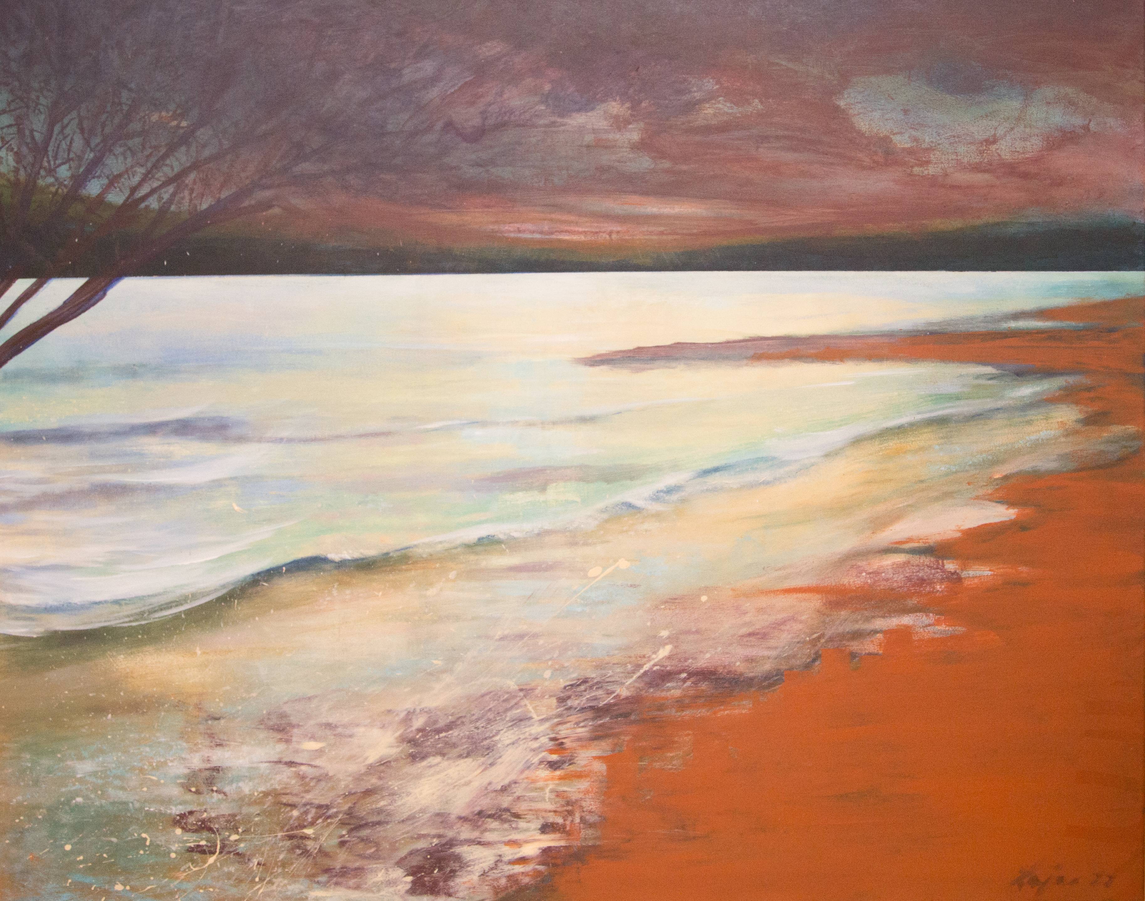 Obraz jest jak życie na pustyni. Tam życie jest niezwykle skondensowane, trudne ale i ukryte pod powierzchnią . Wypalające słońce nie dociera do podziemi, gdzie każda możliwość podtrzymania życia jest cudem. Z podziemi roślina czerpie soki do tego żeby żyć. Ja czerpię siłę do tworzenia z głębi swojej świadomości i a podpowiada mi podświadomość. Kaktus zakwita rzadko, ale płomiennie i niezwykle pięknie.