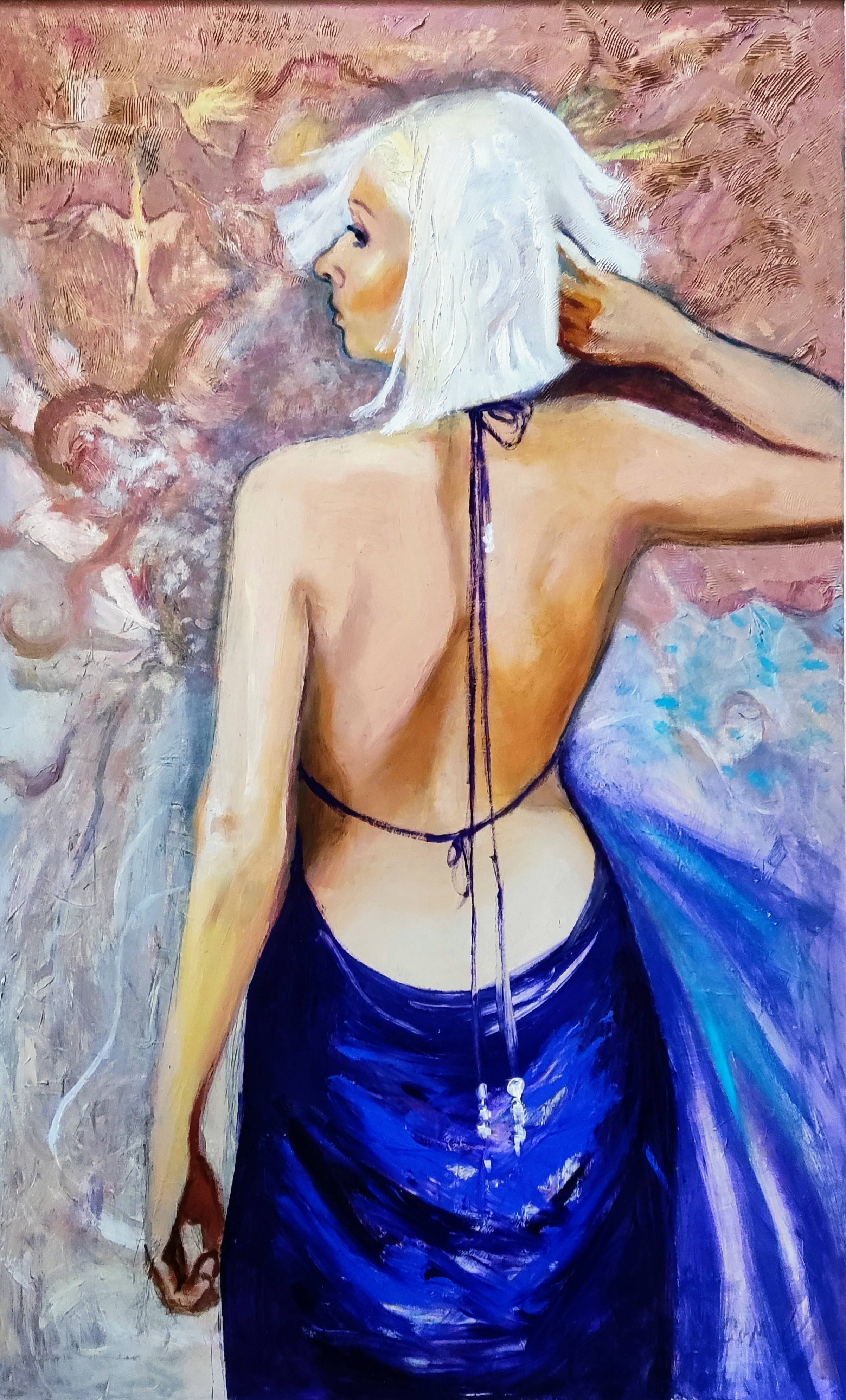 Obraz ten, na pierwszy rzut oka operujący prostą narracją portretową, okazuje się być wielowarstwową opowieścią o kobiecości i samopoznaniu. Z premedytacją rezygnuję z oczywistego atrybutu indywidualizmu – twarzy – by skierować uwagę na to, co niewidzialne i może przez to bardziej autentyczne. Akcent przesuwa się z twarzy na gesty, linie ciała, światło odbite na ramieniu. Portretuję więc nie tyle osobę, co stan przejścia: moment zawieszenia pomiędzy introspekcją, a otwarciem na świat zewnętrzny.Obraz ten jest więc wnętrzem – świadectwem czułego procesu samoodkrycia, prowadzonego daleko od spojrzeń przypadkowych obserwatorów, ktorzy sa za oknem umieszczonym w rogu obrazu.