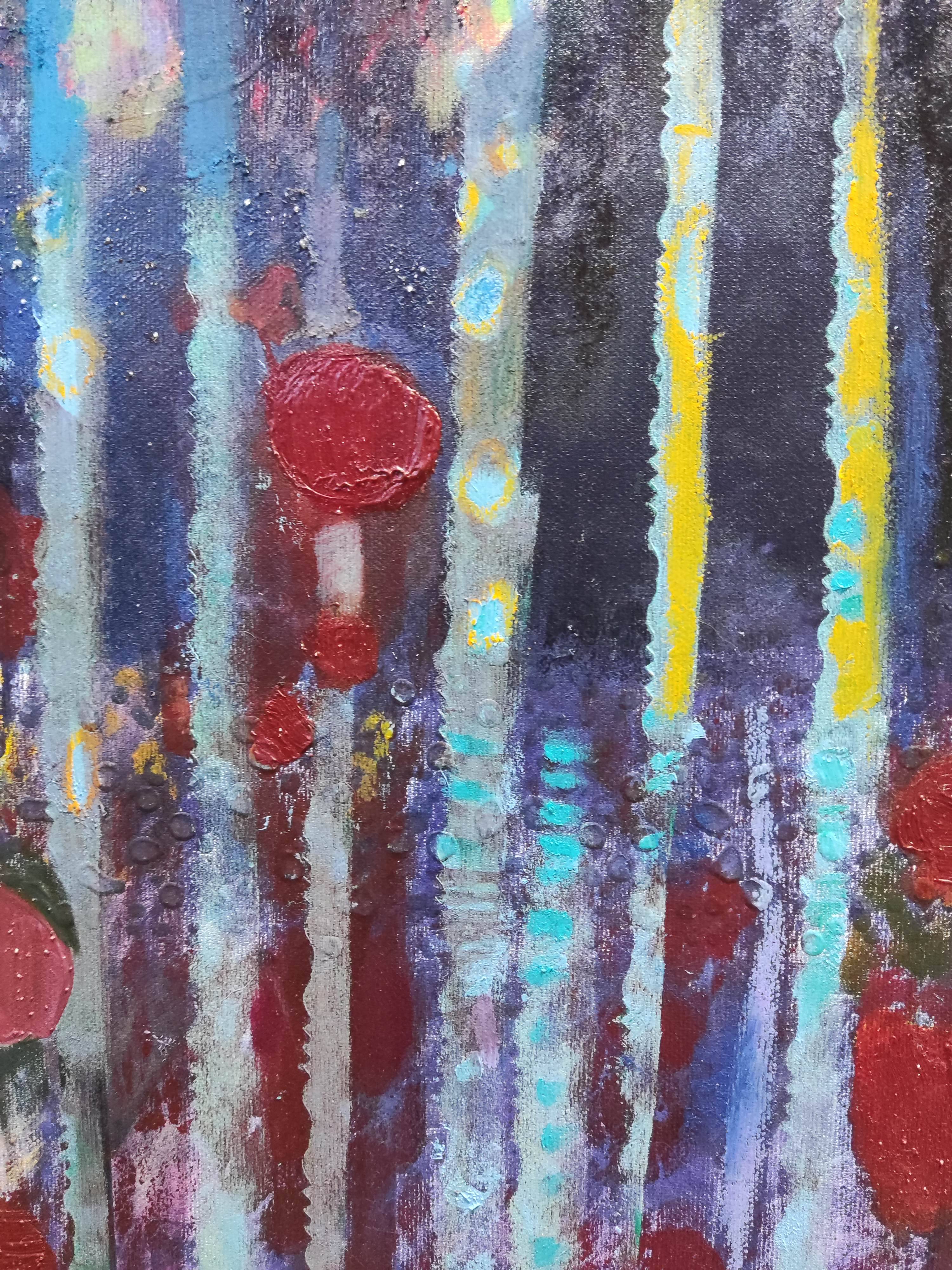 Każda plama i każde pociągnięcie pędzla na tym obrazie odzwierciedlają zachwyt i fascynację jaką odczuwamy, widząc coś po raz pierwszy. Białe i szare tony, splątane ze sobą, symbolizują zarówno czystość i lekkość śniegu, jak i ciężkość i chłód deszczu. Kontrastują z czerwieniami i czernią, które to wpisały się w pejzaż zimowy miasta z neonami , sygnalizacją świetlną, czy światłami samochodów. Te kontrastujące elementy tworzą harmonijną, choć nieco chaotyczną kompozycję, oddającą ulotność i przemijalność tego unikalnego momentu.