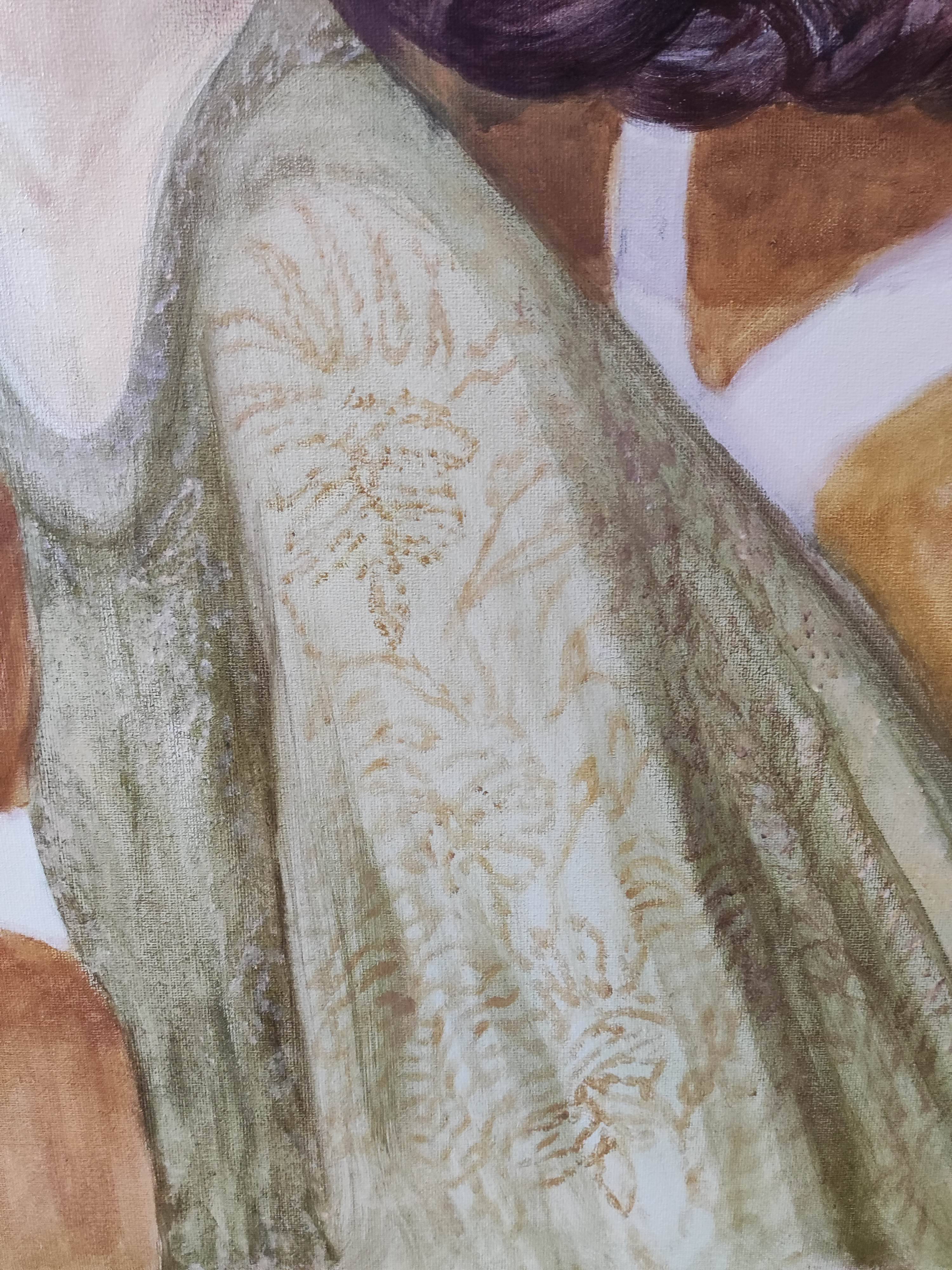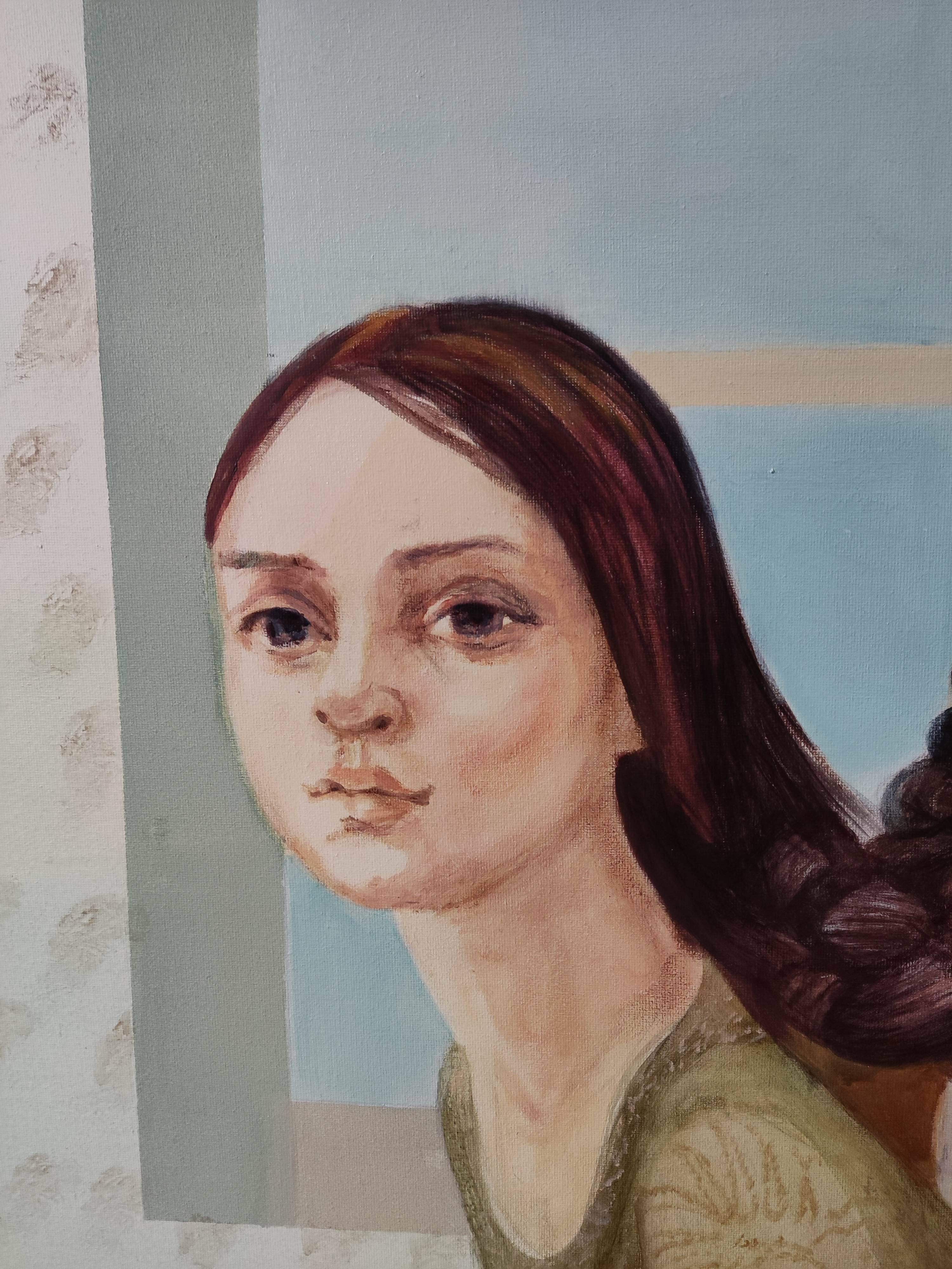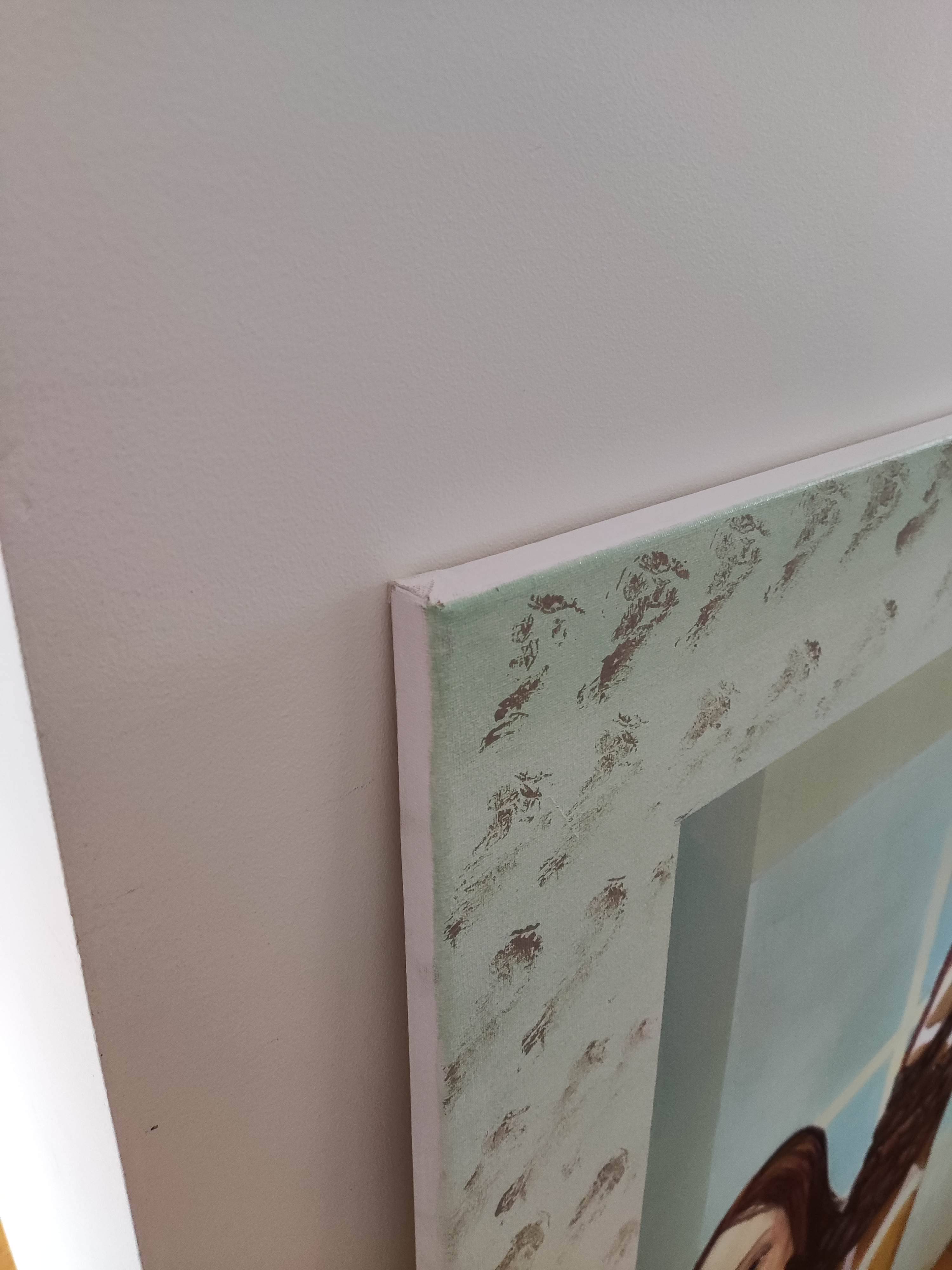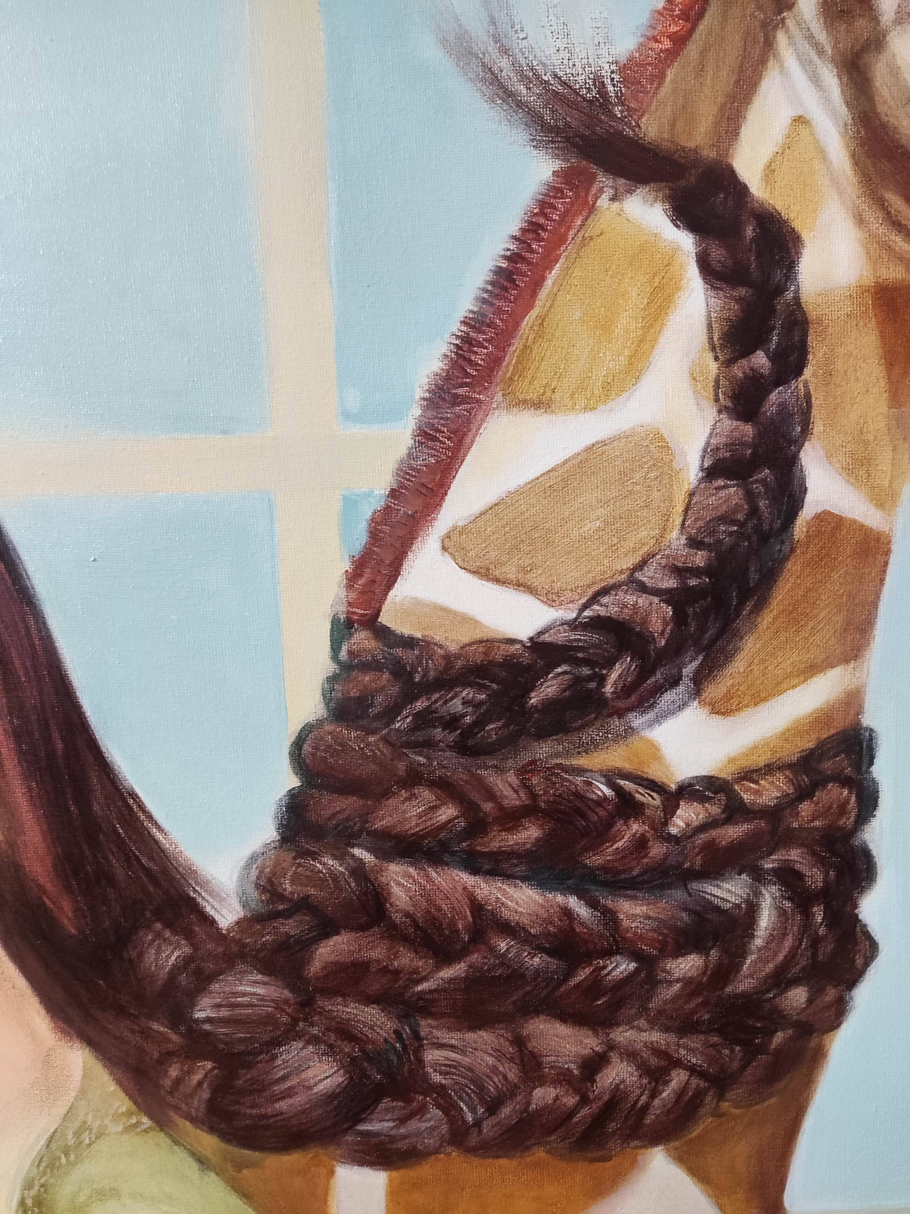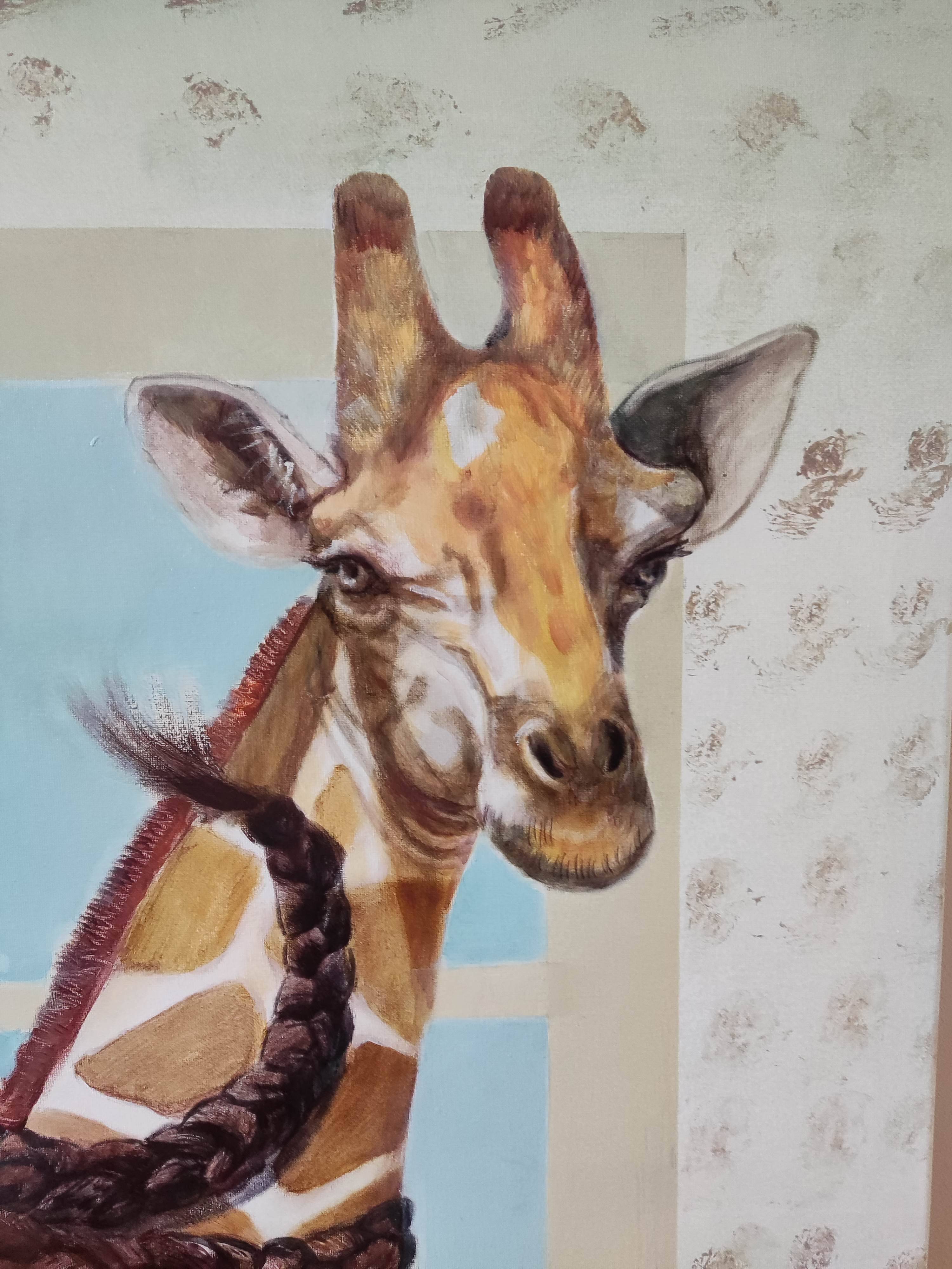 Tytuł obrazu "Półtora metra nad ziemią" od razu wprowadza nas w wyjątkową sytuację, którą przedstawia. Na obrazie widzimy dziewczynę stojącą obok żyrafy, która aby tak wyglądać, musiałaby znajdować się przynajmniej półtora metra nad ziemią. Ta niecodzienna scena jest pełna ciepła i harmonii, gdyż szyję żyrafy oplata długi, zapleciony warkocz dziewczyny. Wygląda na to, że zwierzę i człowiek są w szczególny sposób połączone, zarówno dosłownie, jak i symbolicznie. Warkocz stanowi wyraz przywiązania i troski, jakie dziewczyna odczuwa wobec majestatycznego zwierzęcia. Żyrafa, znana ze swojej łagodności i spokoju, wydaje się zadowolona z tej nietypowej sytuacji. Półtora metra nad ziemią to wysokość, która może sugerować osiągnięcie czegoś niezwykłego, wychodzenie poza codzienne ramy, a jednocześnie pozostanie w bliskim kontakcie z naturą.