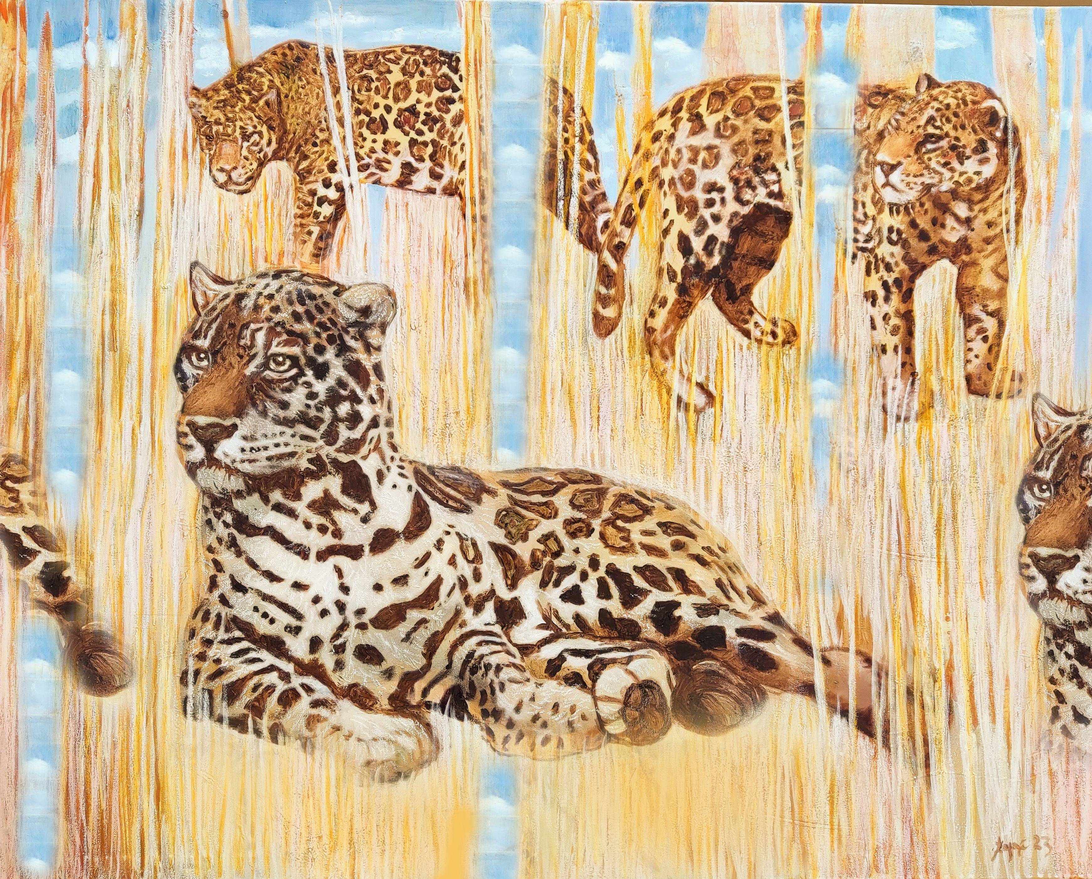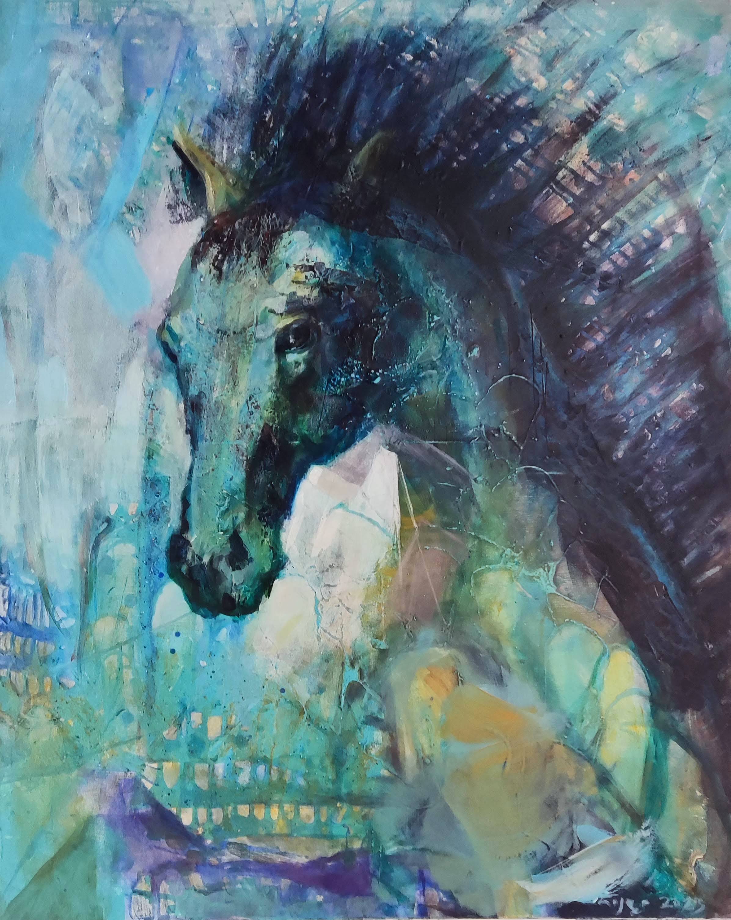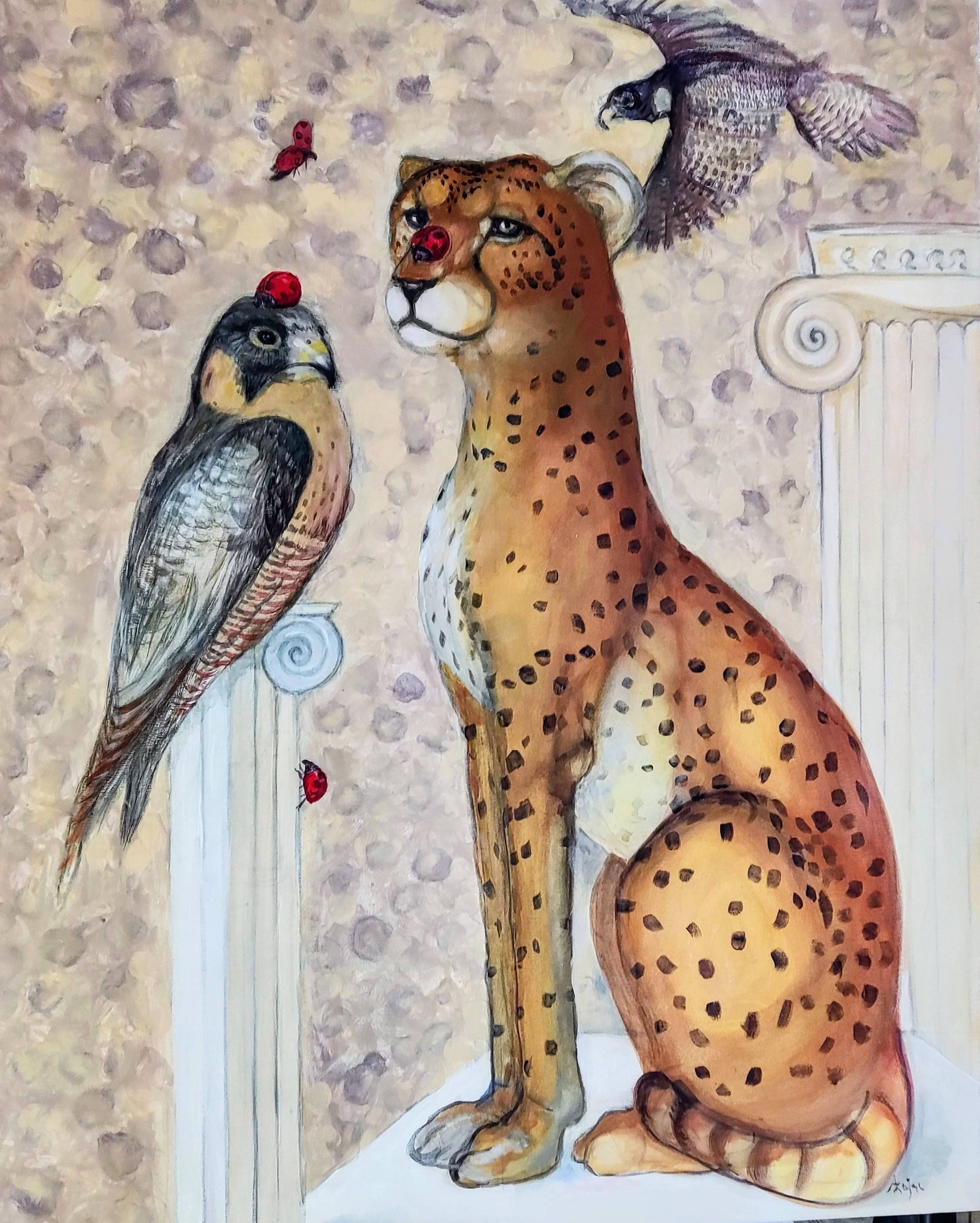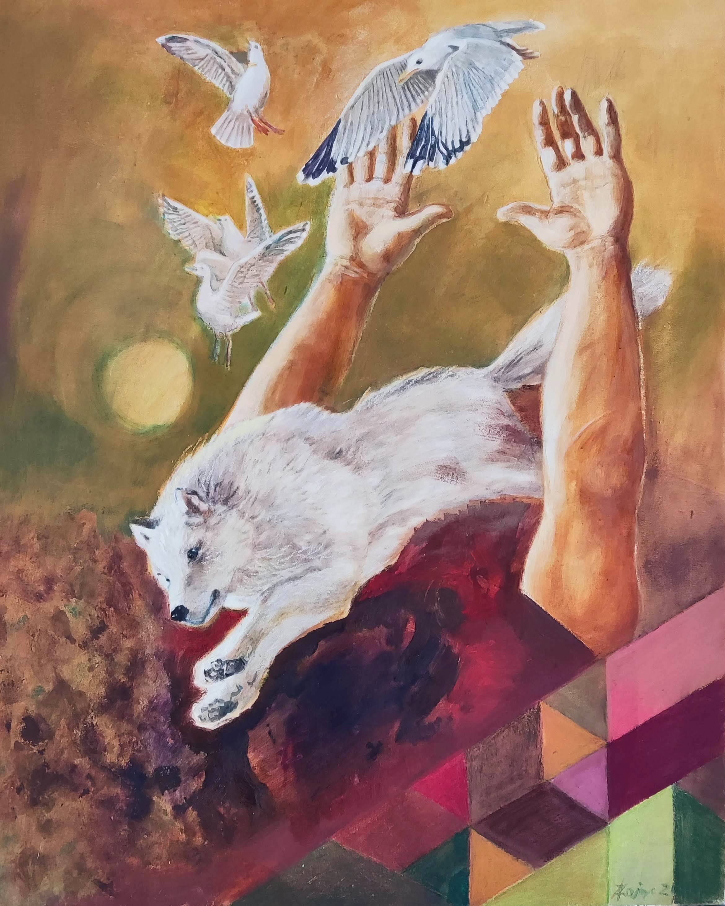 Obraz zatytułowany "Siad" przedstawia dynamiczną scenę z życia charta, konkretnej rasy whippet, znanego ze swojej smukłej sylwetki i niezwykłej szybkości. Na intensywnie czerwonym tle, które symbolizuje energię i pasję, widzimy serię powtarzających się wizerunków psa w ruchu, ułożonych w sekwencję przypominającą klatki z filmu.Każda sylwetka charta jest uchwycona w innym momencie biegu, od początkowego wybiegu po pełen rozpęd, aż do momentu, gdy zatrzymuje się i siada. Artysta zastosował technikę stop-klatki, aby oddać wrażenie ruchu i dynamiki, co w efekcie tworzy sugestywny portret szybkości i elegancji tej rasy. Symbolika obrazu może sugerować refleksję nad naturą czasu, przemijania i chwil odpoczynku, które są równie ważne jak sam ruch. W ten sposób obraz staje się uniwersalnym przekazem o równowadze między działaniem a odpoczynkiem, przypominając o pięknie i wadze każdej z tych chwil.