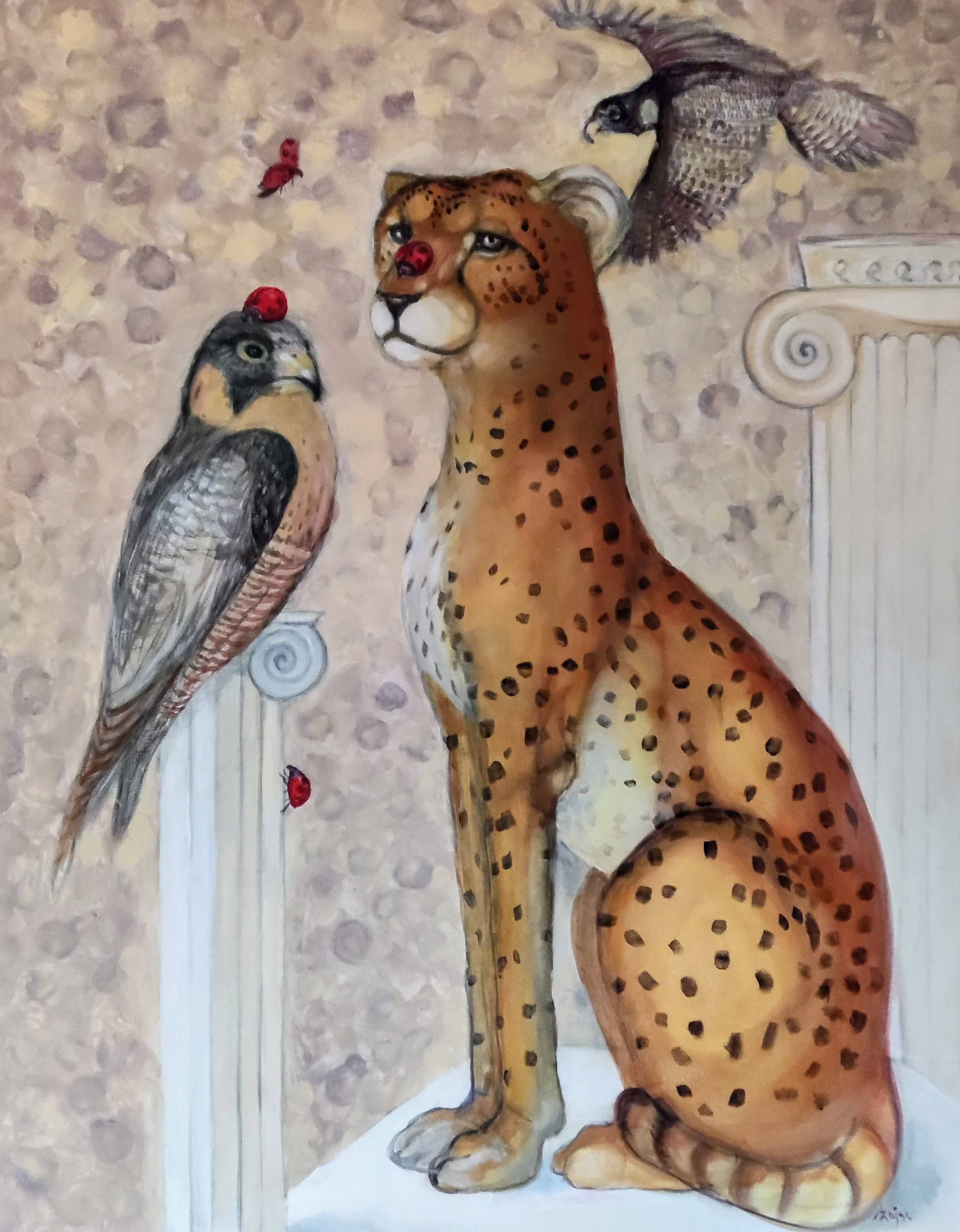 Starożytne guru i biedronki" to intrygujący obraz, który zestawia elementy natury- symbole starożytności w niespodziewany sposób ze zwyczajnymi, pospolitymi biedronkami. Centralnym punktem kompozycji jest majestatyczny gepard. Gepard, symbol szybkości i gracji, spogląda w dal z poczuciem dostojeństwa, jakby pełnił rolę strażnika pradawnej starożytnej cywilizacji. Na nosie geparda pojawia się niespodziewany kontrast - zwyczajne biedronki. Te małe, delikatne stworzenia, znane ze swojego spokojnego usposobienia, zdają się ignorować majestat i potęgę drapieżnika. Biedronki, uważane w wielu kulturach za symbol szczęścia, wprowadzają element codzienności i niewinności do sceny, która inaczej mogłaby wydawać się surowa i monumentalna.