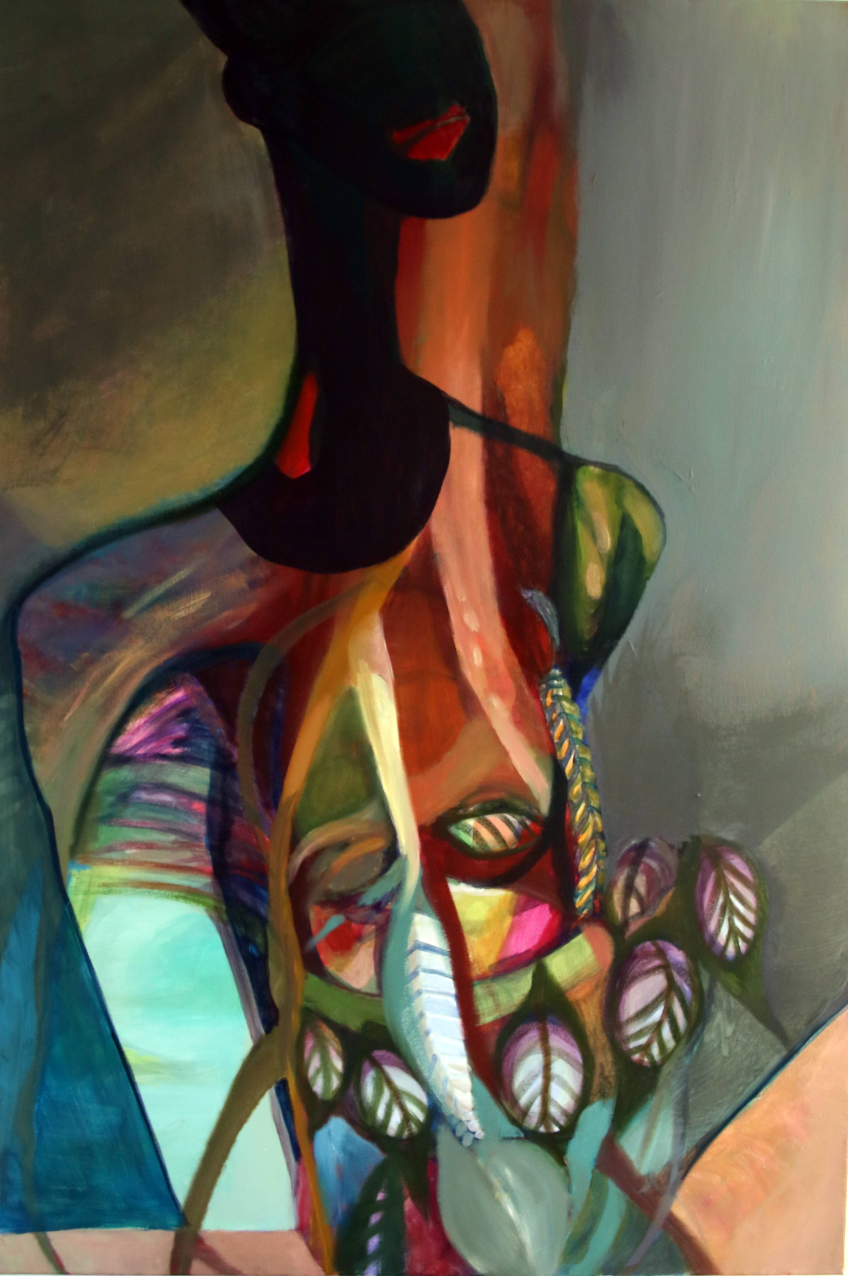 Rezygnacja z iluzji portretu na rzecz gry z symbolami. Figura kobieca rozpuszcza się w malarskich strzępach, jej twarz pozostaje nieostro zarysowana, a jej obecność — raczej domniemana niż przedstawiona. Kolorystyka — od zimnych błękitów po pulsujące złote i różowe tony — tworzy środowisko snu, podświadomego stanu, w którym ziemski świat przecina się z tym, co archetypiczne, niemal mitologiczne.Obecność psa nie jest tu przypadkowa ,to znaczący detal ktory otwiera nowe tropy i nie pozwala osunąć się w wygodny konsensus. Pies, tradycyjny towarzysz człowieka, staje się tu także przewodnikiem przez świat podświadomości — stróżem na granicy jawy i snu. Jego ciemna sylwetka kontrastuje z barwnym tłem, uwypuklając relację pomiędzy bezpieczeństwem a niepokojem.Obraz nie udziela łatwych odpowiedzi. Zostawia widza z pytaniami o tożsamość, pamięć, relację z naturą i zwierzęciem. Mamy do czynienia z wewnętrznym dialogiem ktory każe pytać, a nie afirmować.