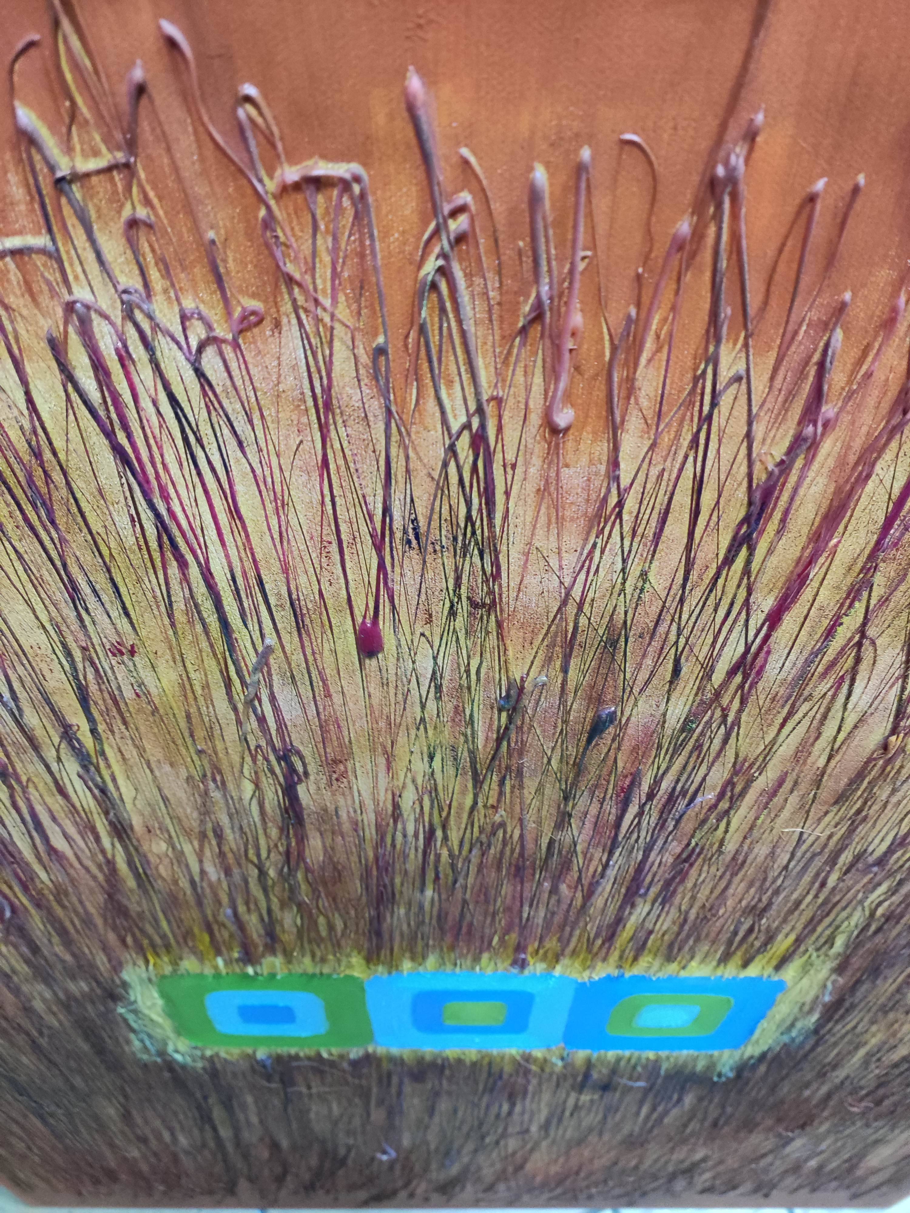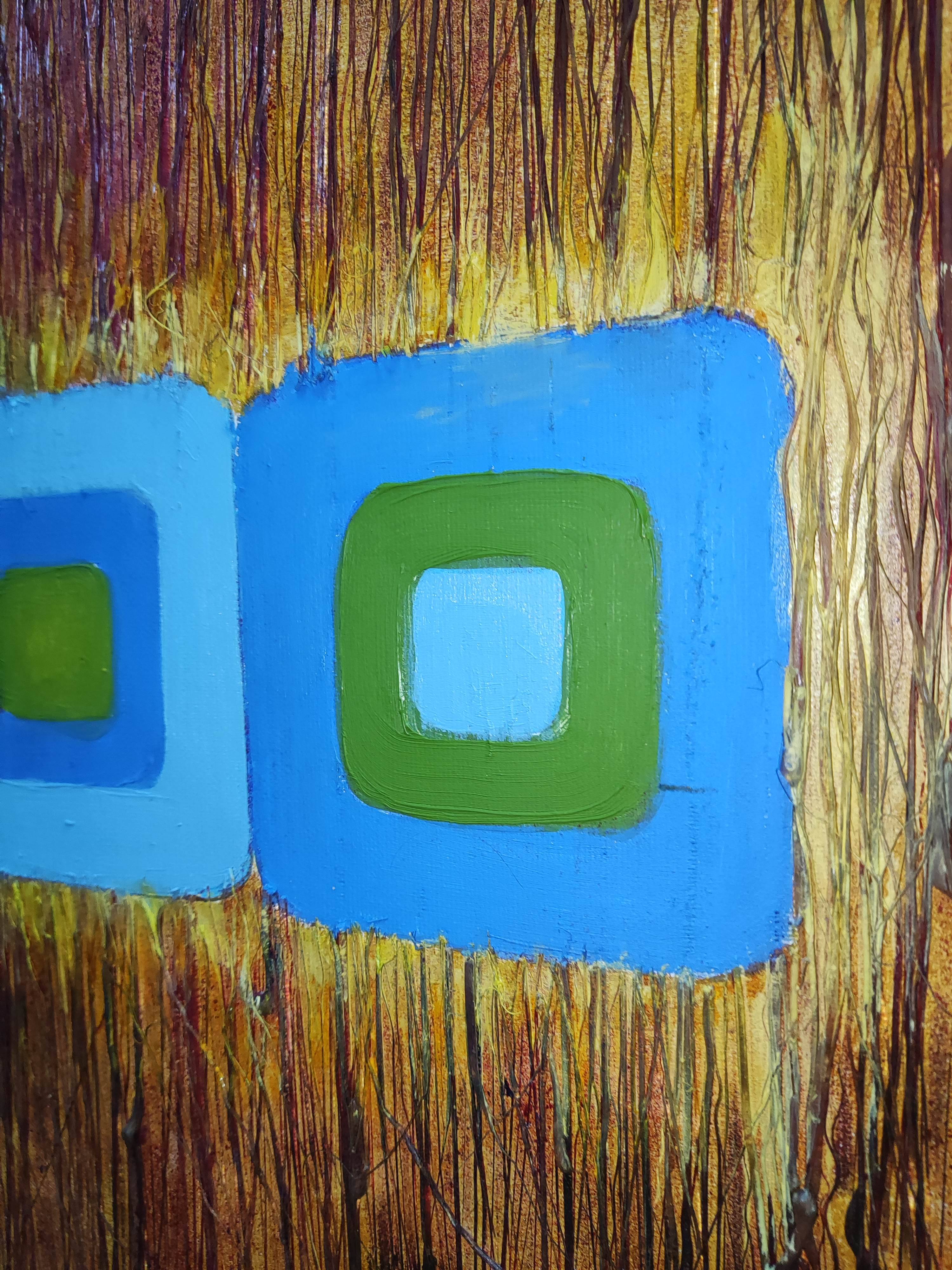 Centralna część obrazu przyciąga uwagę kwadratami wykonanymi w technice ceramiki o lśniącej powierzchni w kolorach błękitu, zieleni, przez co kompozycja nabiera dynamiki, mimo że sama w sobie jest statyczna. Efekt ruchu uzyskano dzięki fakturze, która subtelnie drga, oraz ciepłej kolorystyce, która emanuje energią.