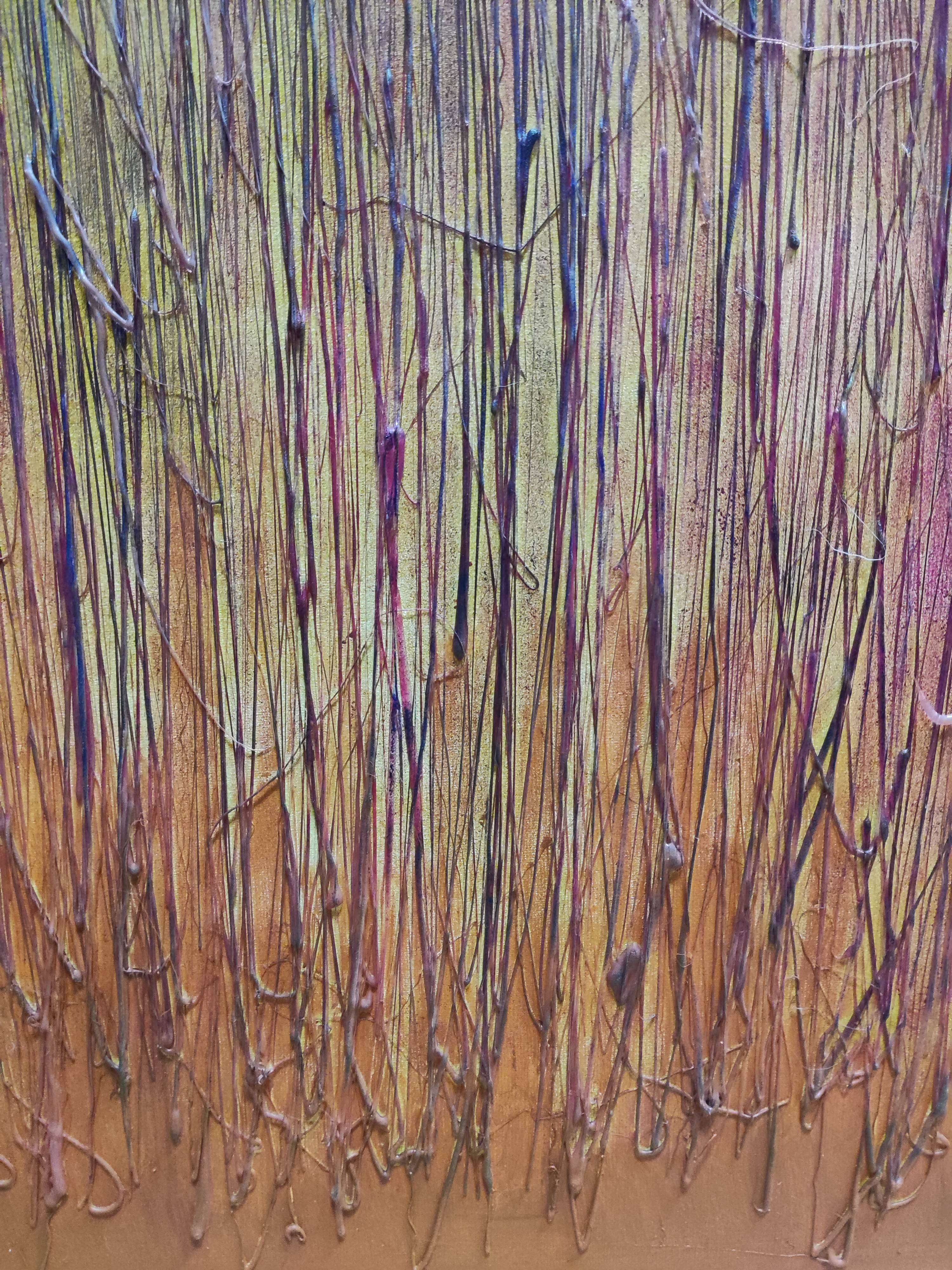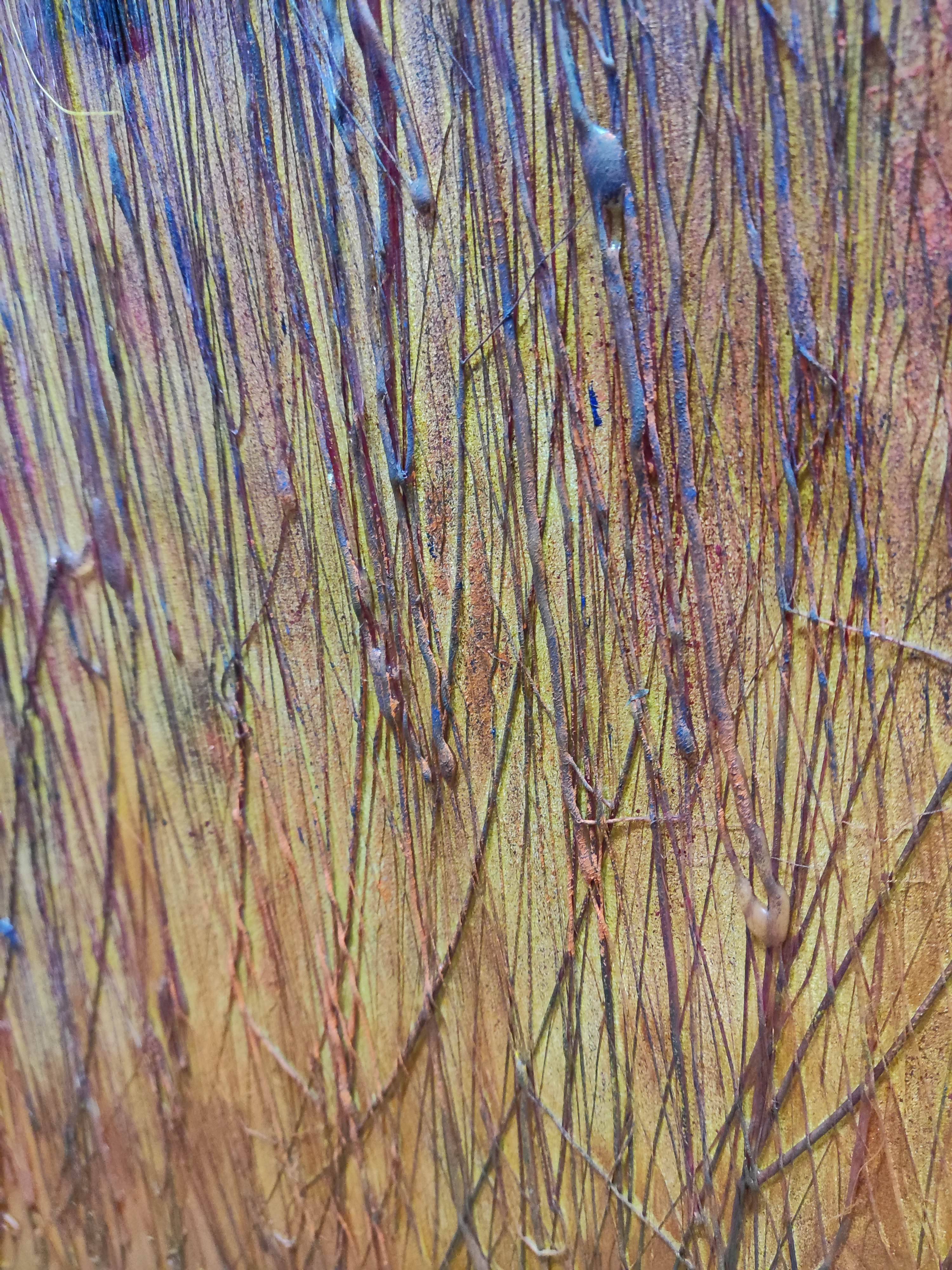 "Trzy" to abstrakcyjny obraz, który wyróżnia się swoją bogatą fakturą i ciepłymi kolorami. Malowany warstwowo, prezentuje złożoną strukturę, która dodaje głębi i trójwymiarowości. Na dużej powierzchni obrazu faktura jest wyjątkowo bogata, co przy odpowiednim podświetleniu sprawia, że obraz wydaje się migotać, tworząc tajemniczą atmosferę.
