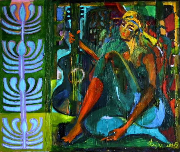 Trudno jest malarzowi zilustrować dźwięki. Pomyślałam, żeby przedstawić je za pomocą kształtów, rytmów, harmonii kolorów. Charakter muzyki można oddać miękkością kształtów i powtórzyć w krągłościach gitary a także w roślinie, która jest współbohaterką obrazu. W obrazie, czego aparat fotograficzny nie jest w stanie przekazać, jest wyszukana na palecie niezliczona ilość odcieni zieleni i błękitu