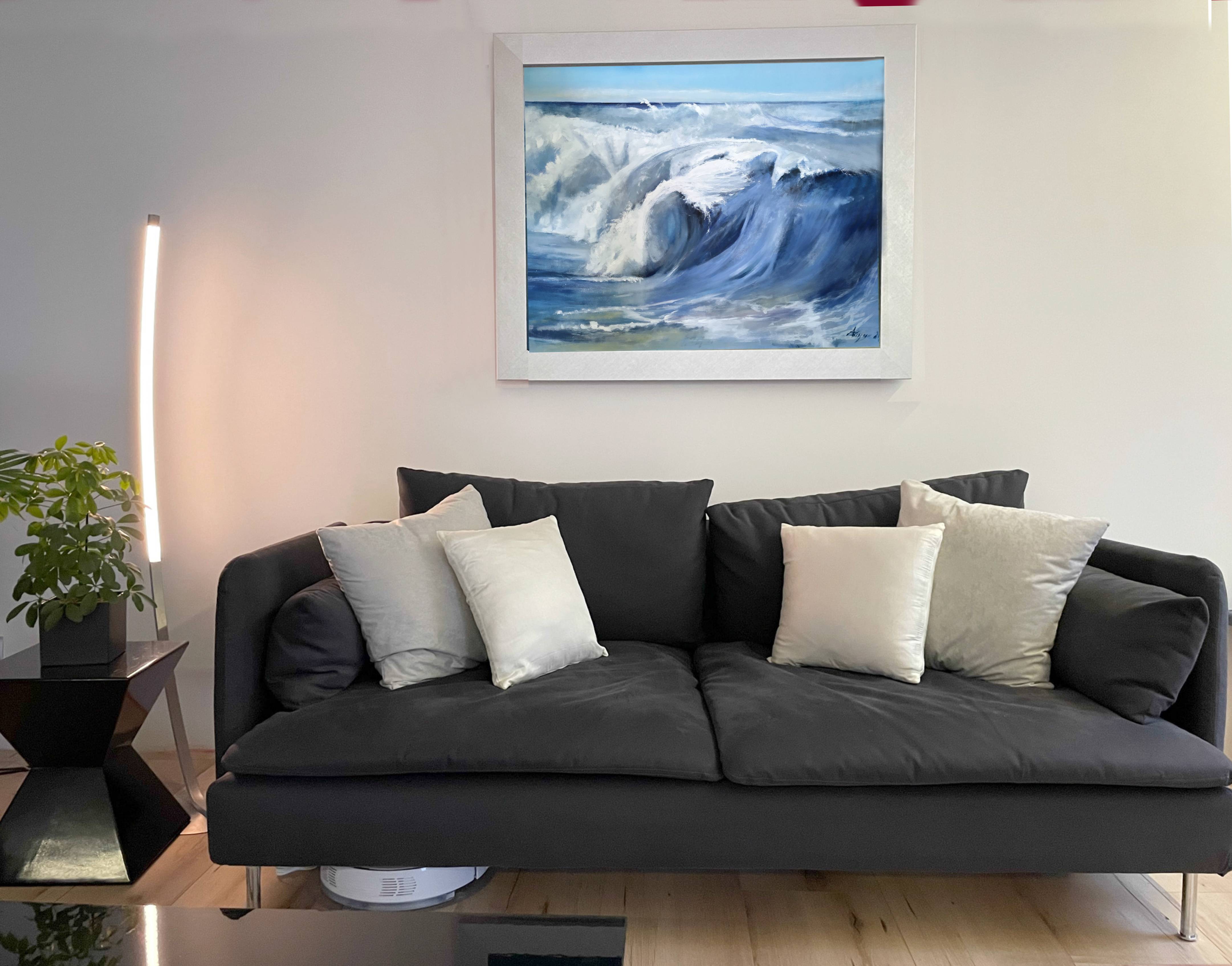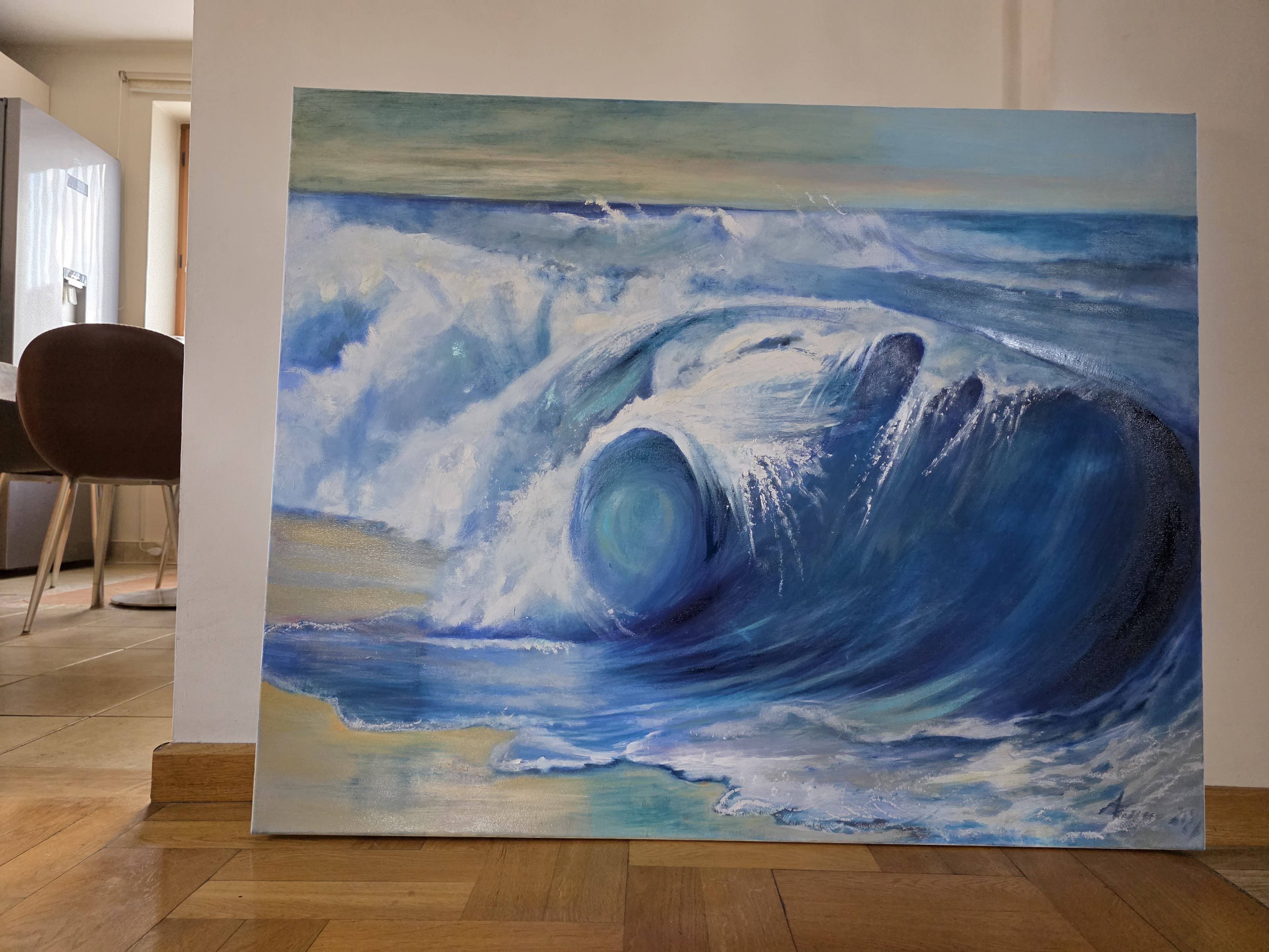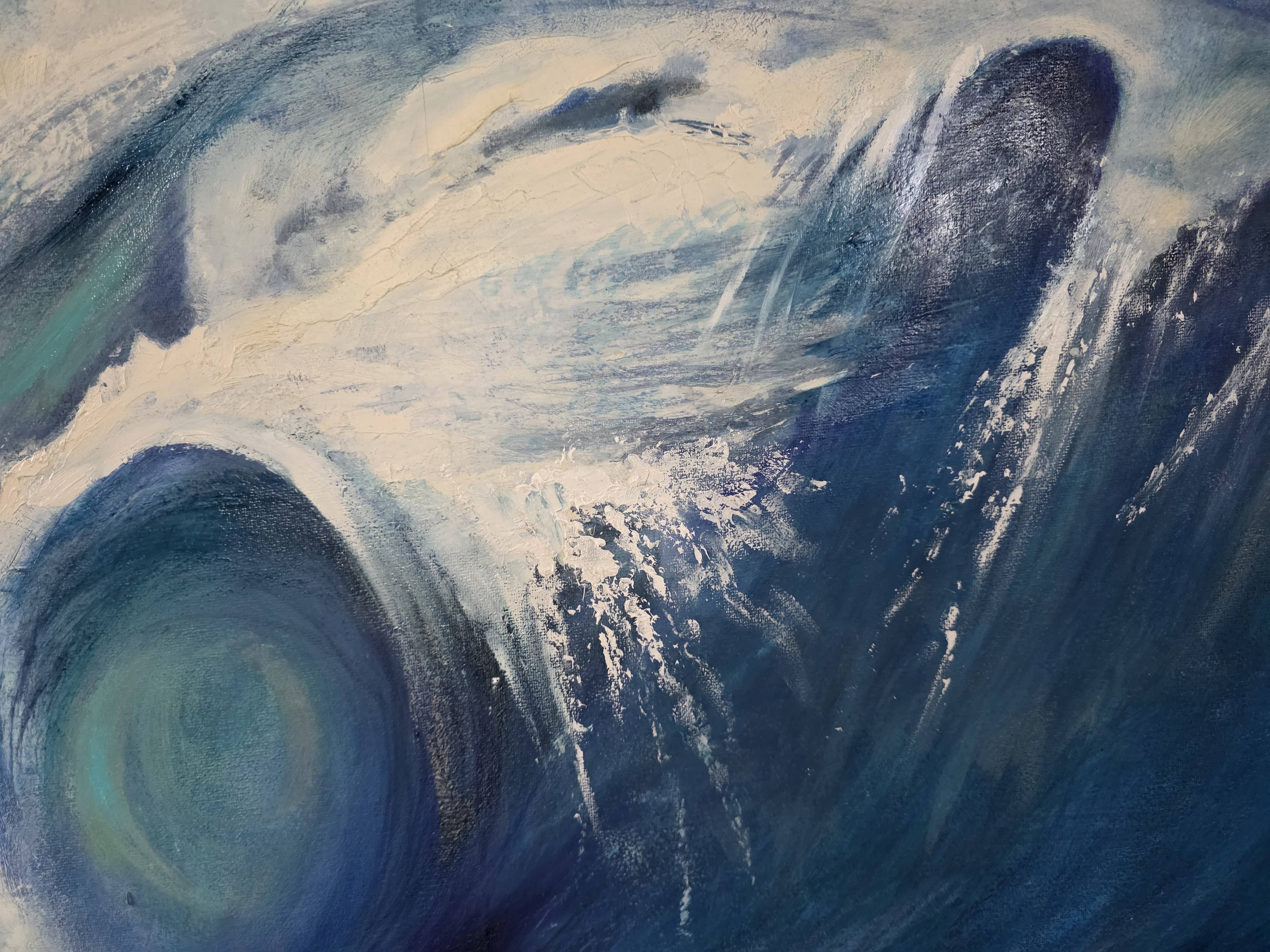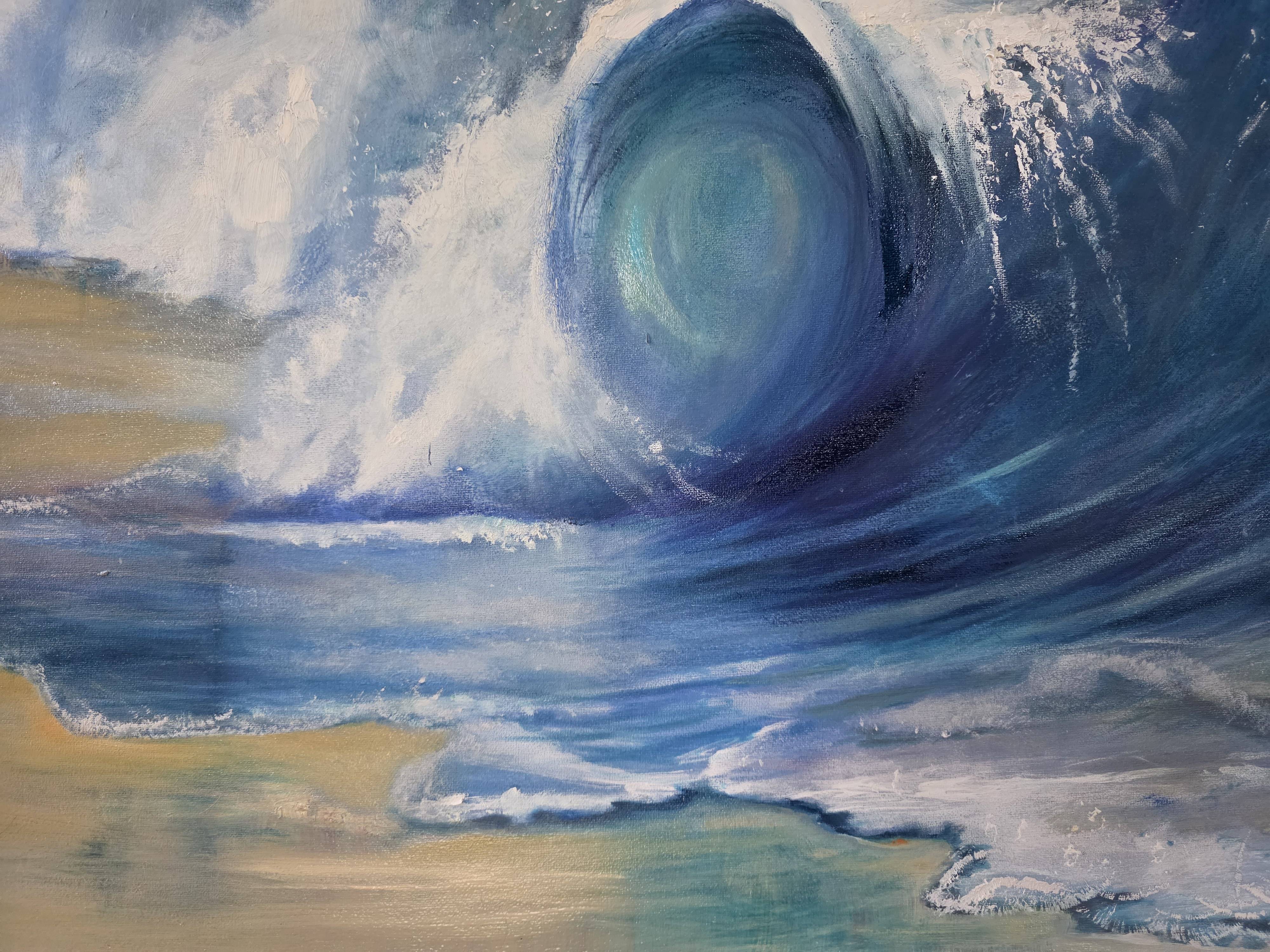 Obraz "W sercu fali" to dynamiczna kompozycja, która zatrzymuje w kadrze chwilę, gdy olbrzymia fala osiąga swój punkt kulminacyjny, zakręcając się w potężnym wirze wody. Grubo nakładana farba, tworząca wyraźną fakturę, nadaje dziełu trójwymiarowości, sprawiając, że oglądający niemal czuje bryzę i chłód morskiej wody. Kolory błękitu, od głębokich granatów po jasne turkusy, harmonijnie przeplatają się z delikatnymi beżami, które sugerują światło słońca przenikające przez wodną ścianę.