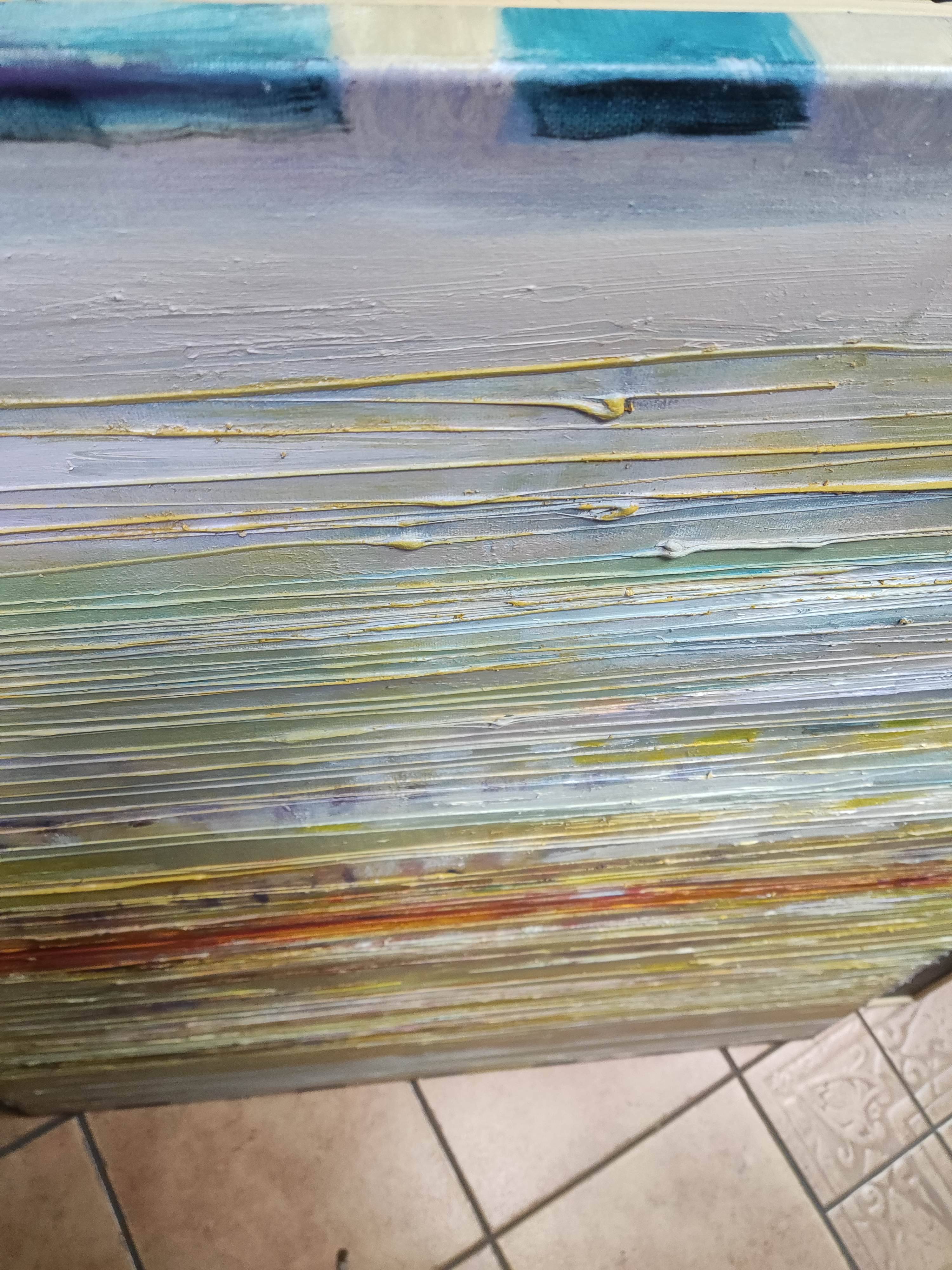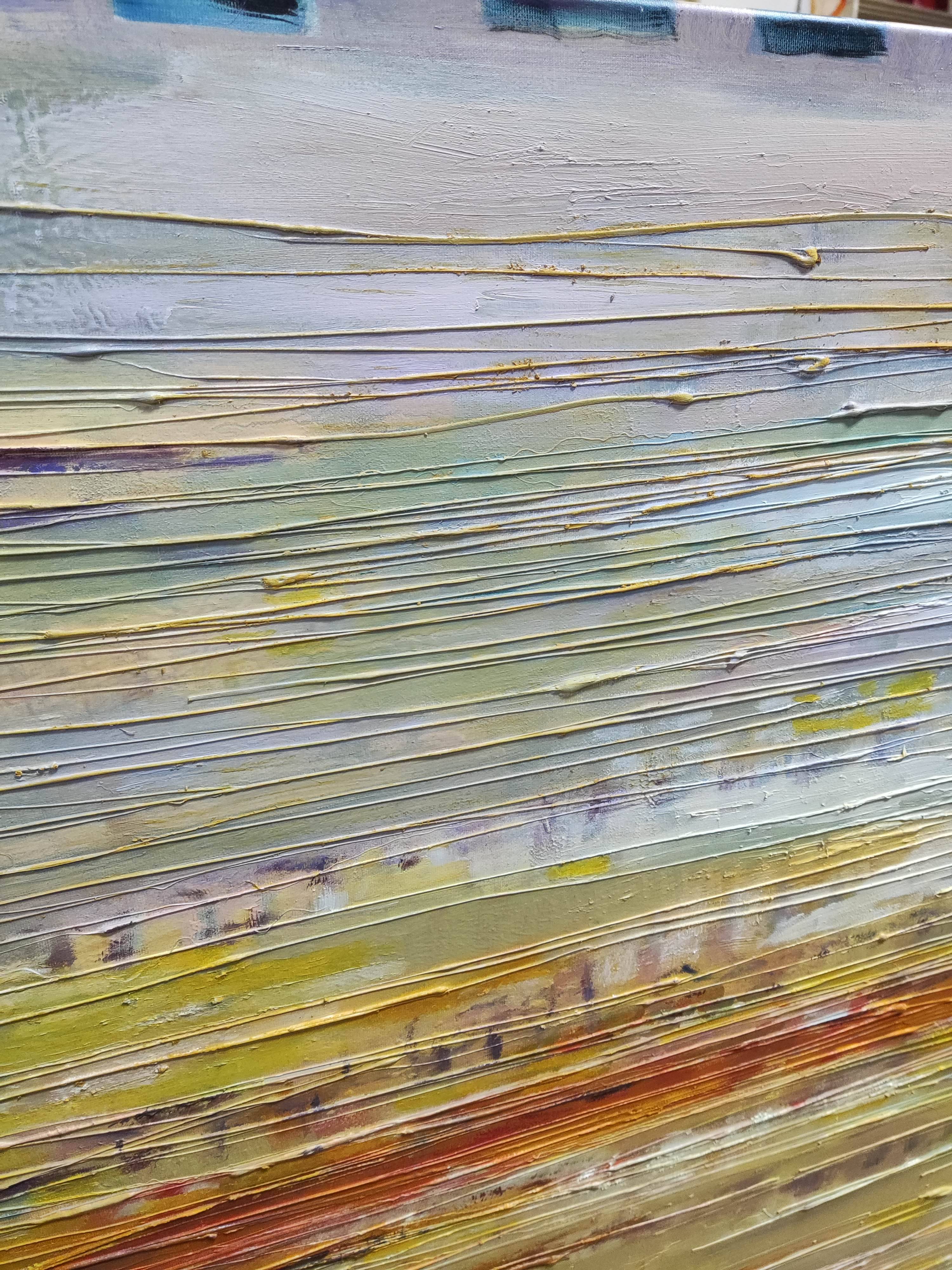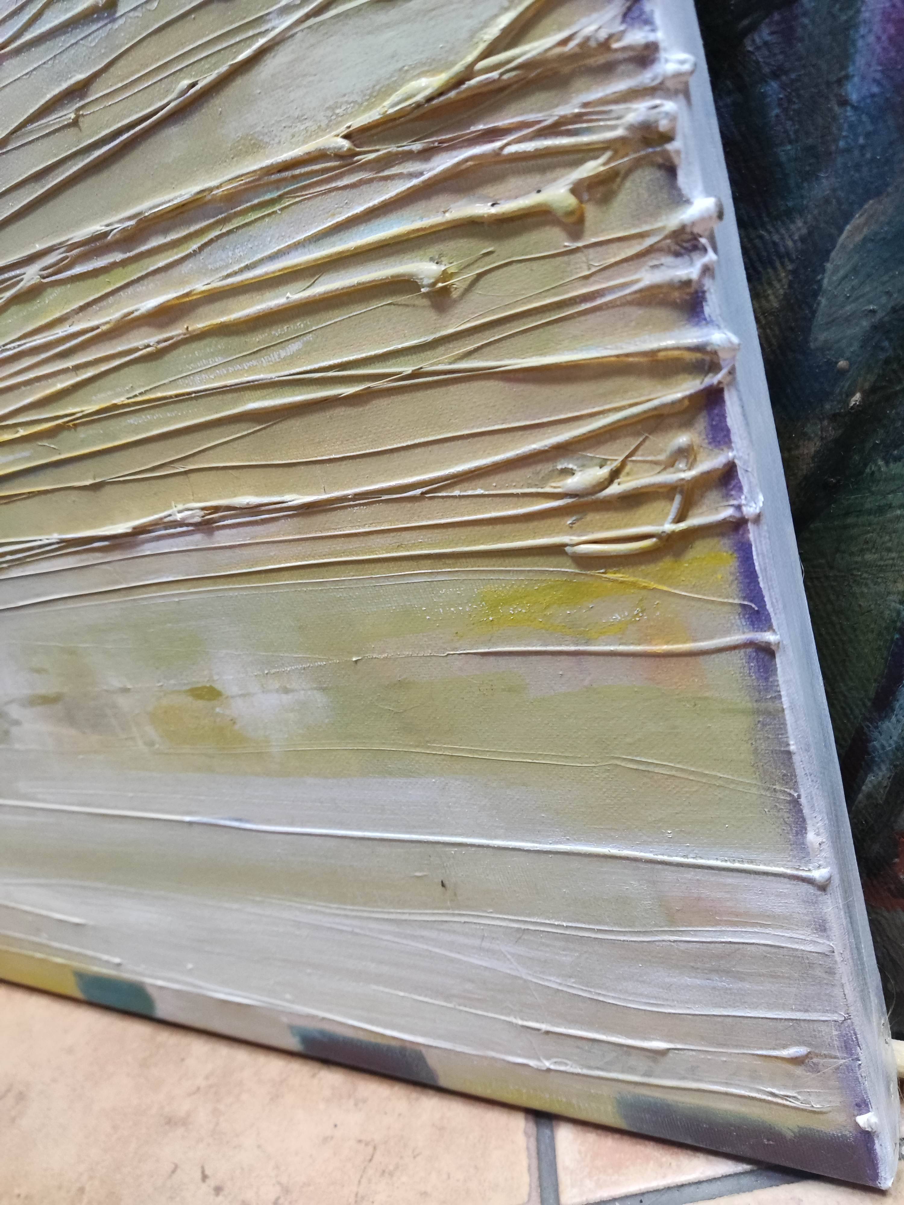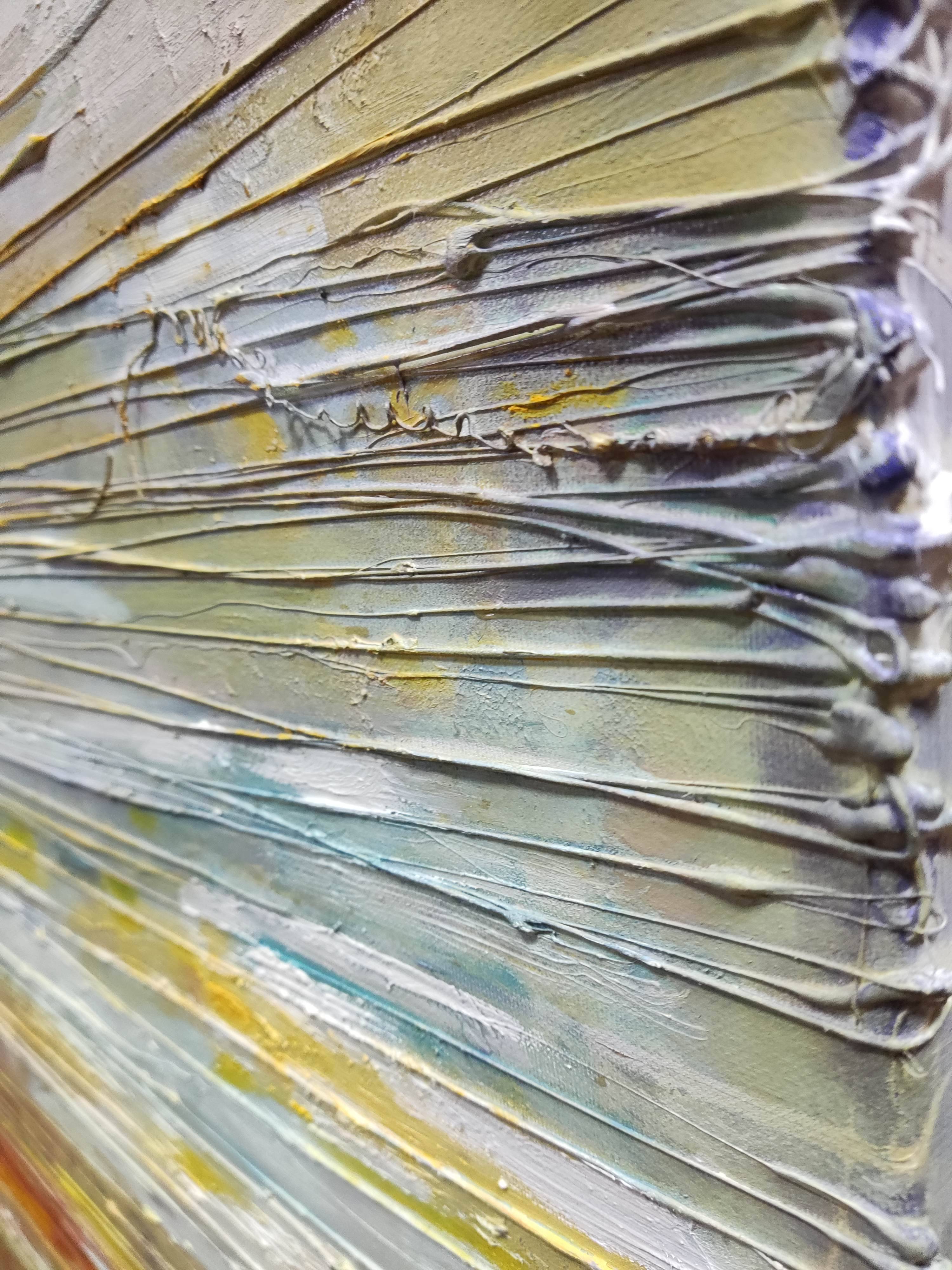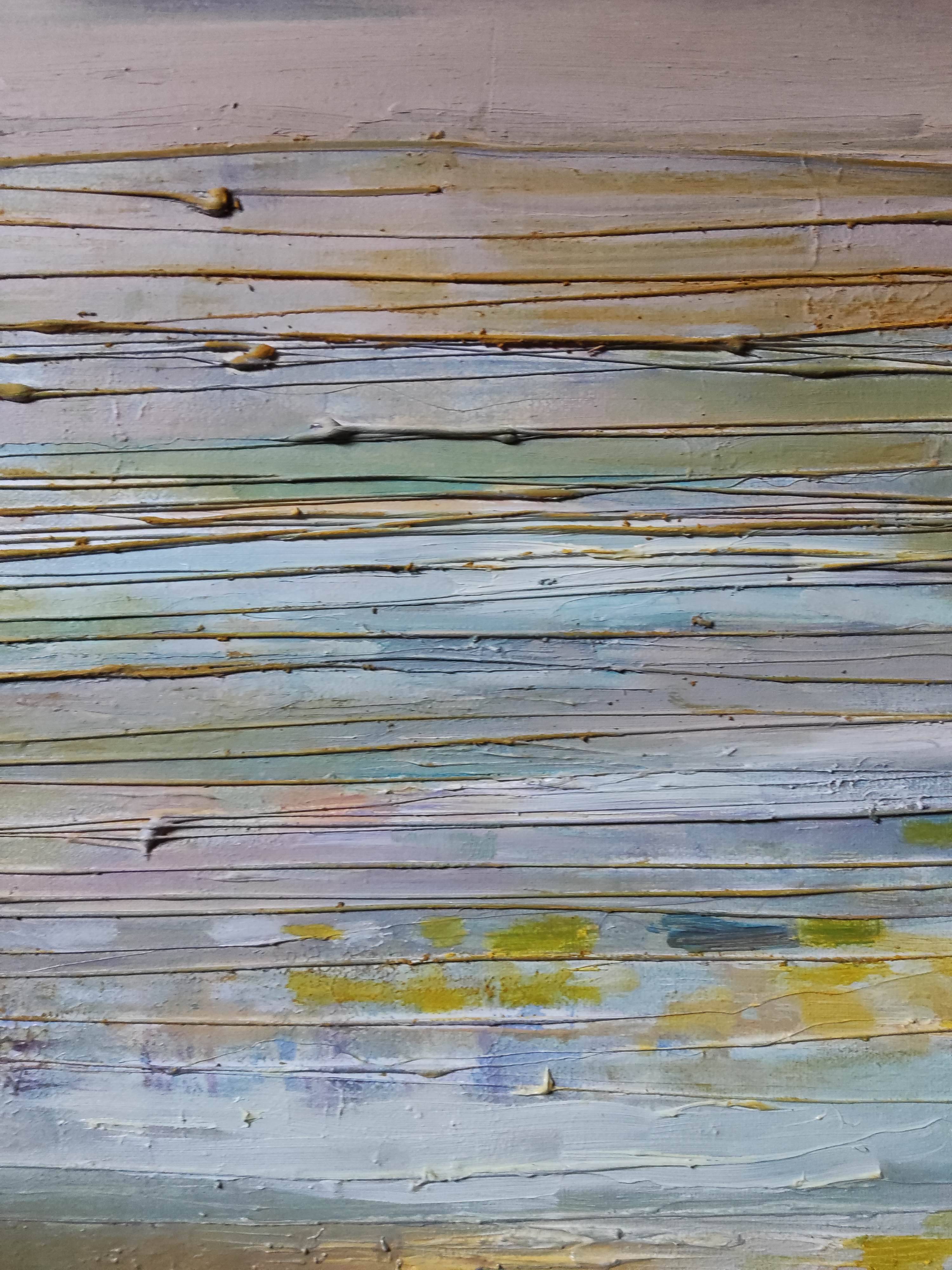 Obraz "Wspomnienia" to abstrakcyjna kompozycja, która emanuje ciepłem i delikatnością pastelowych kolorów. Obraz cechuje wyraźna faktura, rozciągająca się wzdłuż całego płótna, osiągnięta dzięki unikalnej technice artysty. Ta faktura dodaje głębi, sprawiając, że barwy zdają się migotać i tworzyć trójwymiarowy efekt.