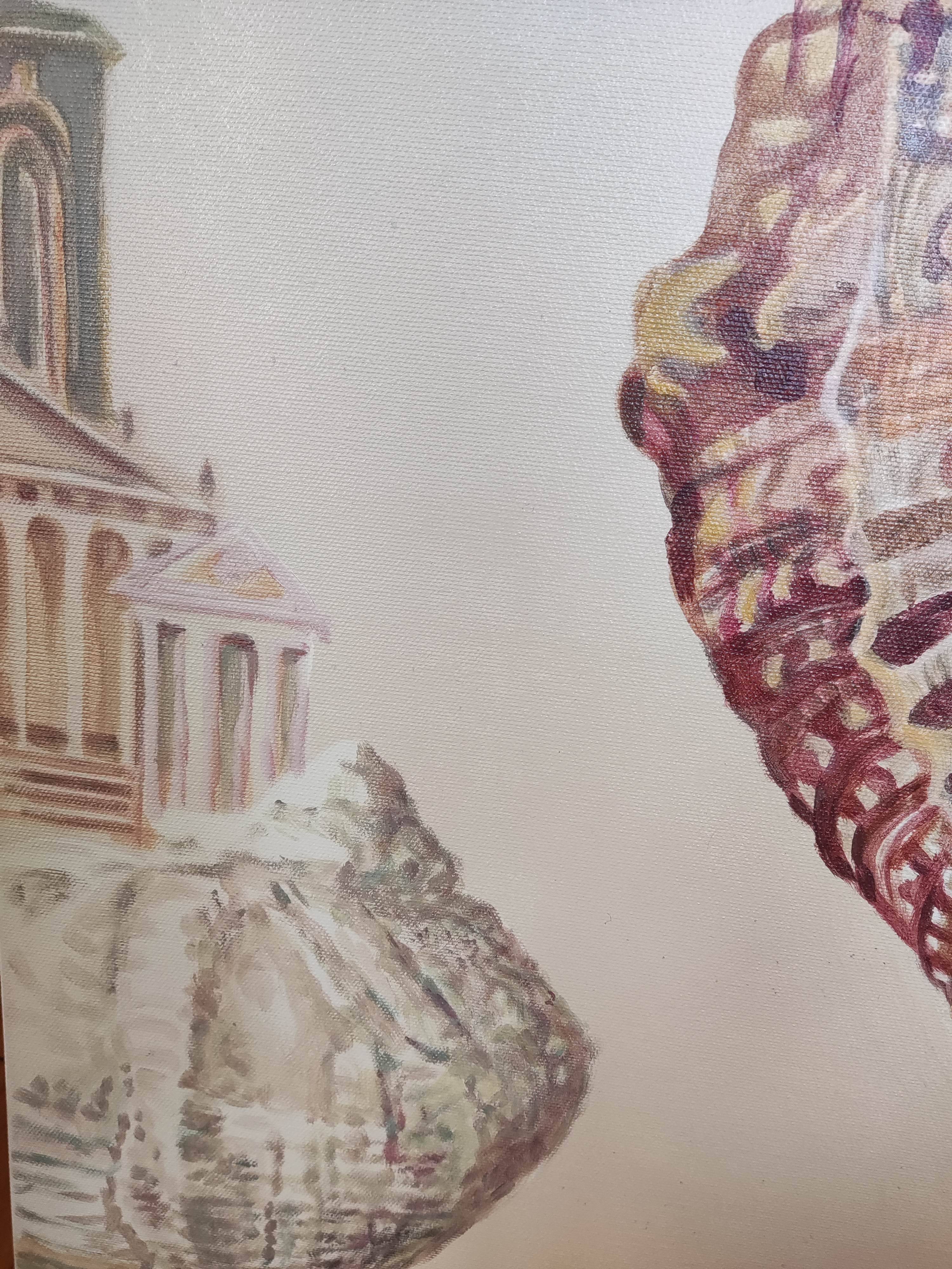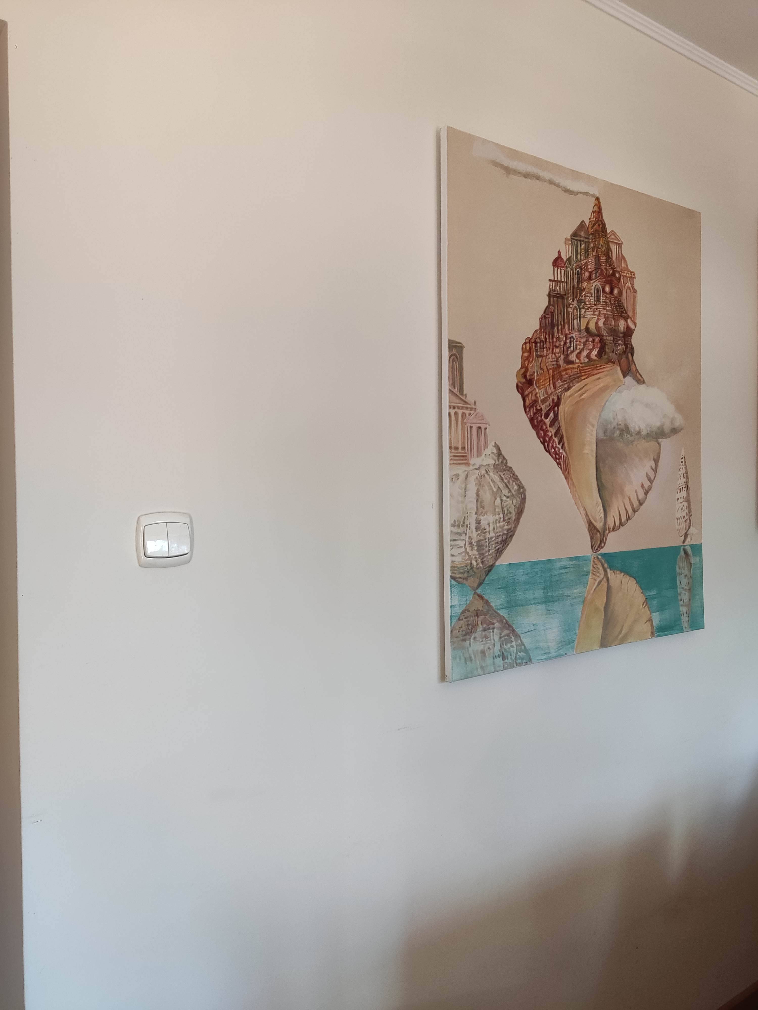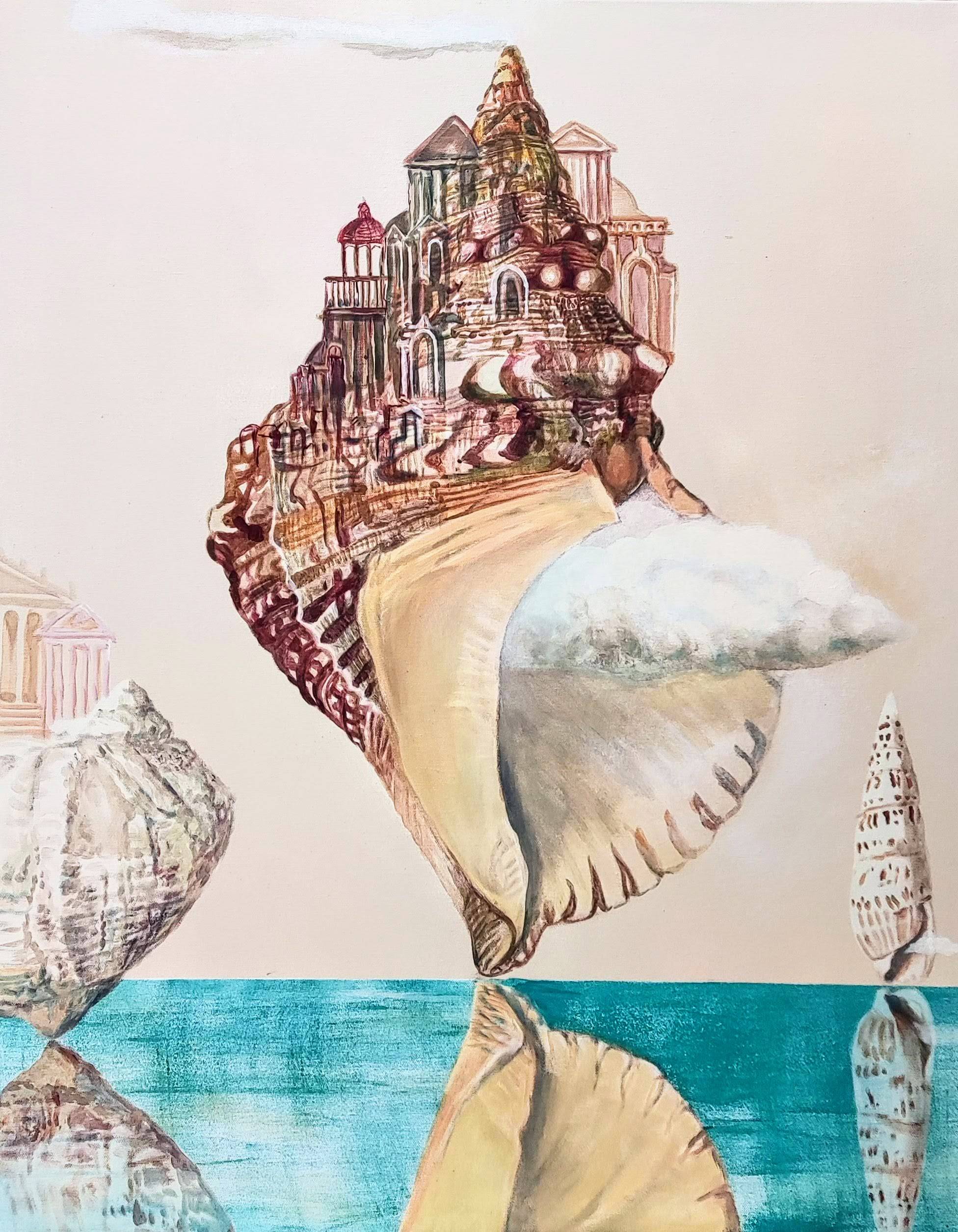 Muszla, w swoim pionowym ustawieniu, przekształca się w coś na kształt architektonicznej struktury, domu lub wieży. W tle inne muszle, podobne do niej, sterczą na horyzoncie jak surrealistyczne budowle, tworząc pejzaż pełen symboliki. Krajobraz ten emanuje atmosferą przemiany i odrodzenia.