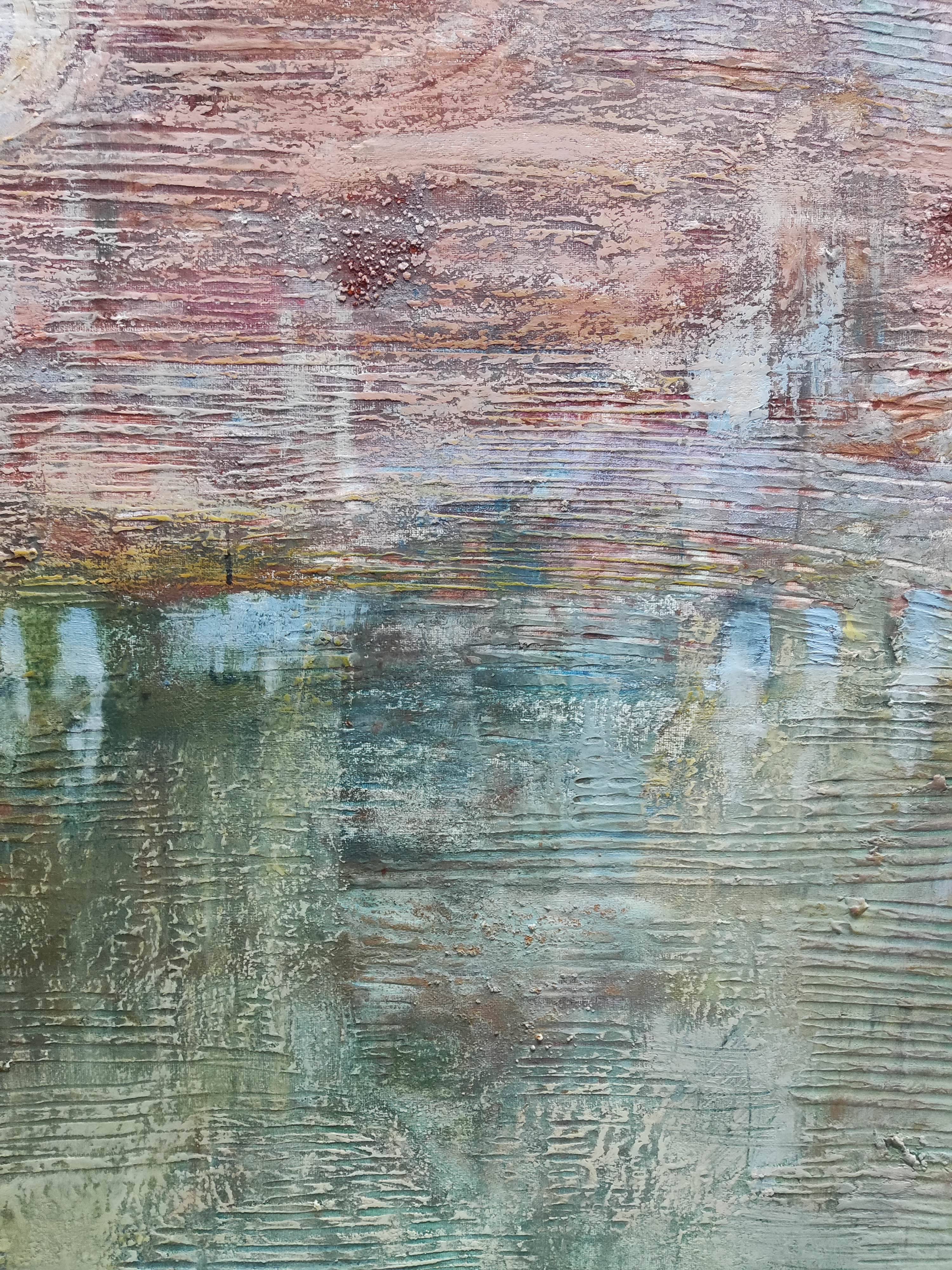 Dominującym elementem kompozycji jest ląd w kolorach różu, który wydaje się niemal unoszący nad powierzchnią obrazu. Ten różowy ląd, choć abstrakcyjny, emanuje ciepłem i delikatnością, kontrastując z otaczającym go błękitem nieba i wody. Wyraźna faktura obrazu podkreśla materialność farby, a jednocześnie dodaje głębi i złożoności.